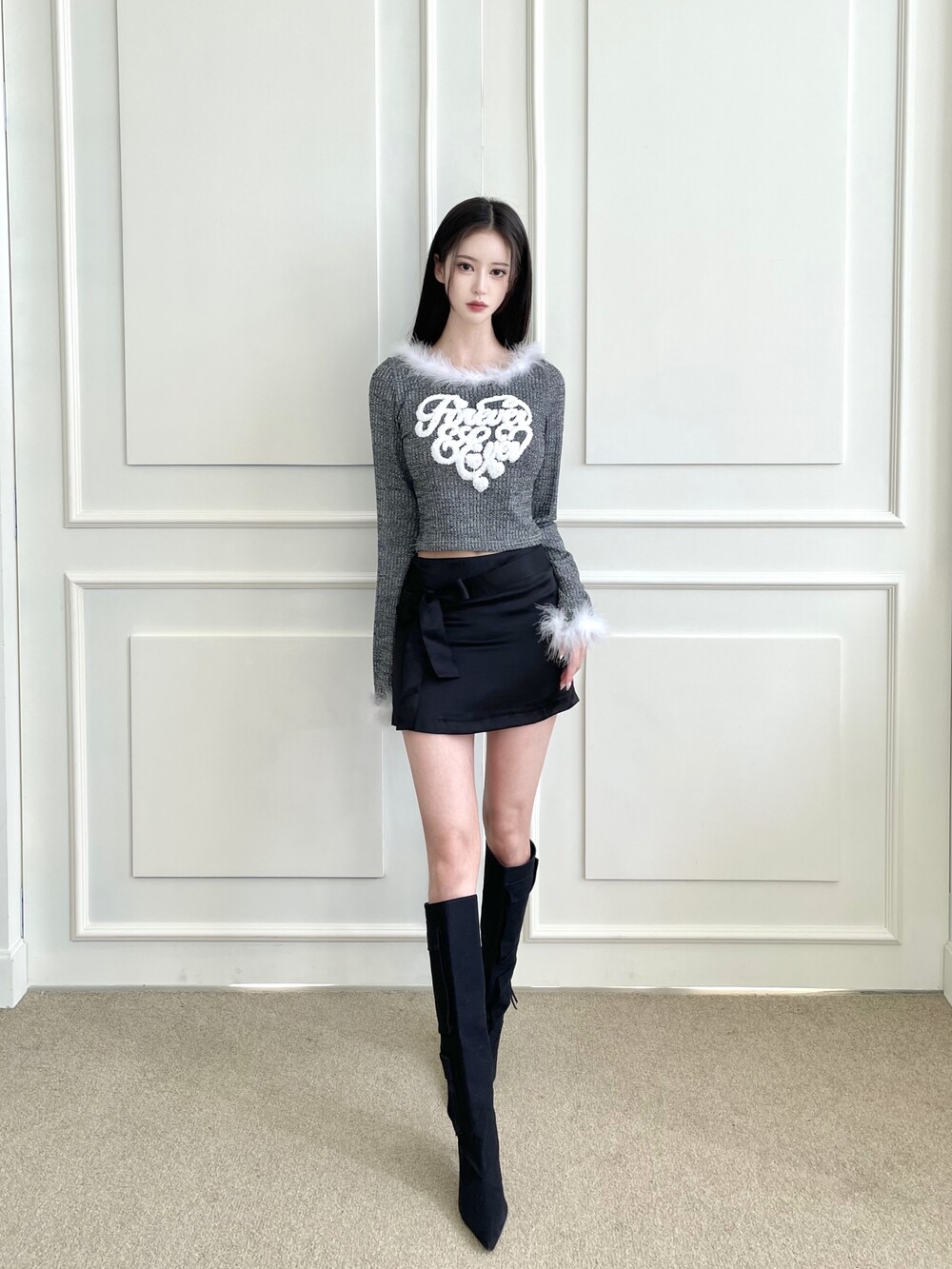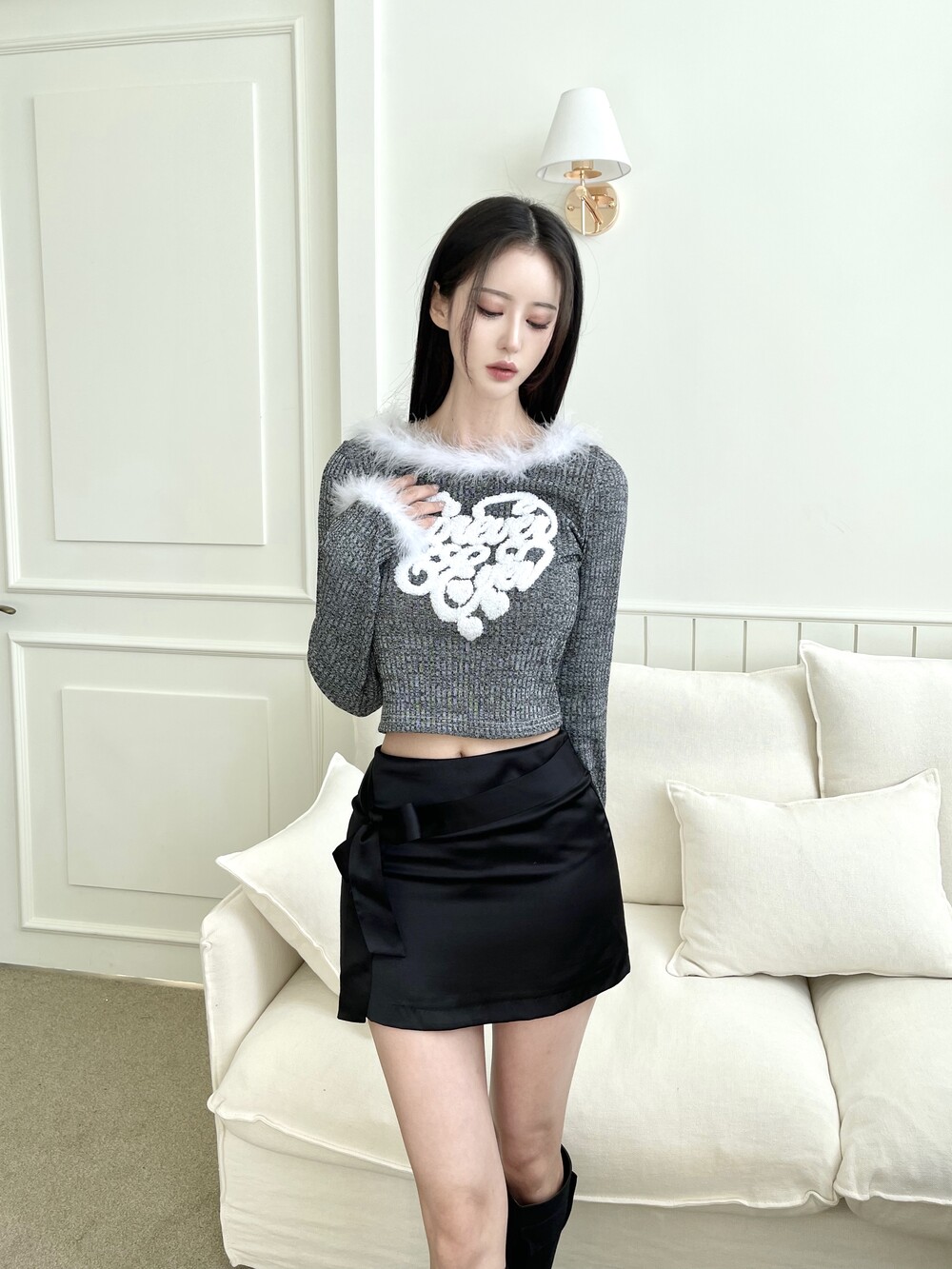 퍼 트리밍 레터링 하트 크롭 니트