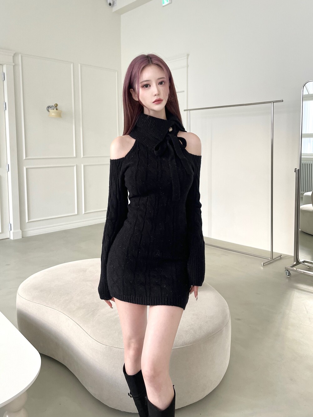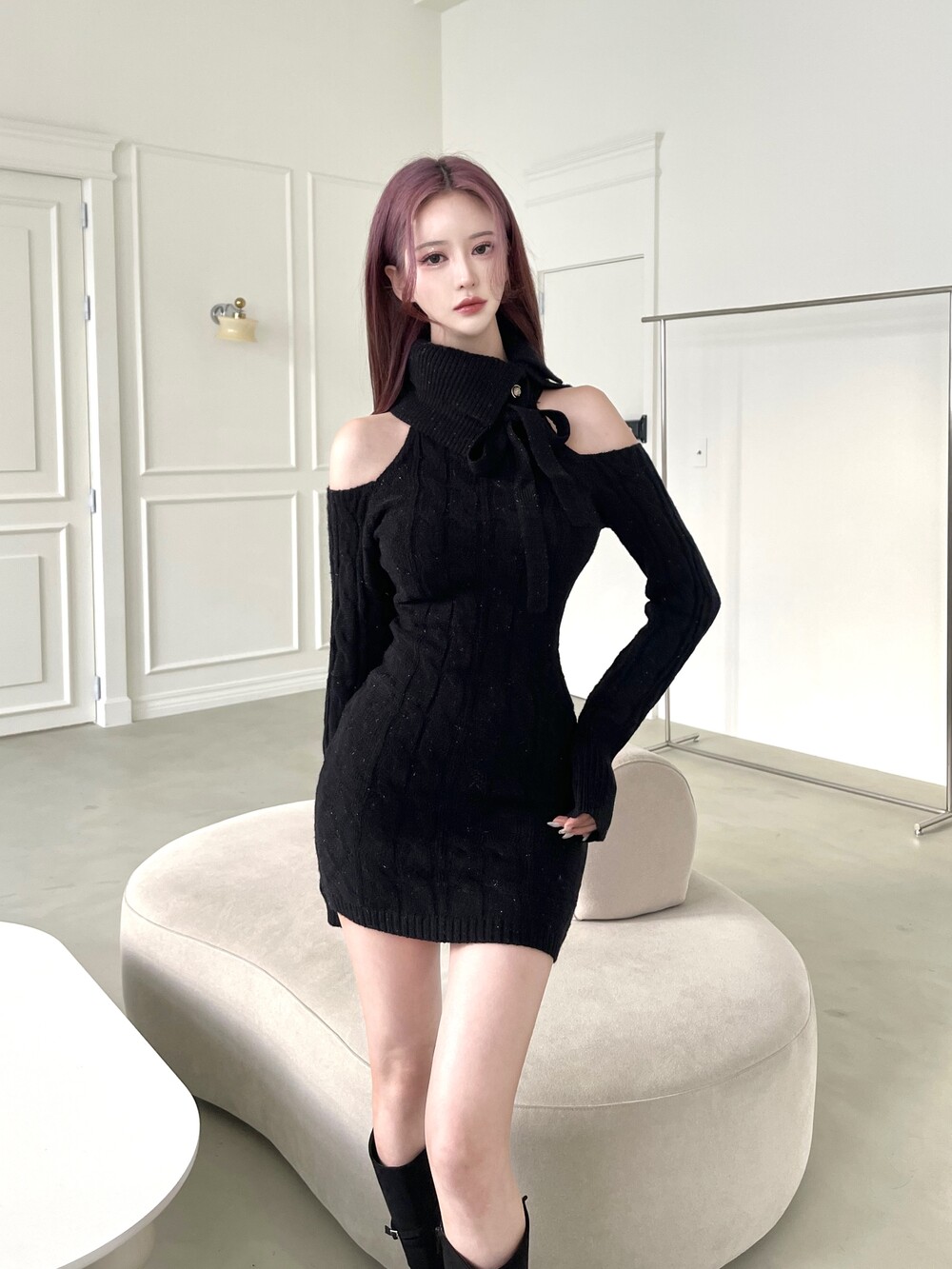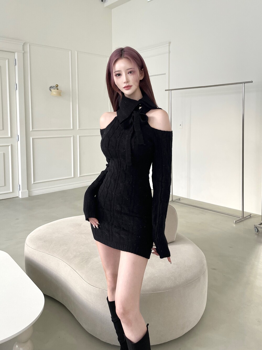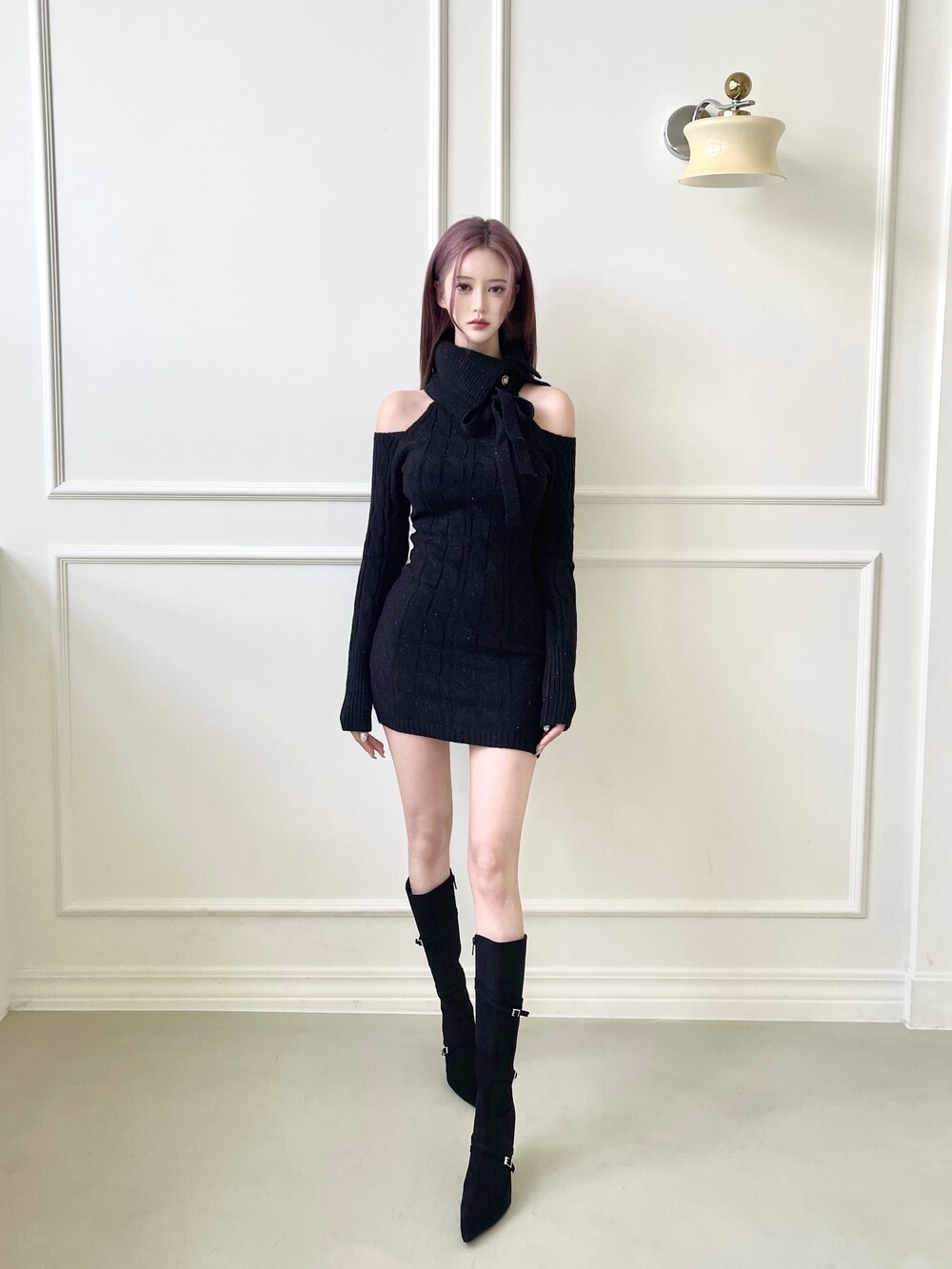 글리터 니트 카라 오프숄더 리본 미니 원피스