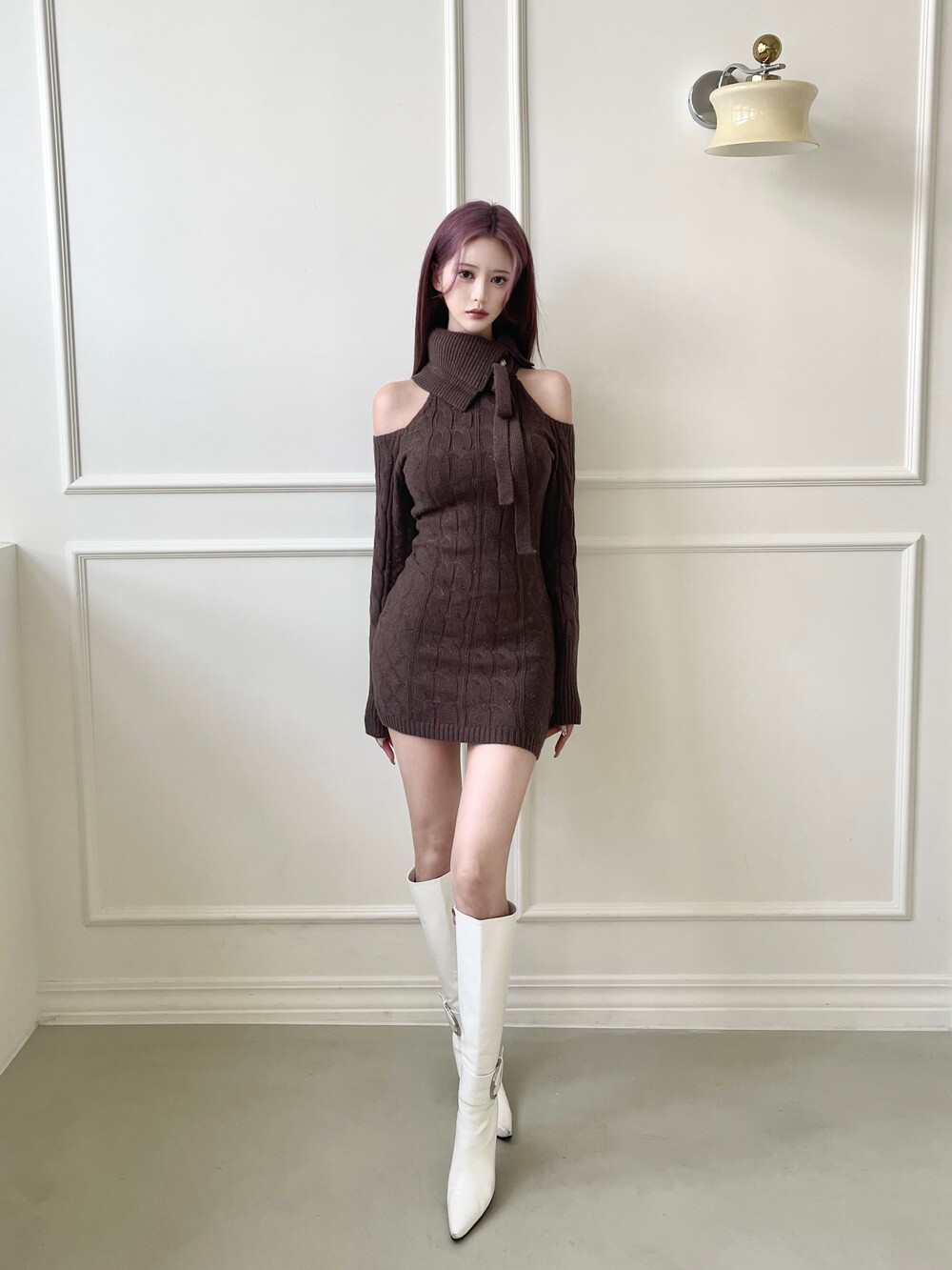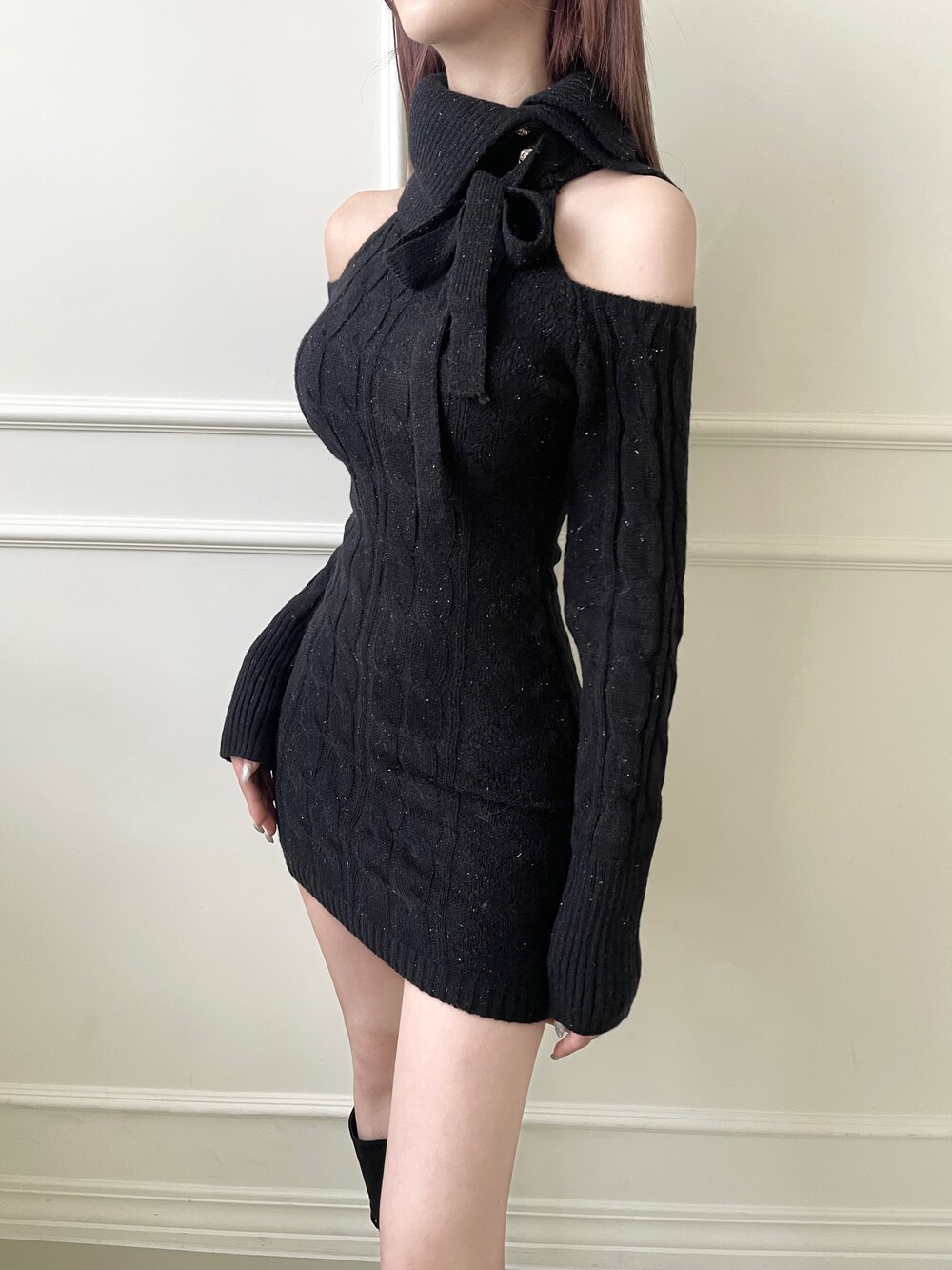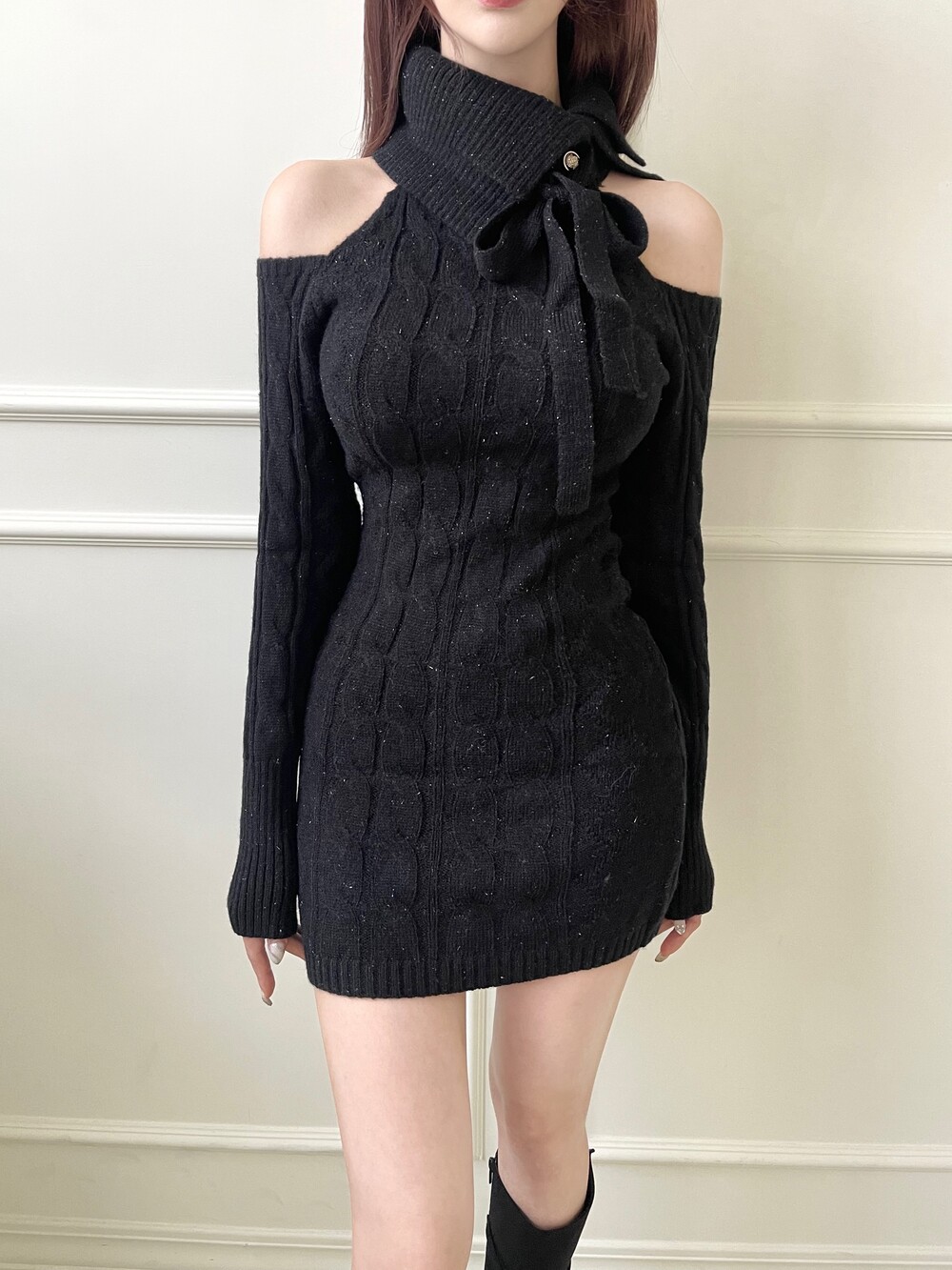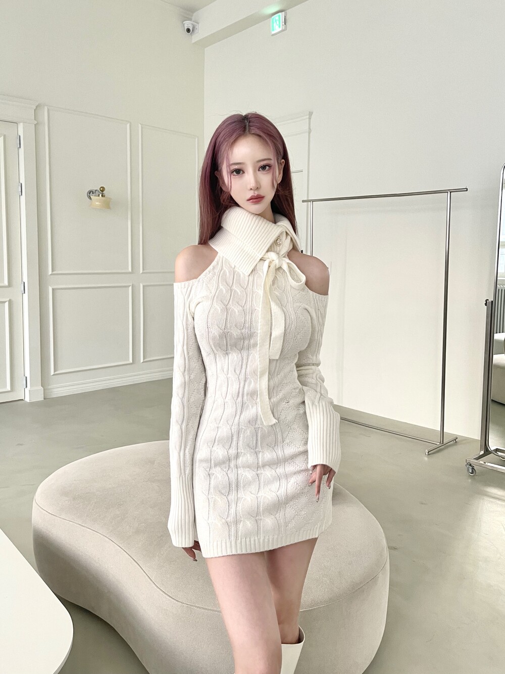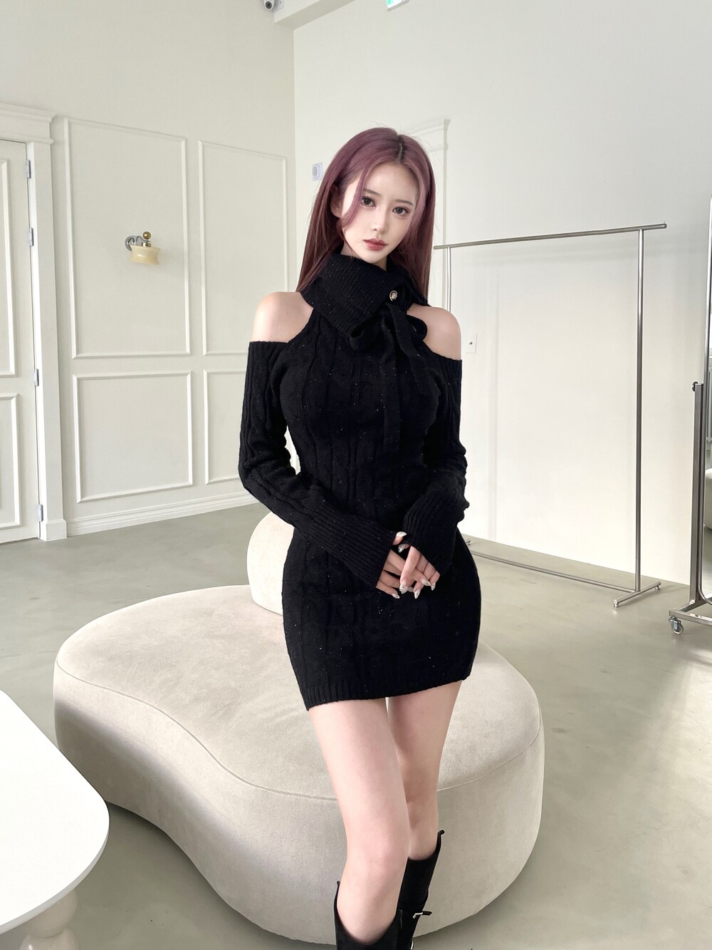 글리터 니트 카라 오프숄더 리본 미니 원피스