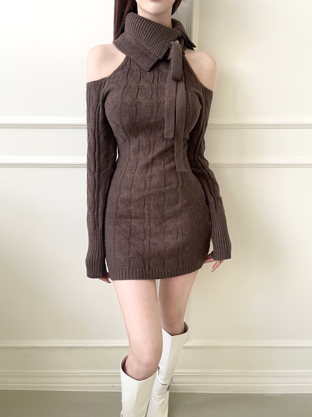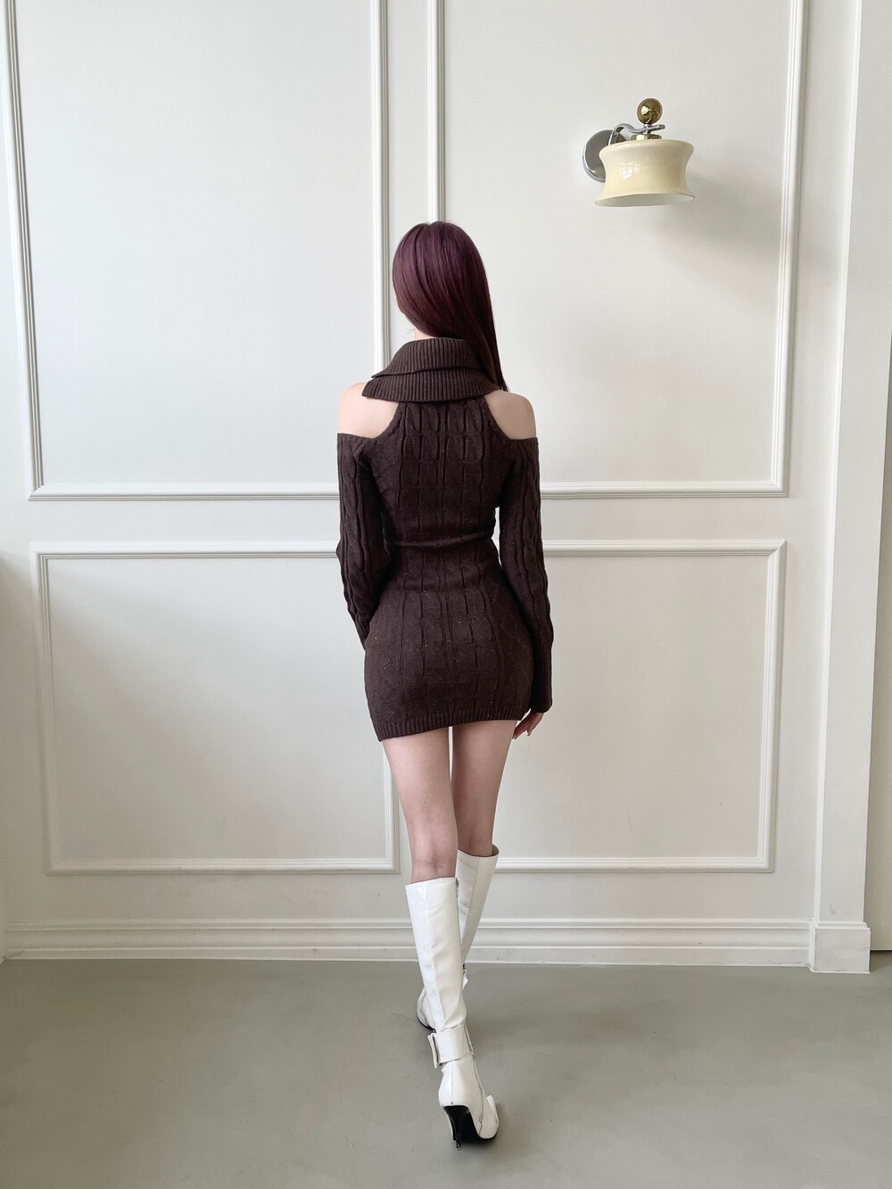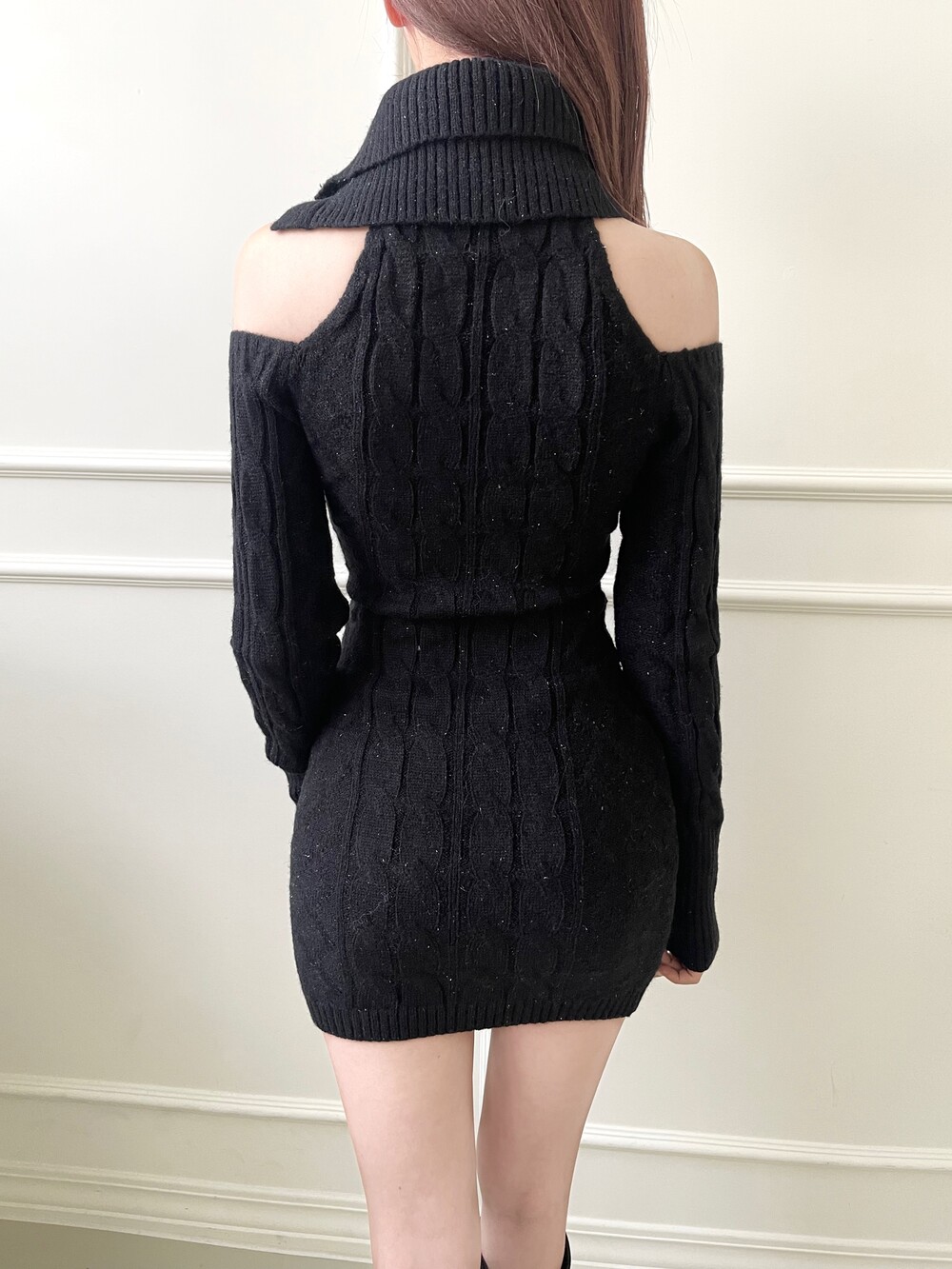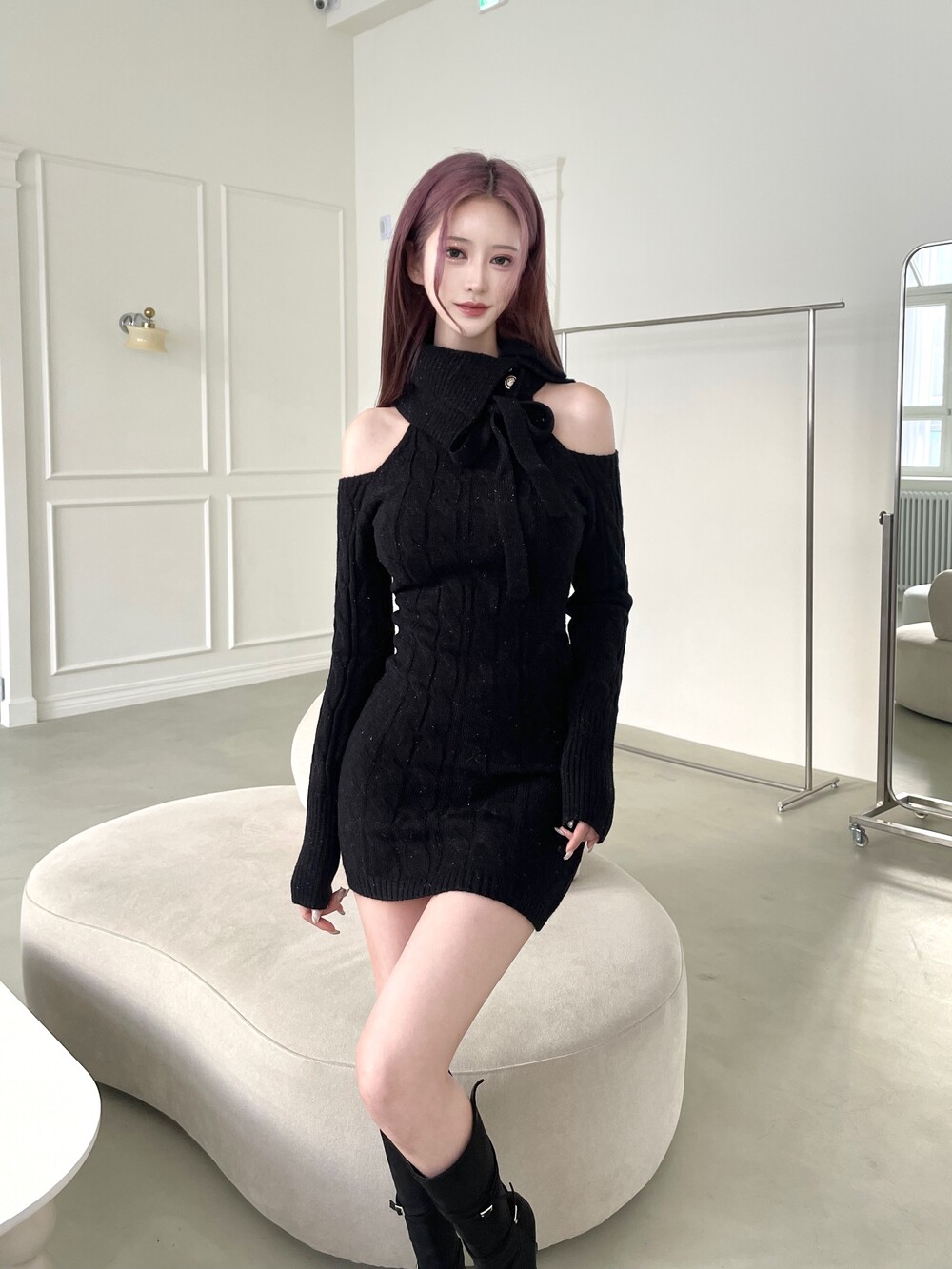 글리터 니트 카라 오프숄더 리본 미니 원피스