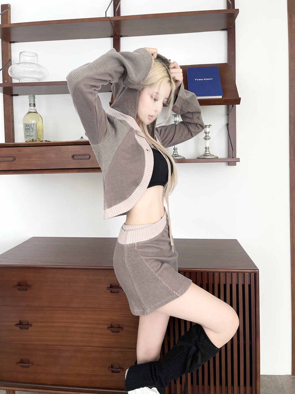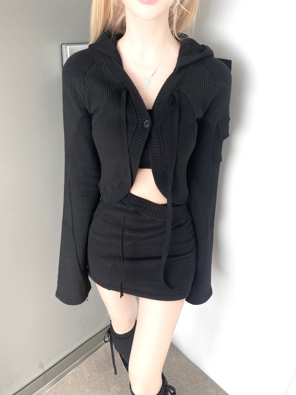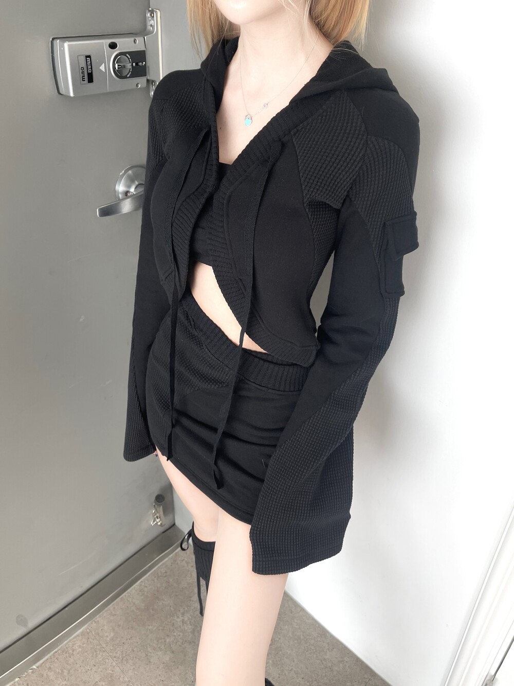 패치워크 피그먼트 카고 볼레로 후드 가디건