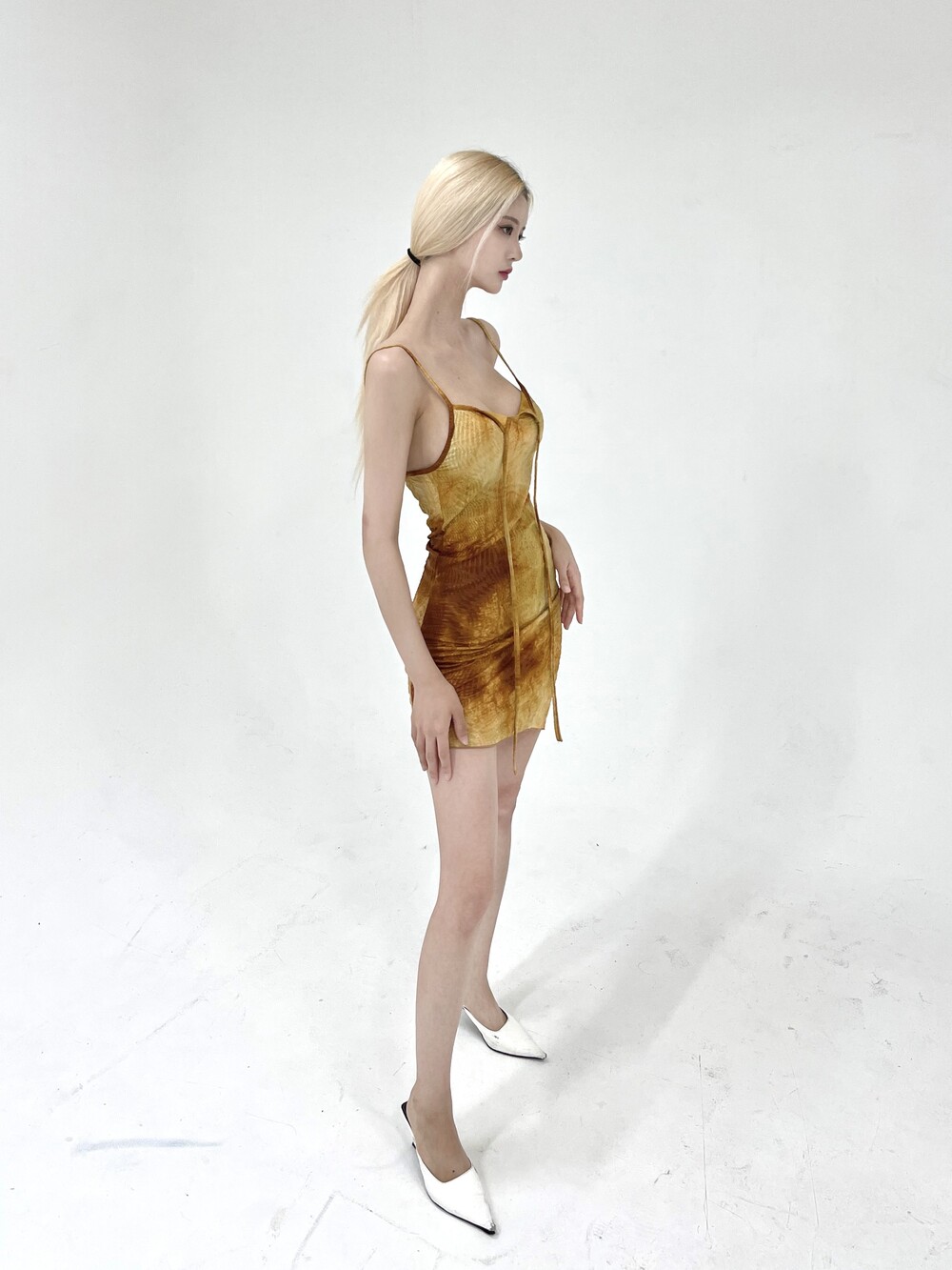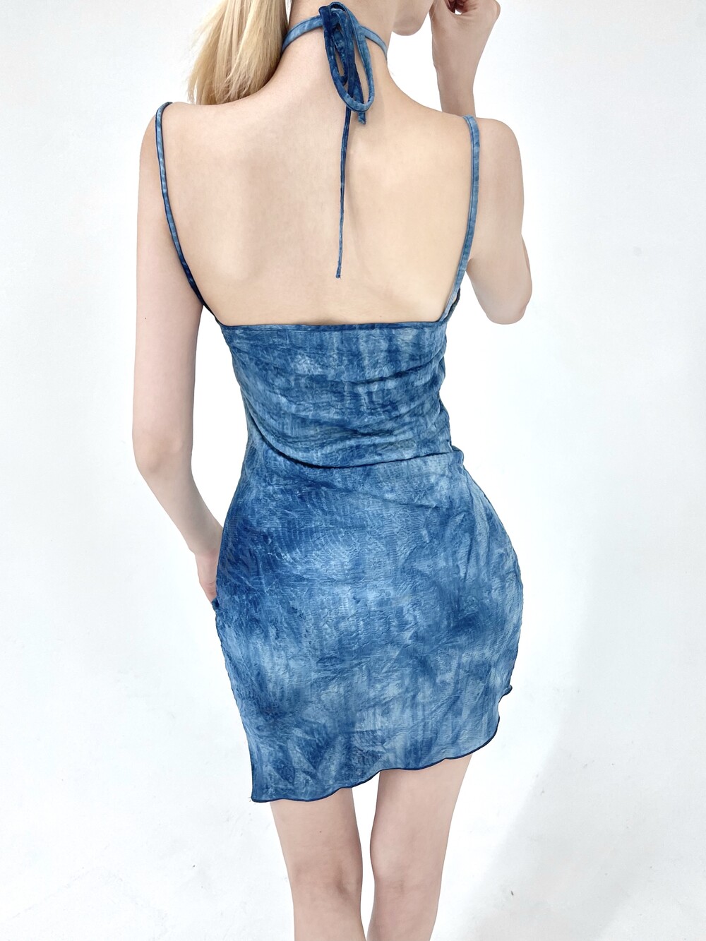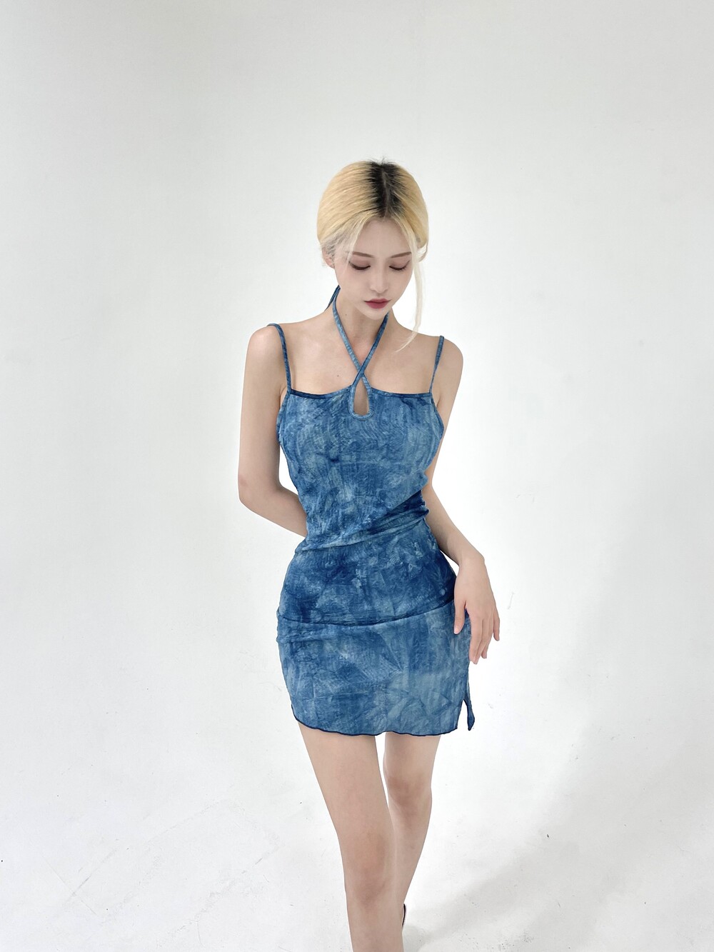타이다이 홀터 스트랩 언발 슬릿 미니 원피스