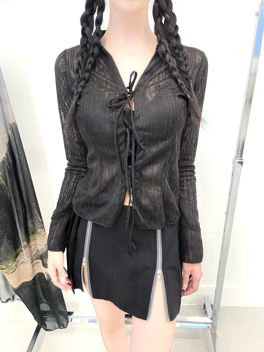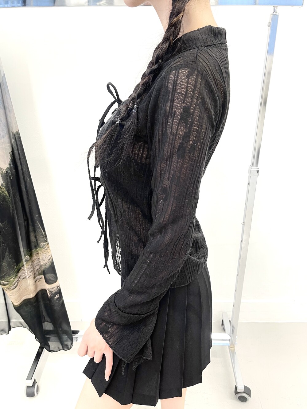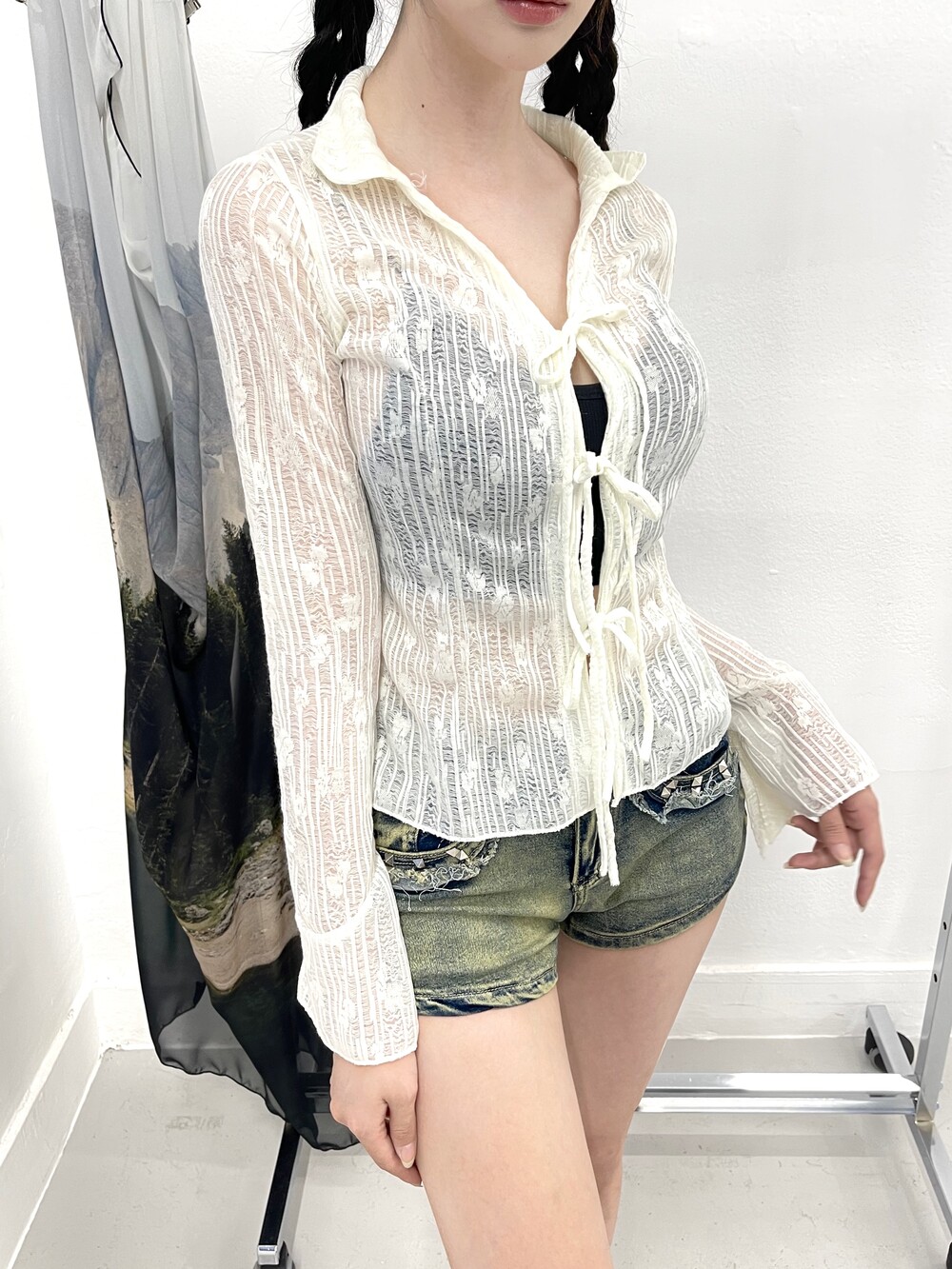 플라워 시스루 리본 홀 가디건