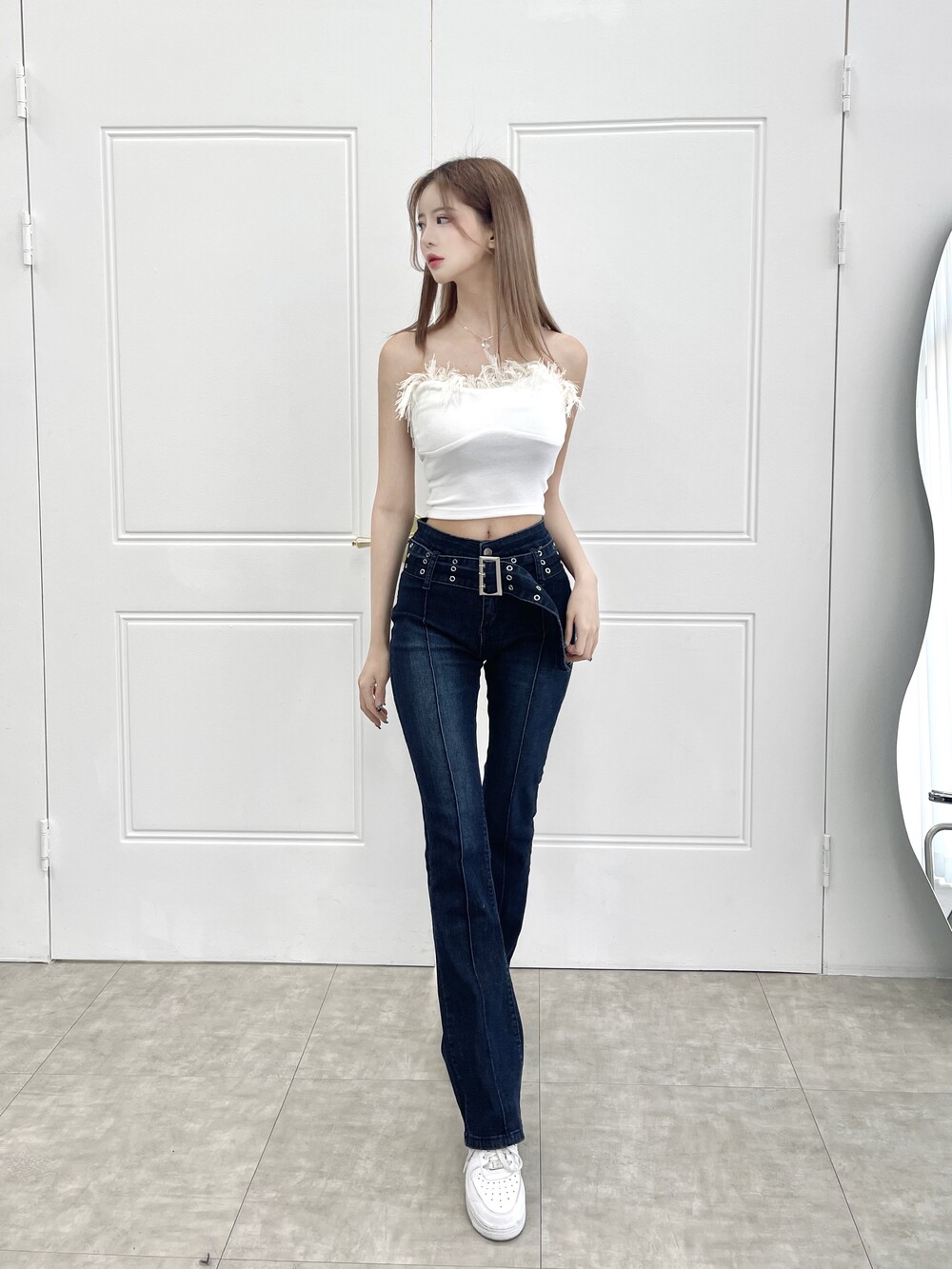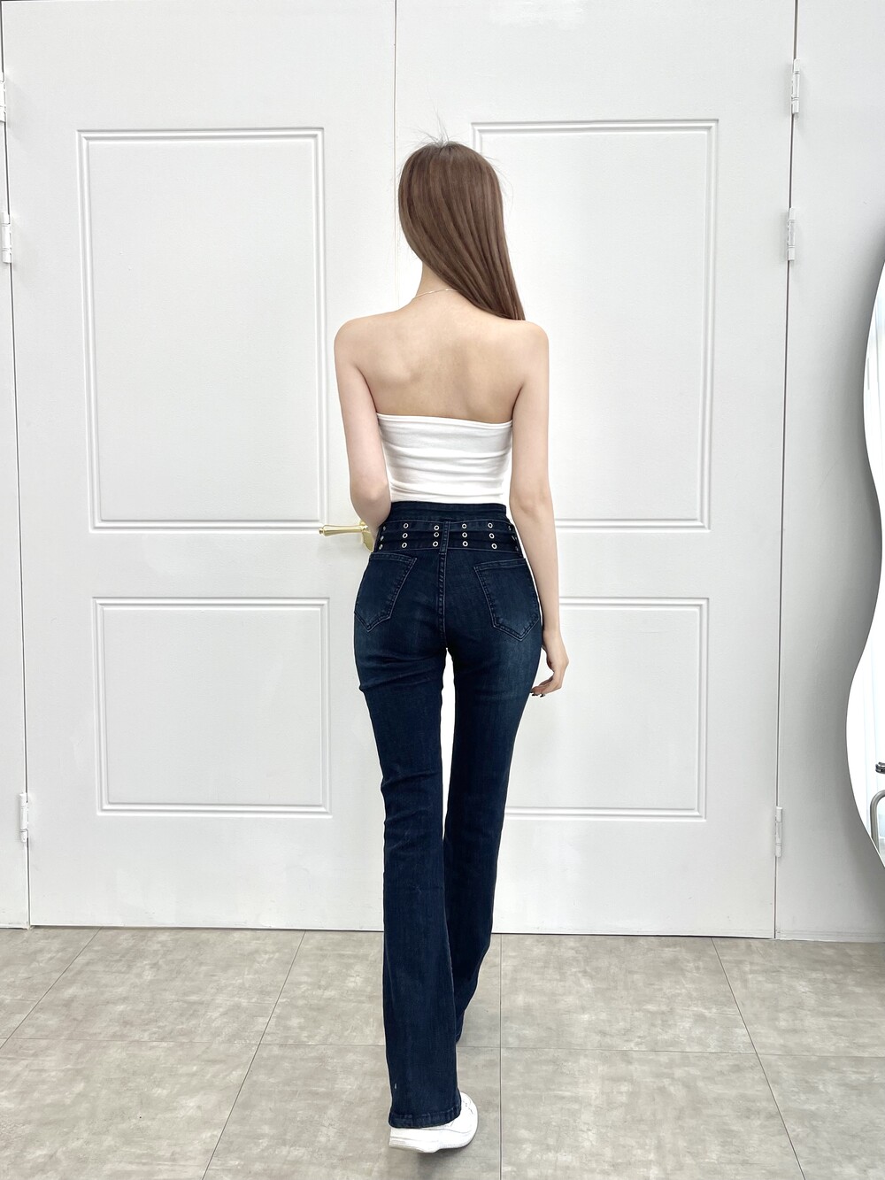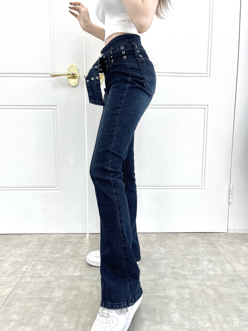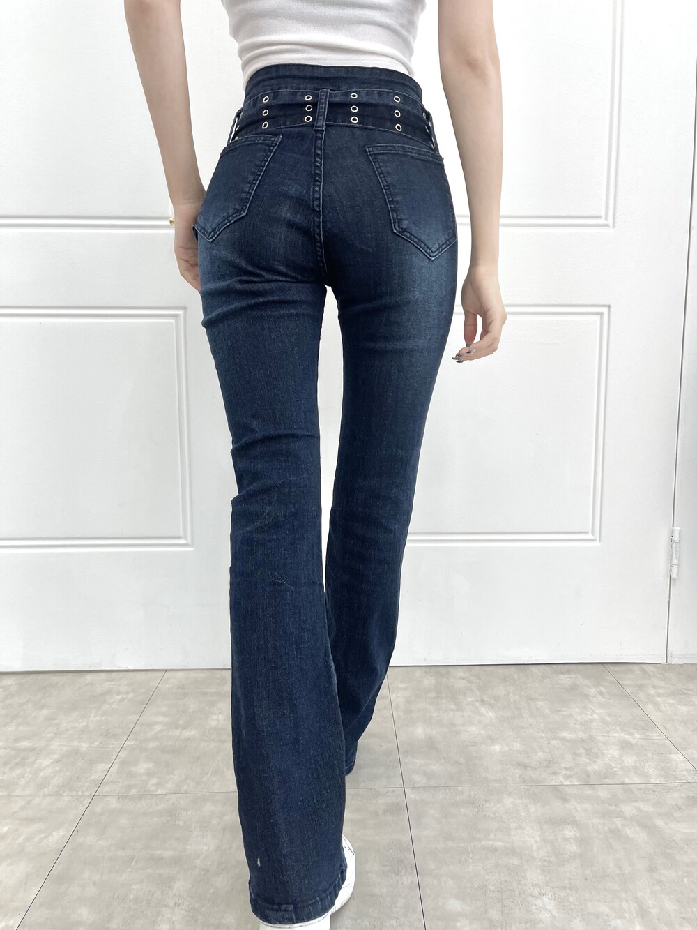 벨트 프론트 라인 슬림 부츠컷 진청 팬츠