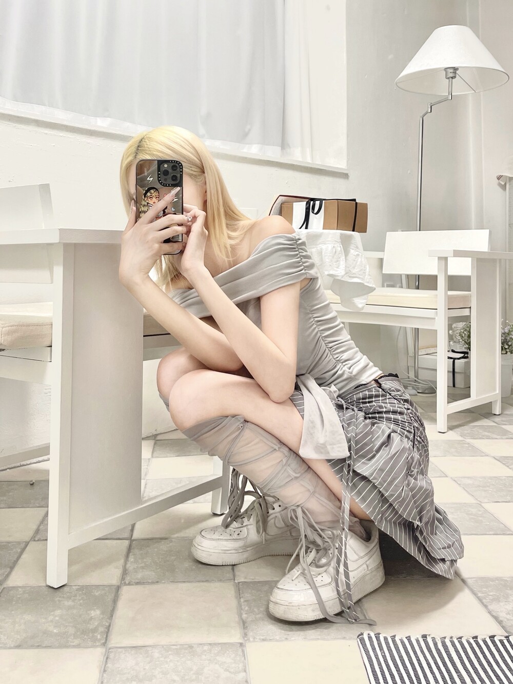 중앙 사이드 메쉬 롱 리본 디테일로 취향에 따라 묶어 연출