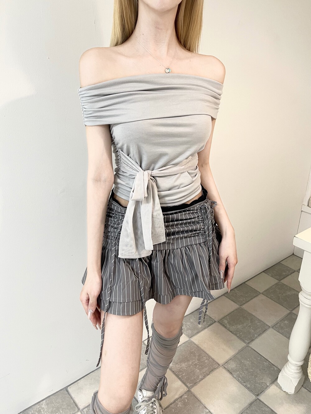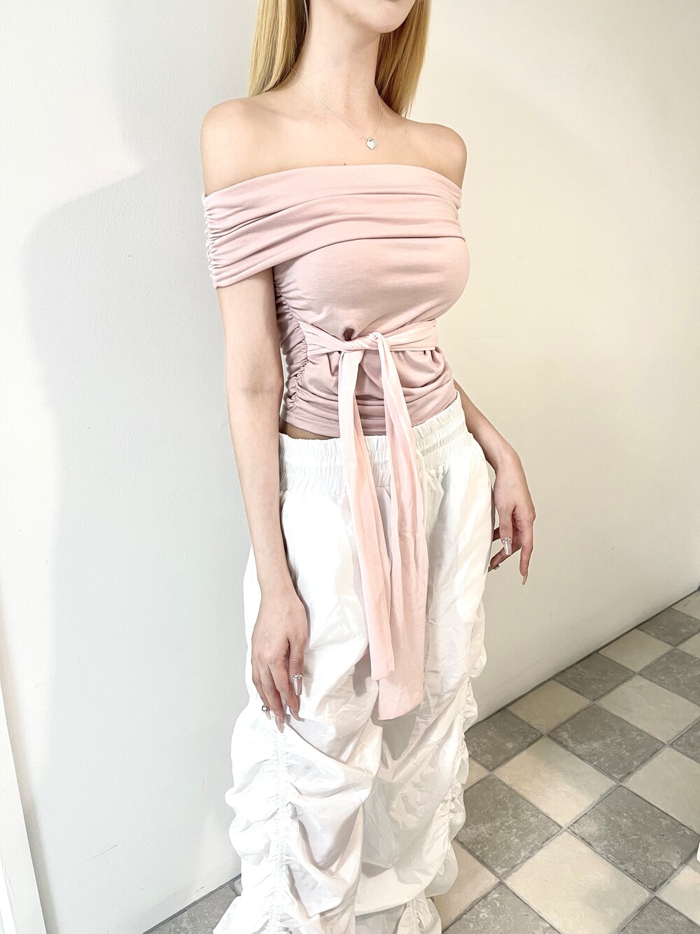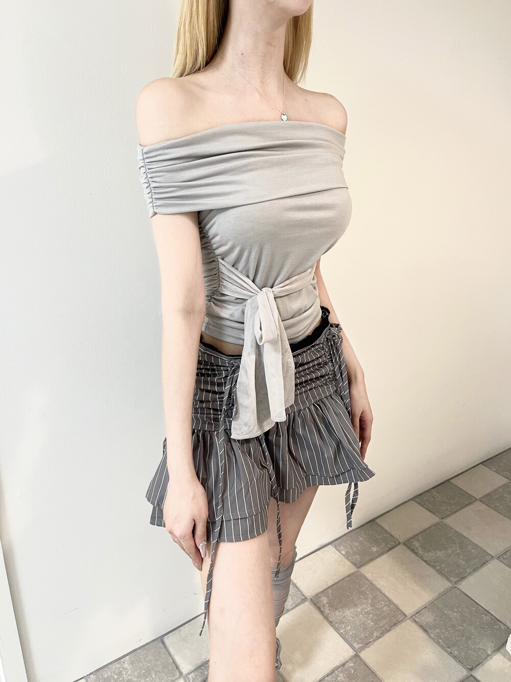 플랩 오프숄더 메쉬 쉬폰 리본 크롭 슬리브리스