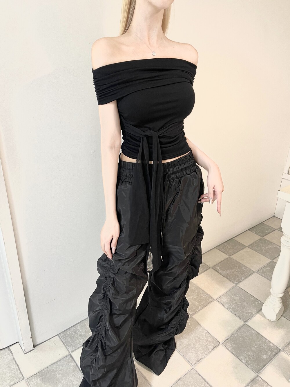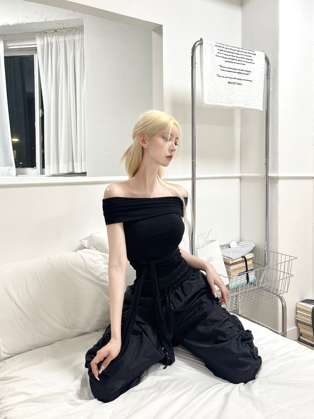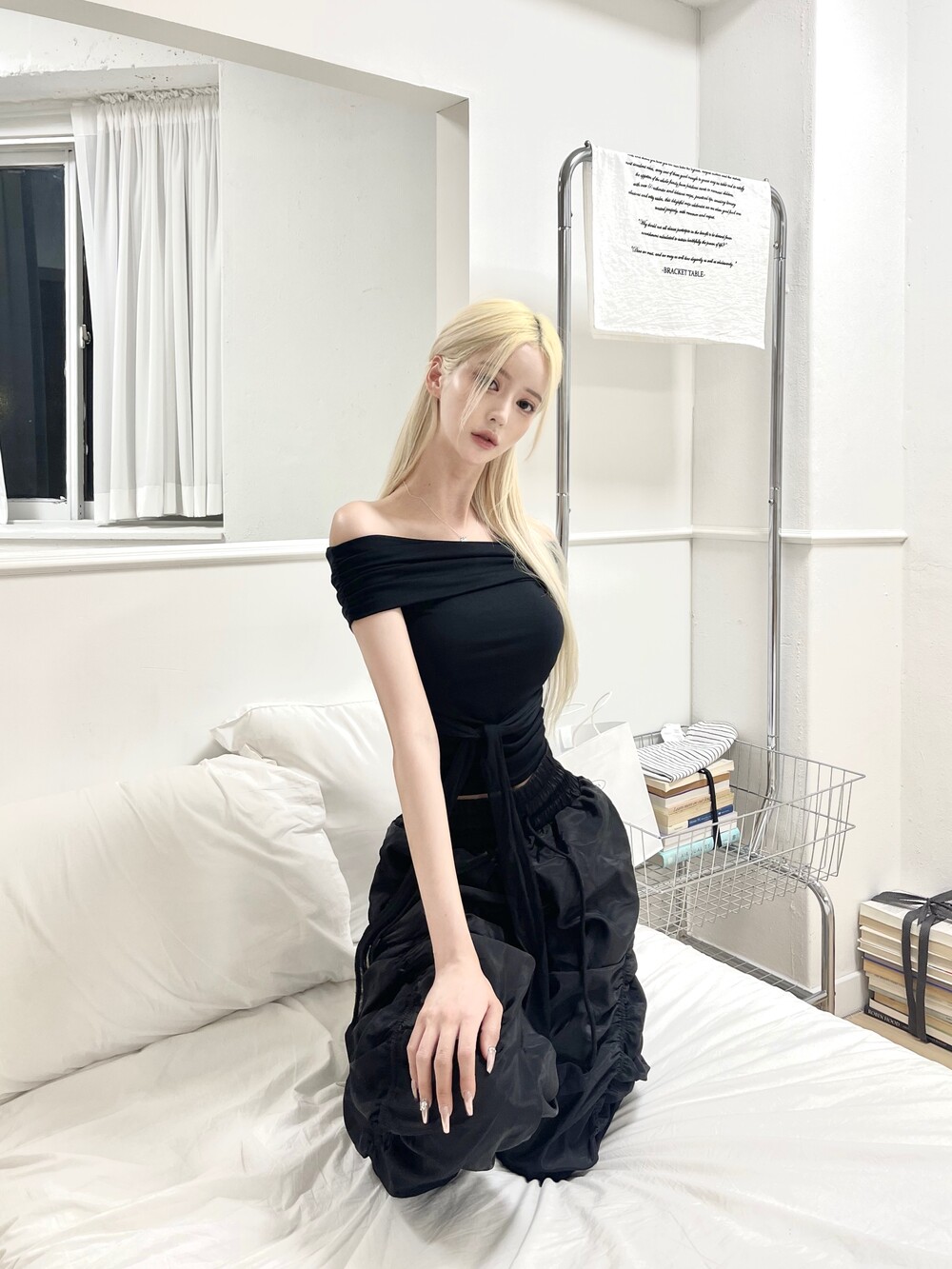 암 라인이 슬림해보이는 플랩 오프숄더 디자인