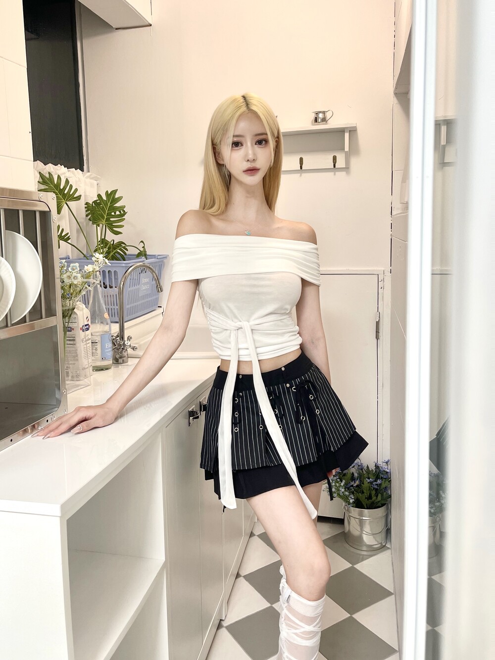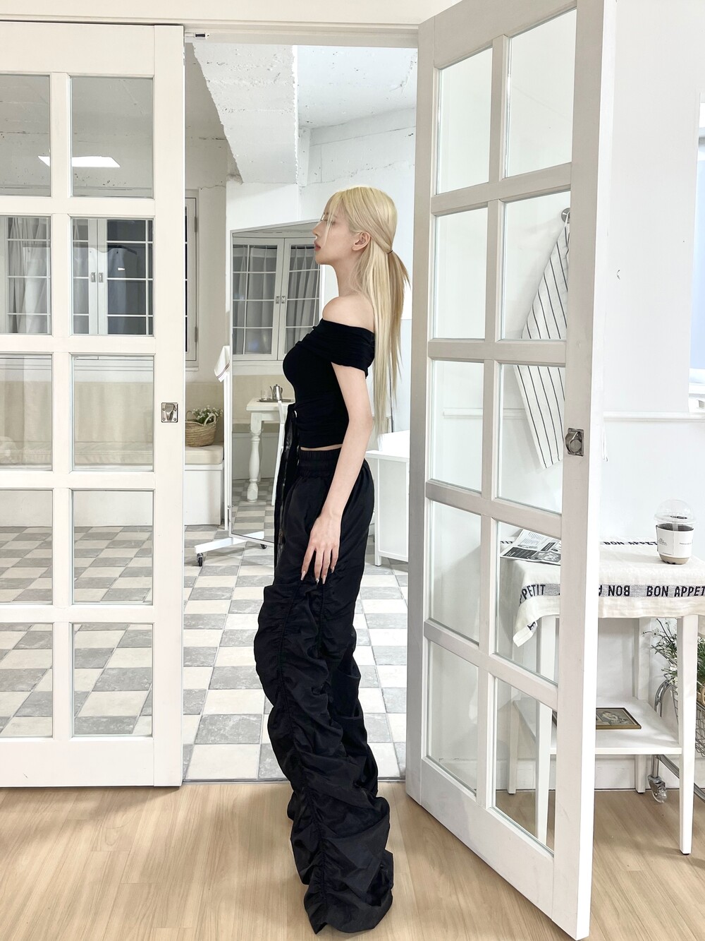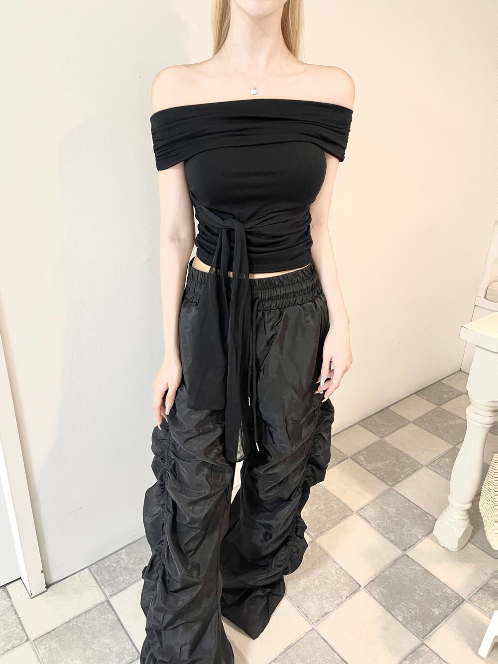 암 라인이 슬림해보이는 플랩 오프숄더 디자인