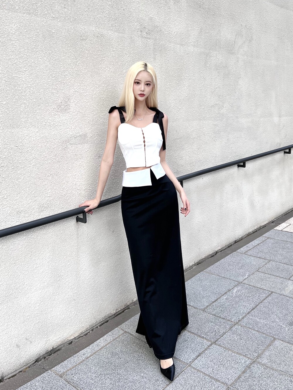 맥시한 기장으로 롱해보이는 레그라인과 우아한 분위기