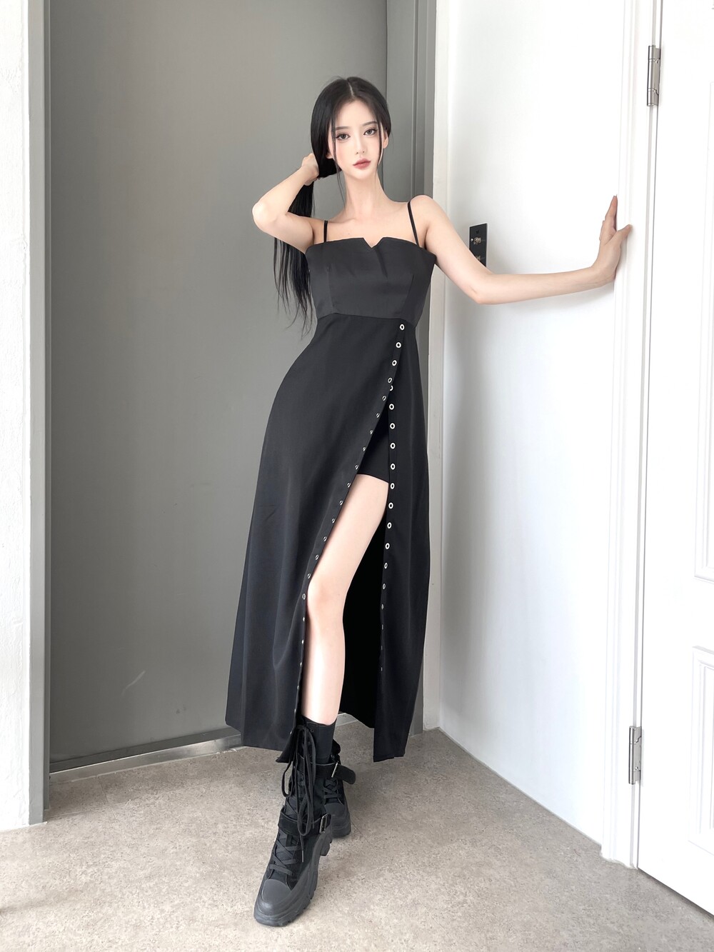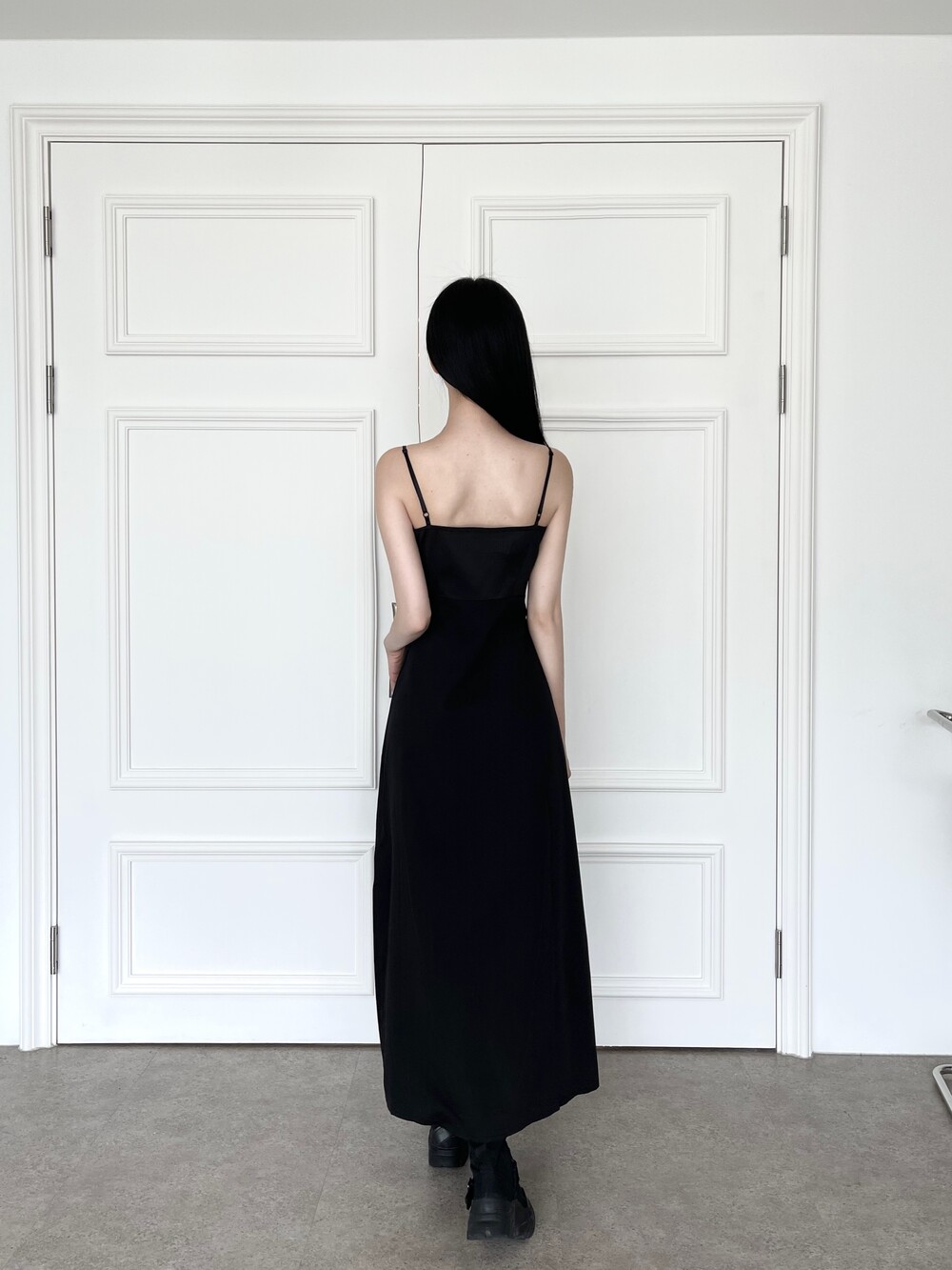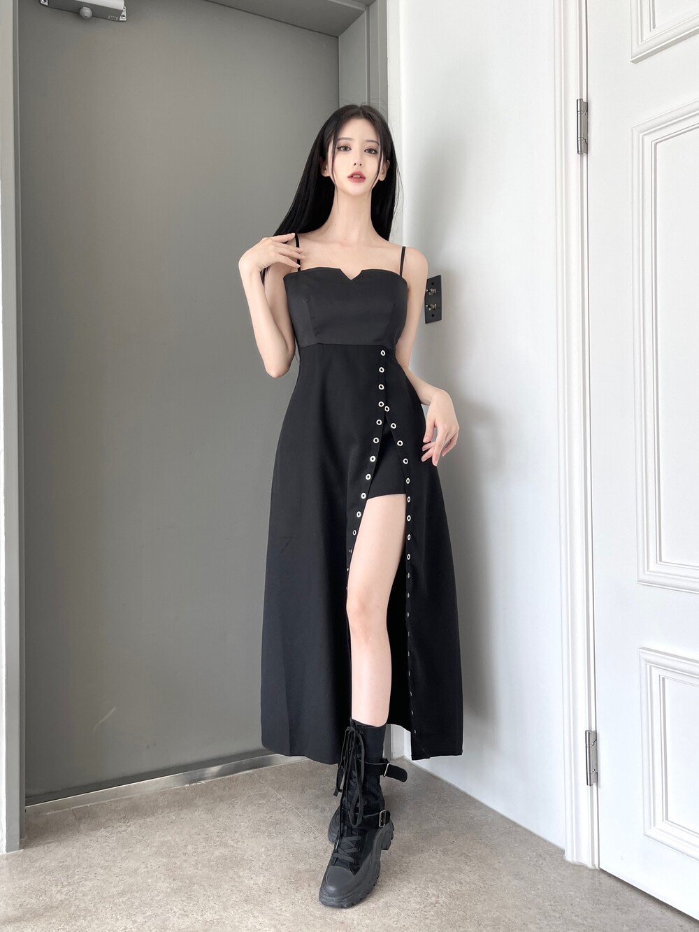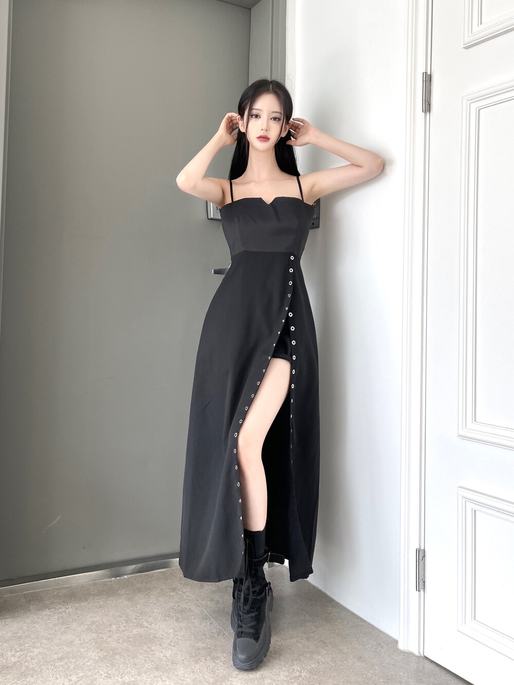 딥한 슬릿이 있어 시크한 무드가 돋보이는 원피스