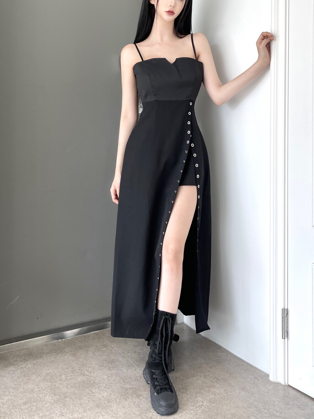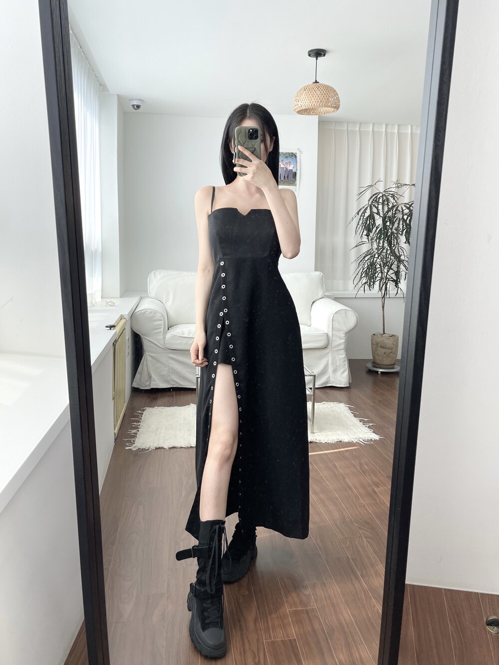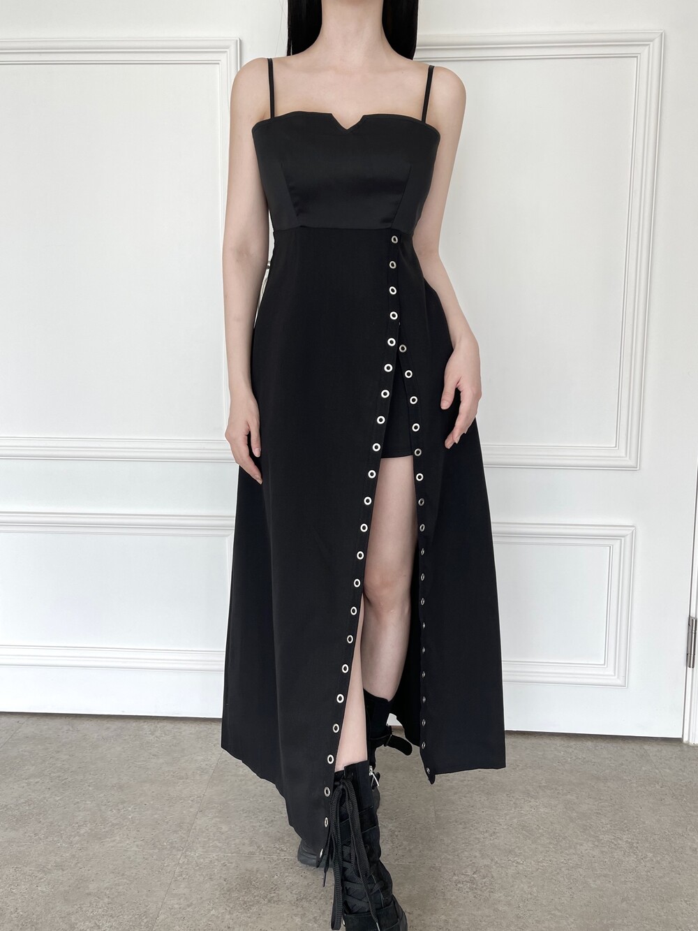 딥슬릿 아일렛 맥시 슬리브리스 원피스