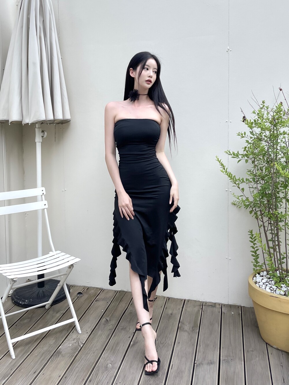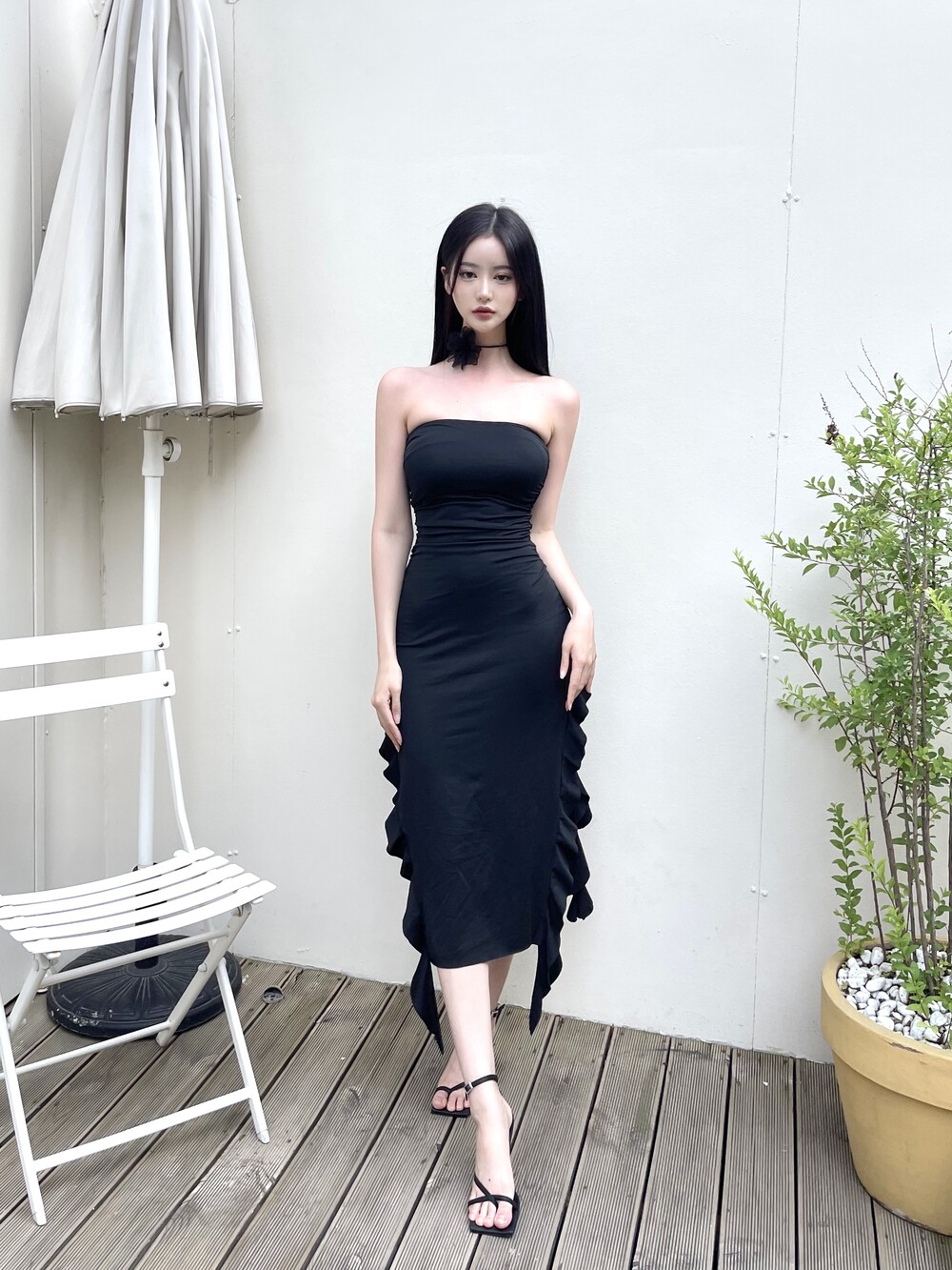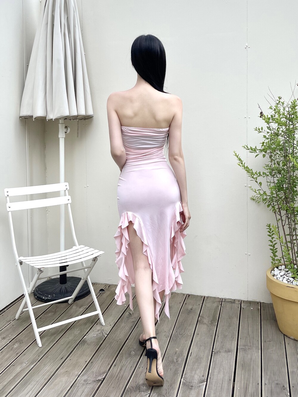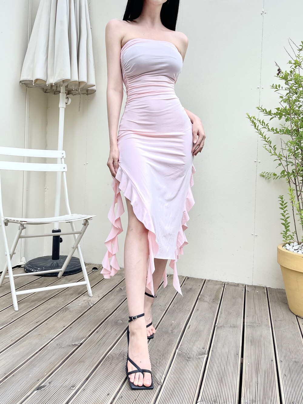 튜브탑 맥시 러플 슬릿 롱 원피스