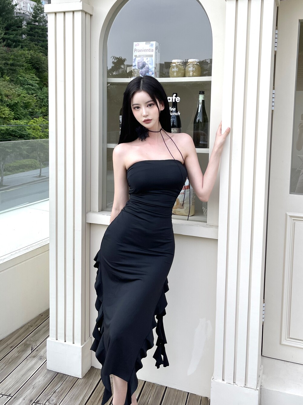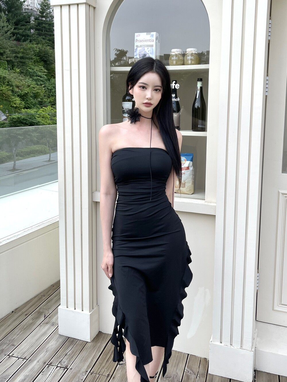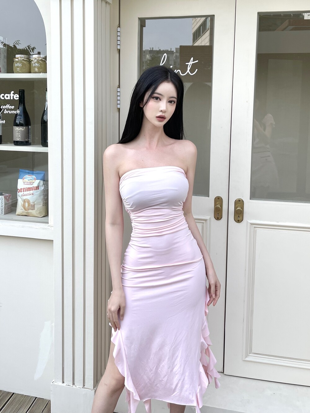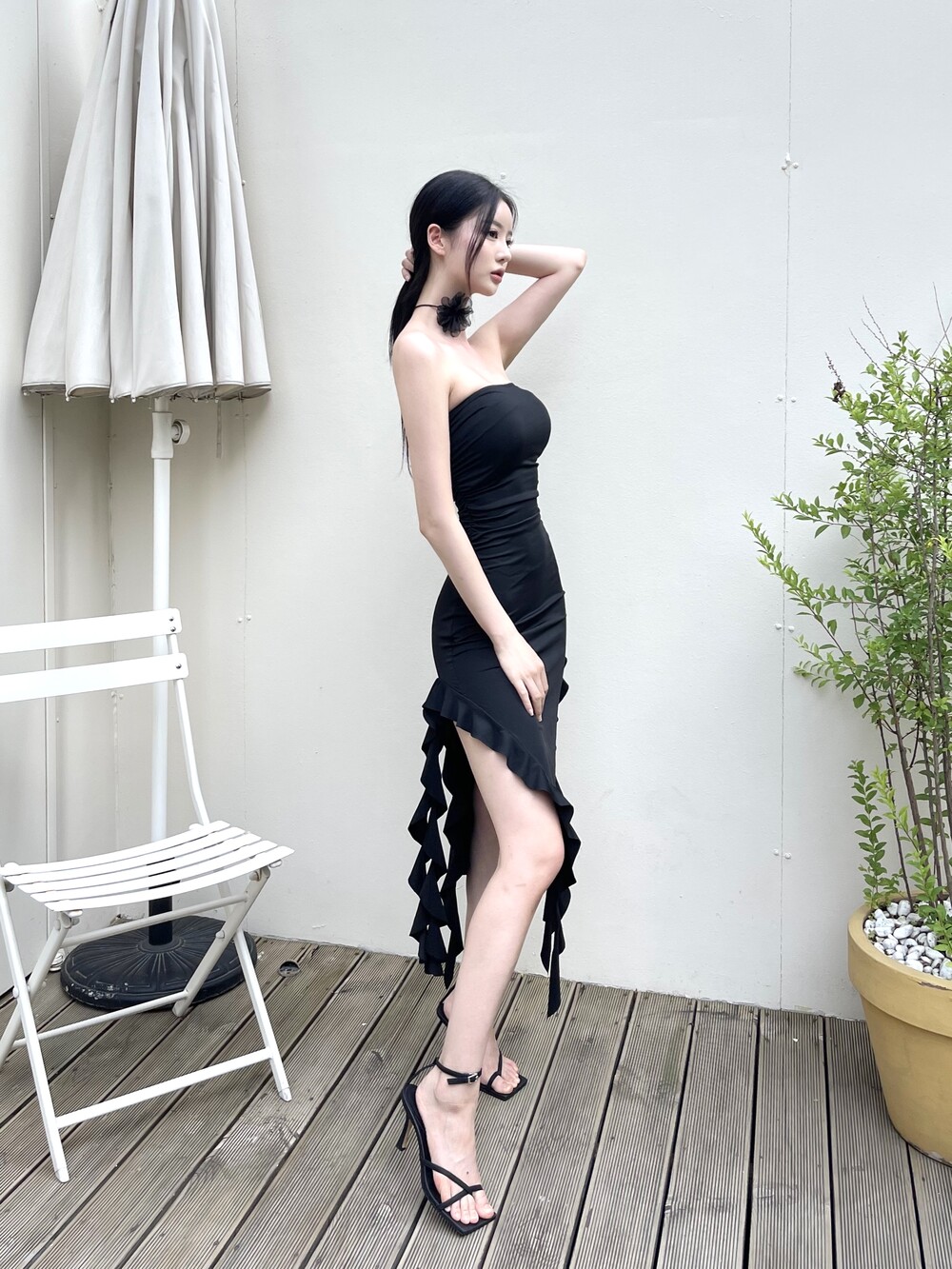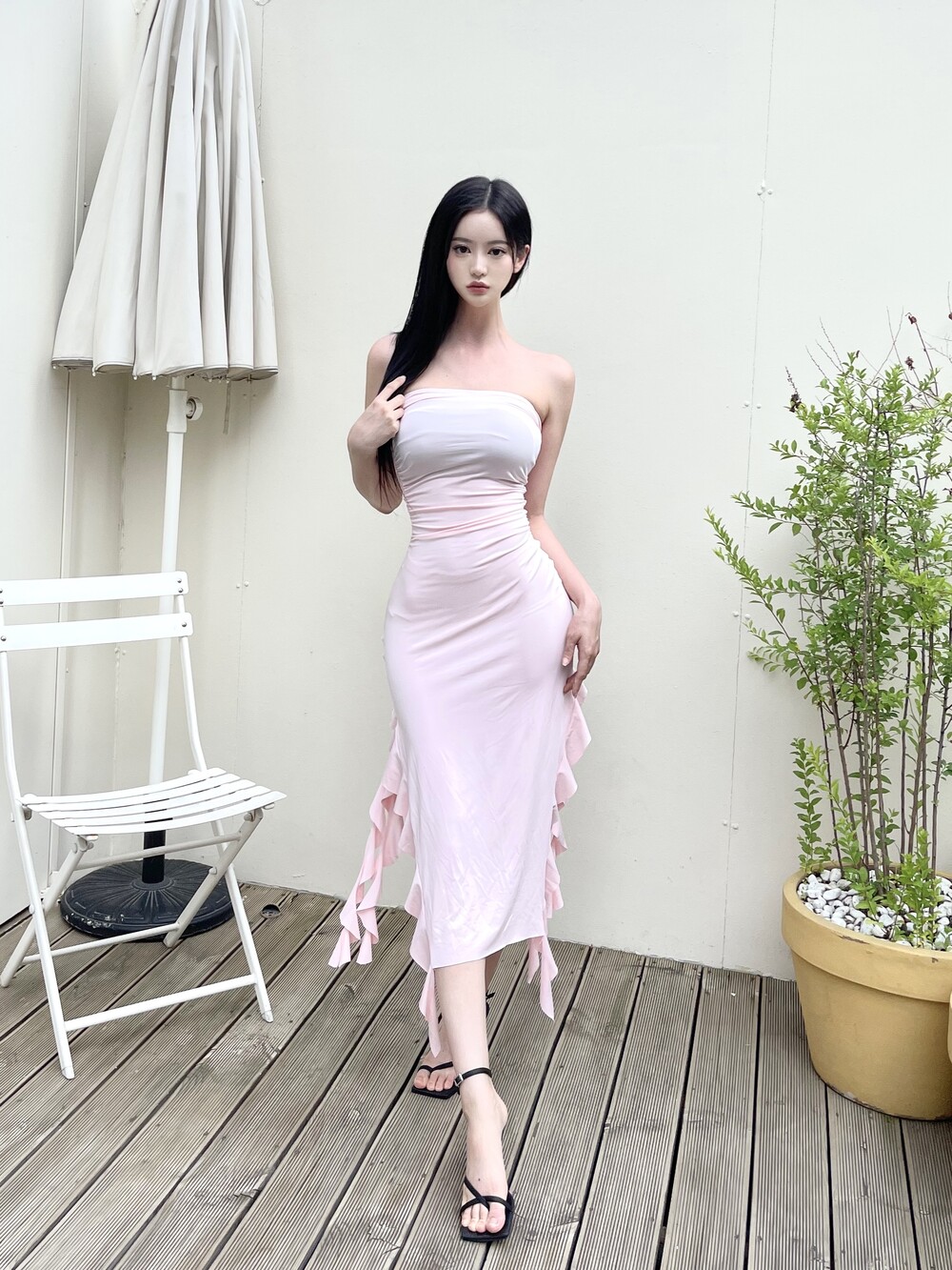 튜브탑 맥시 러플 슬릿 롱 원피스