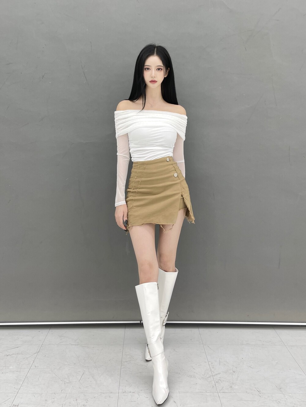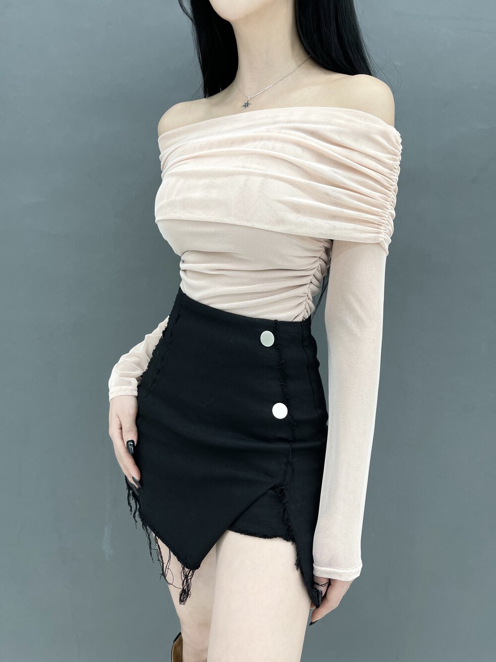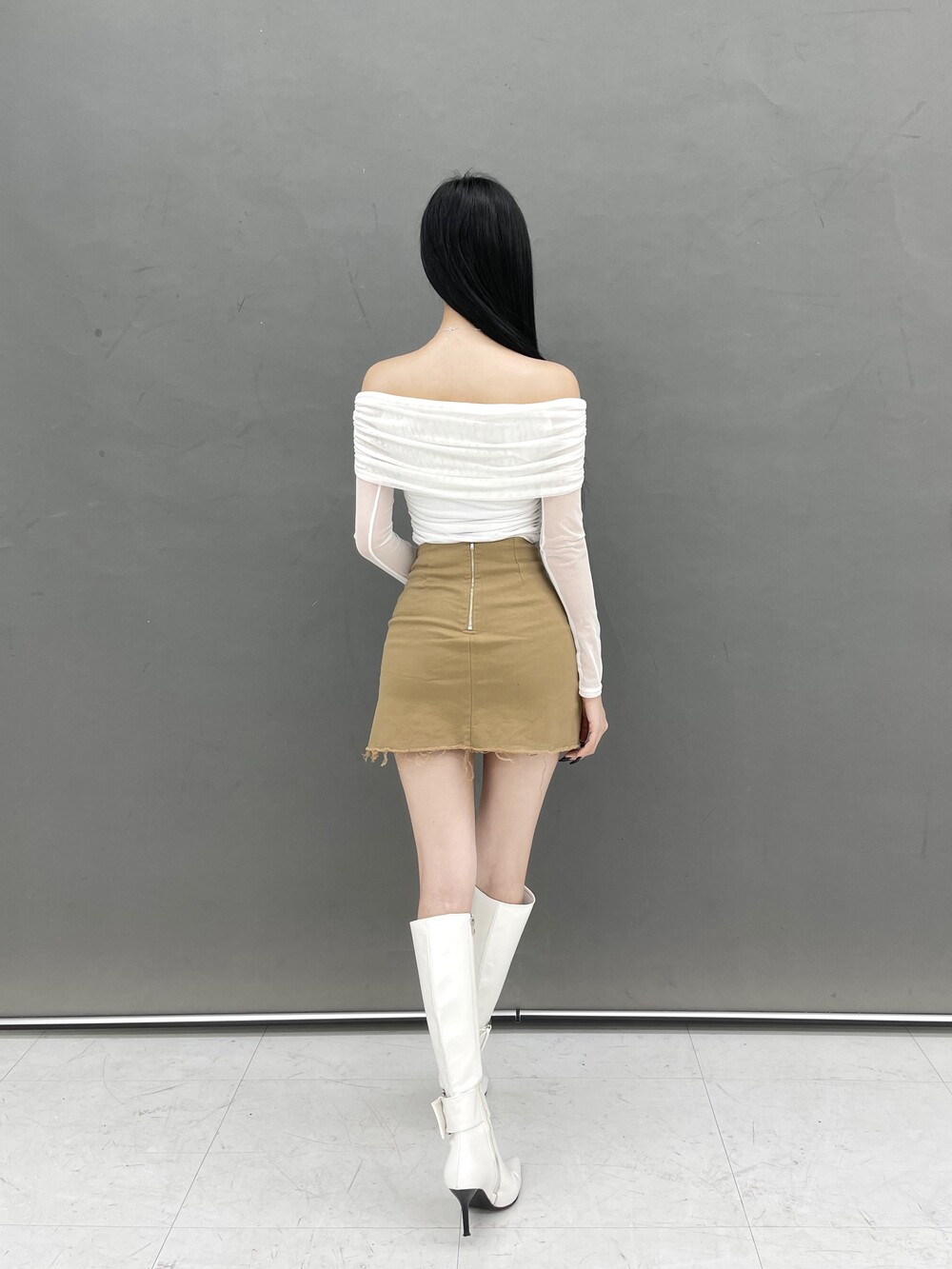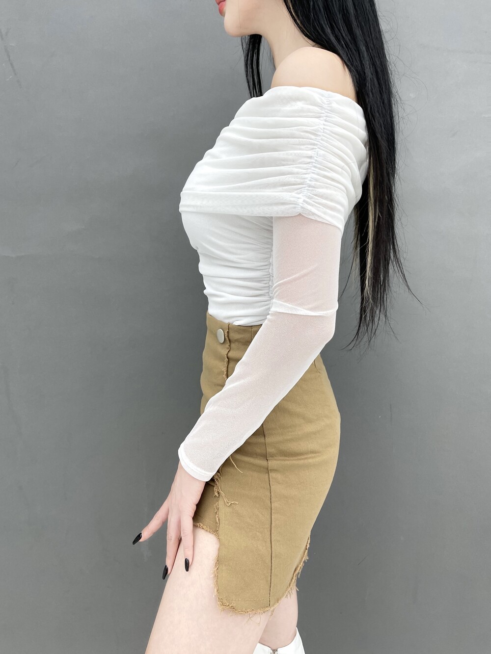 양 사이드 어깨에 셔링이 들어간 오프숄더로 체형 커버