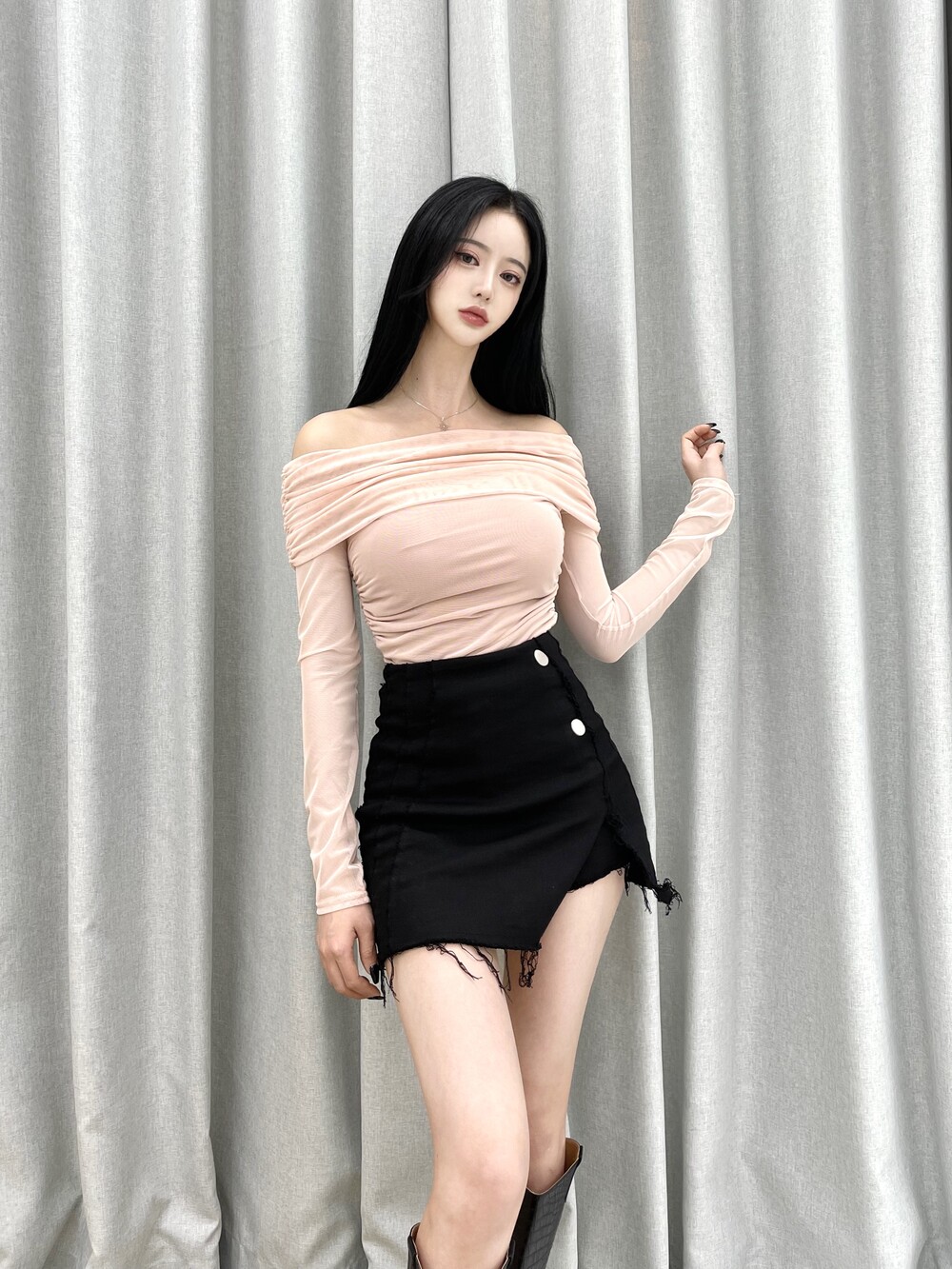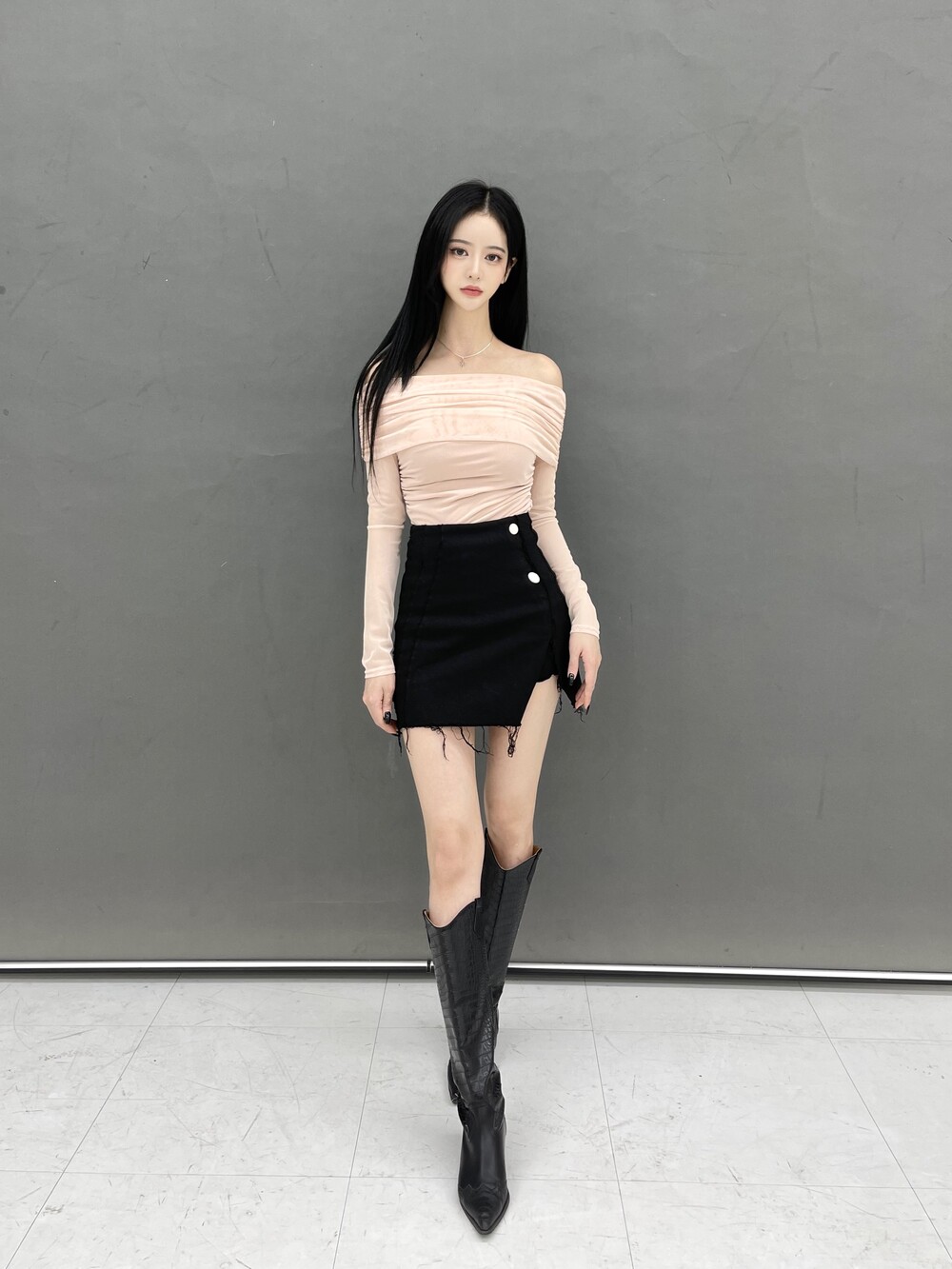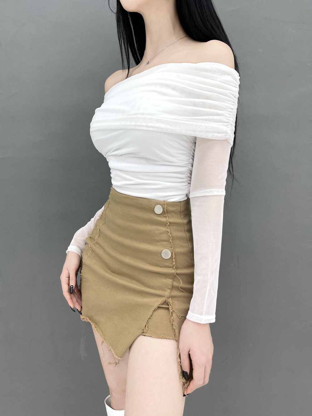 양 사이드 어깨에 셔링이 들어간 오프숄더로 체형 커버