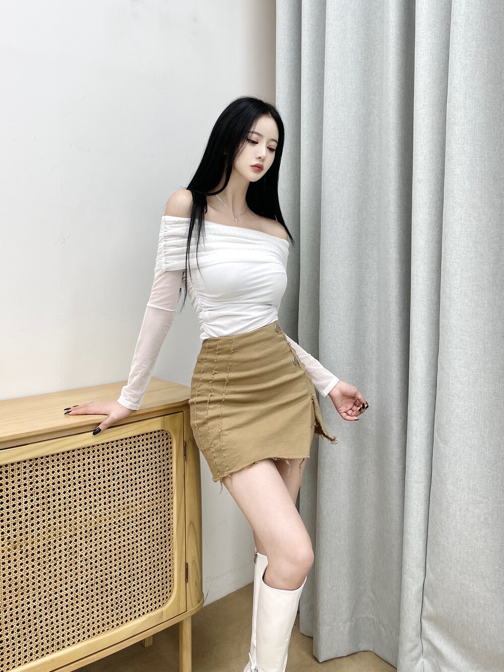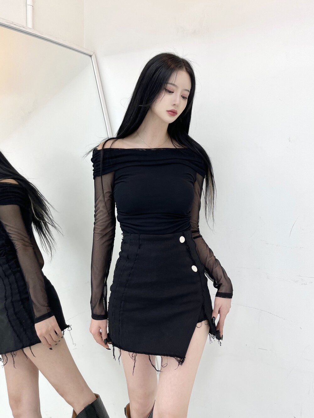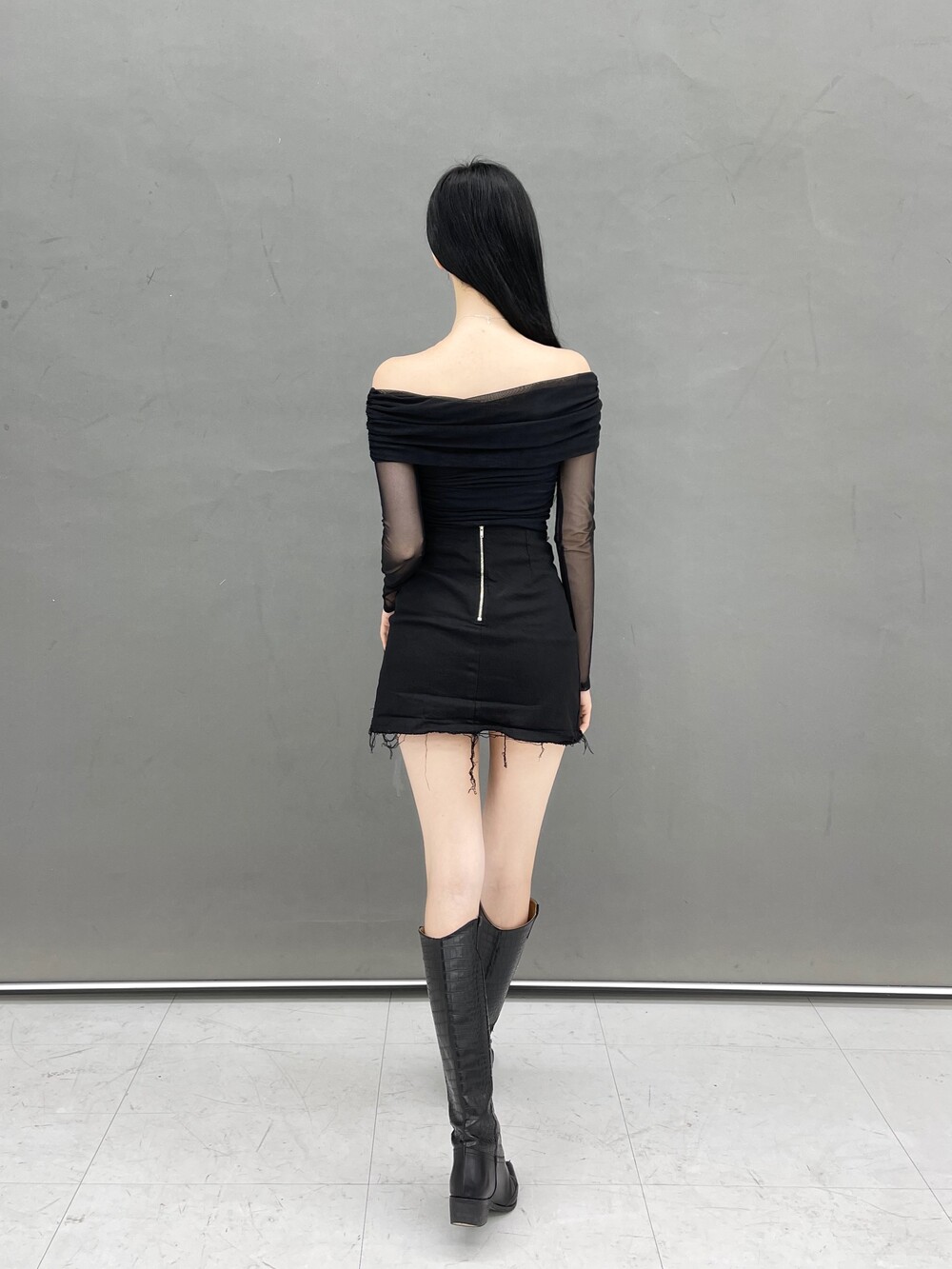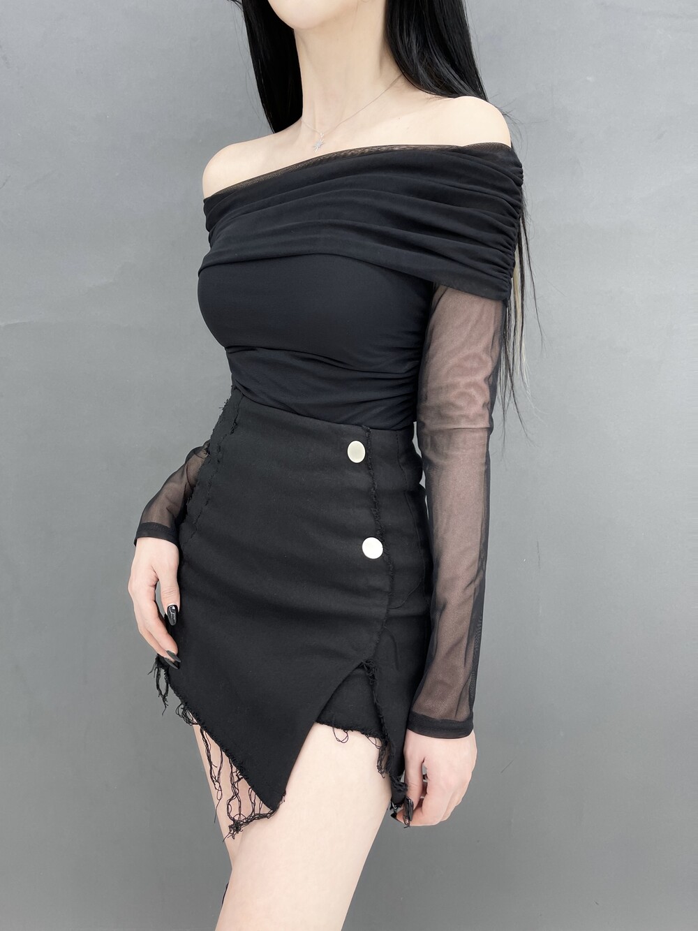 양 사이드 어깨에 셔링이 들어간 오프숄더로 체형 커버