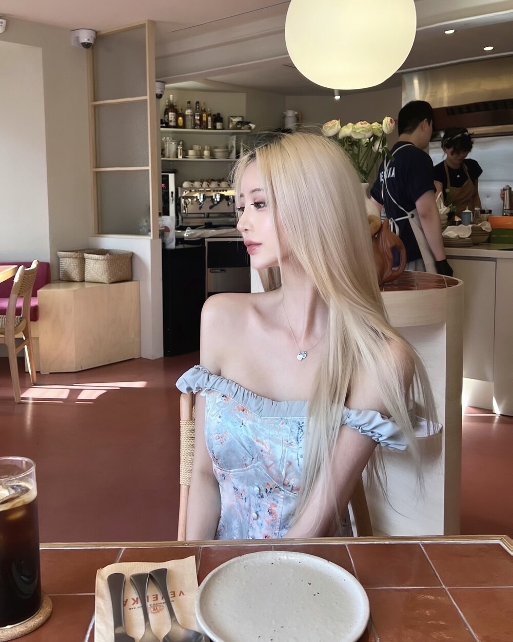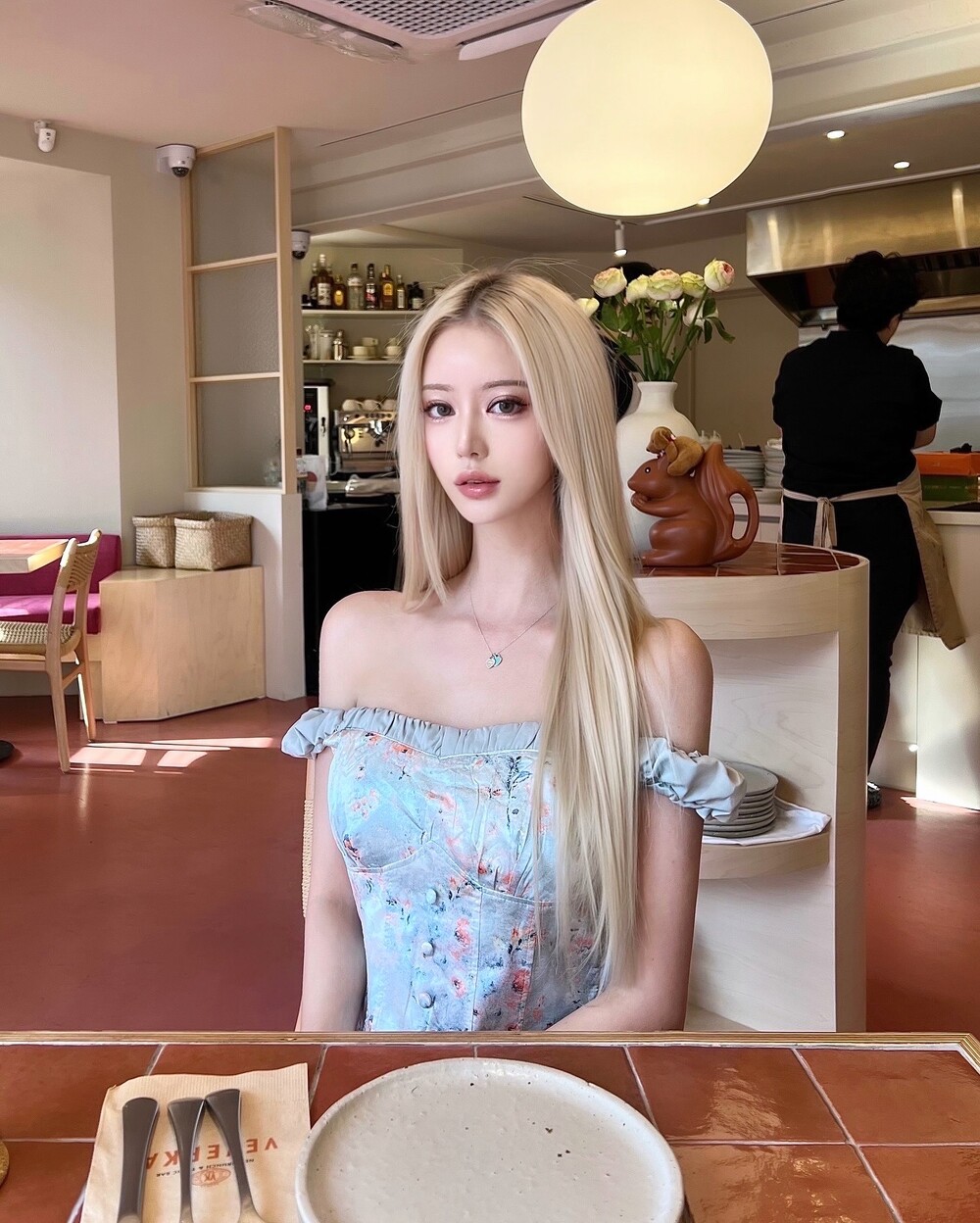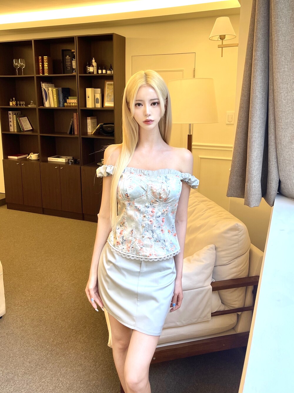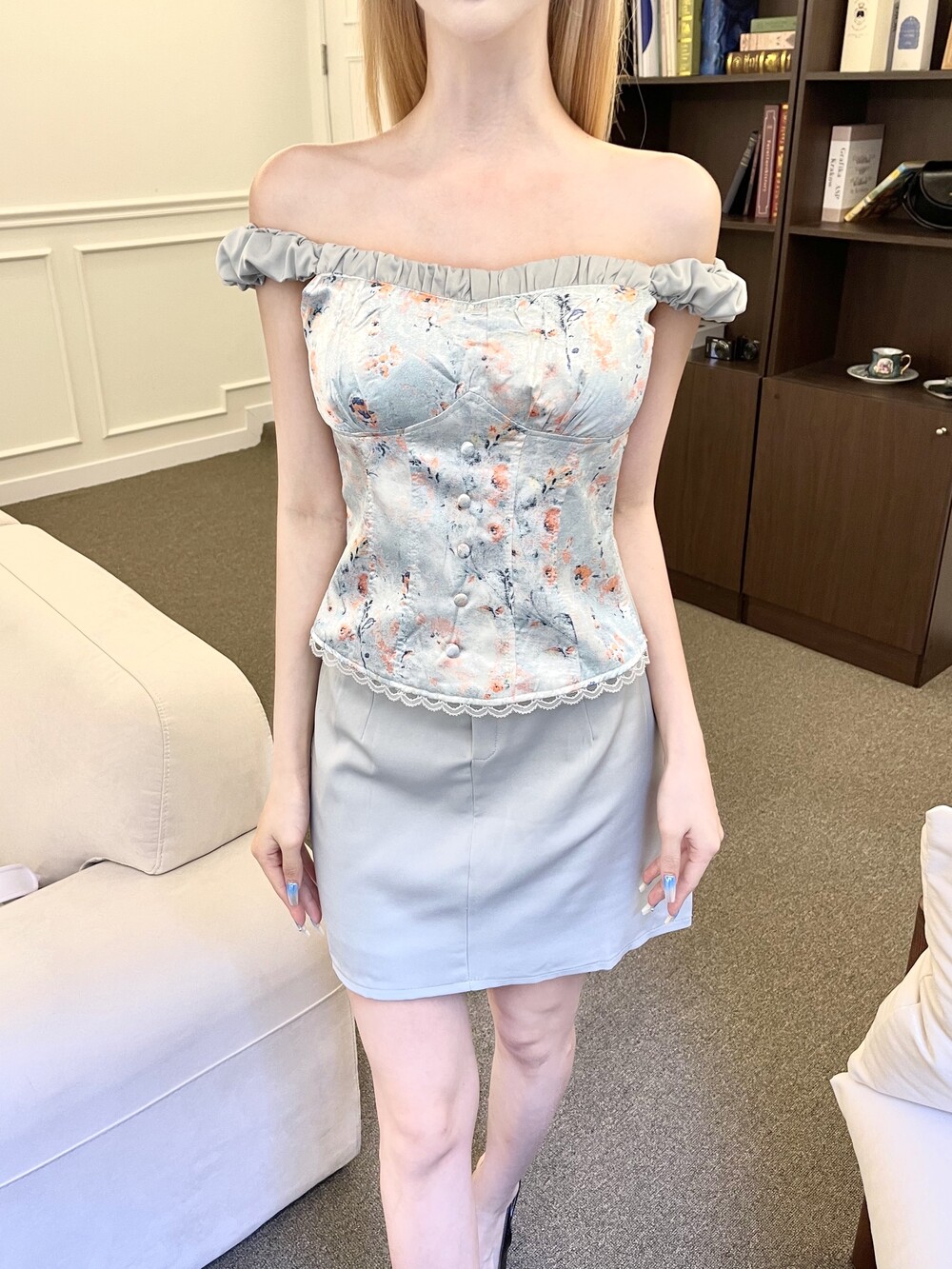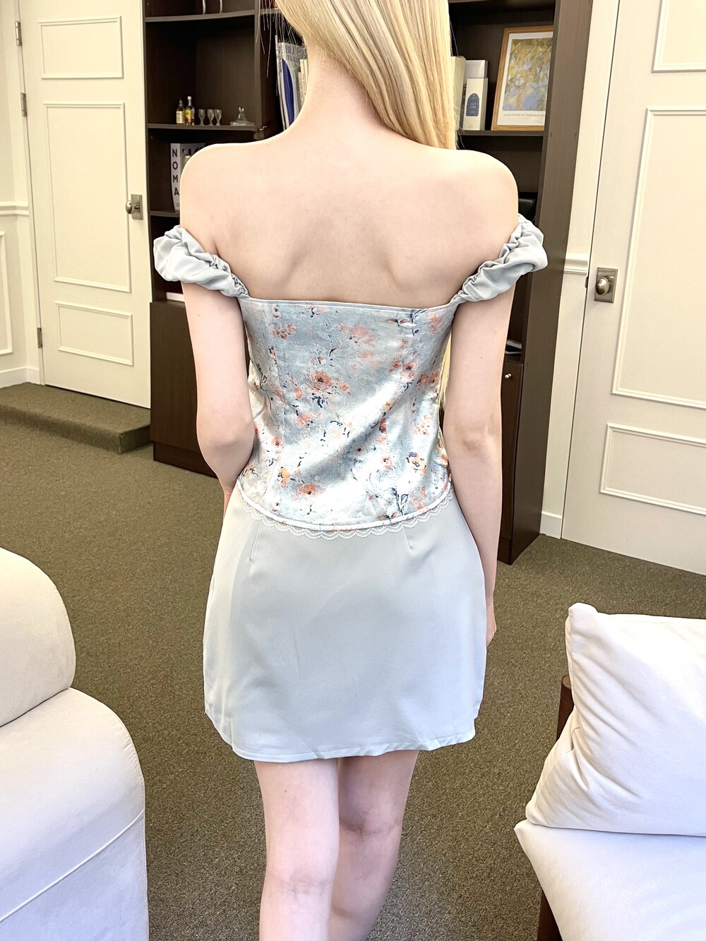 글로우 새틴 플라워 오프 탑 - 스커트 투피스