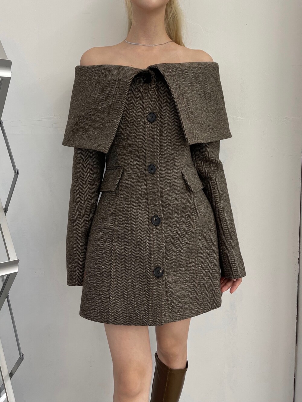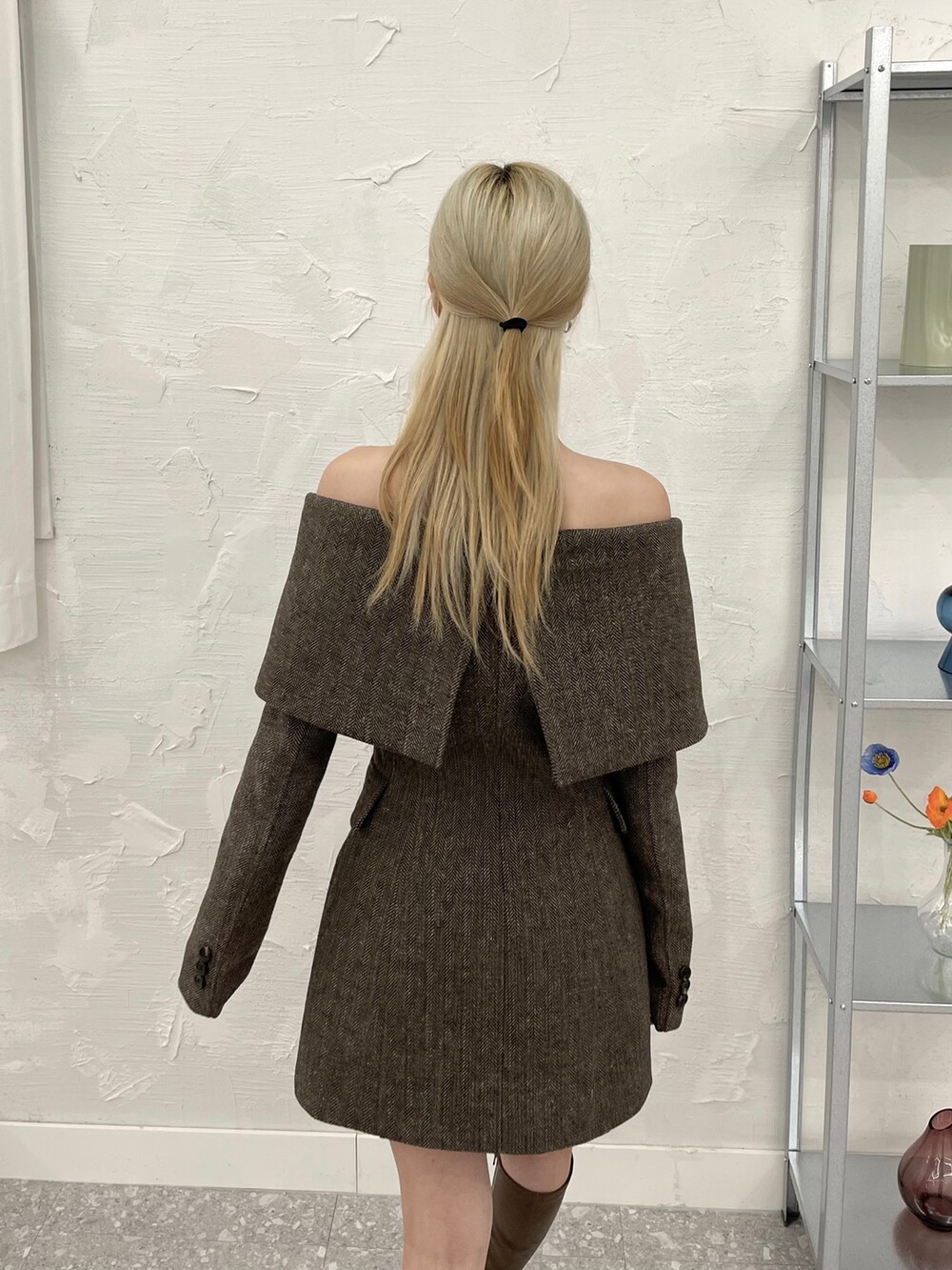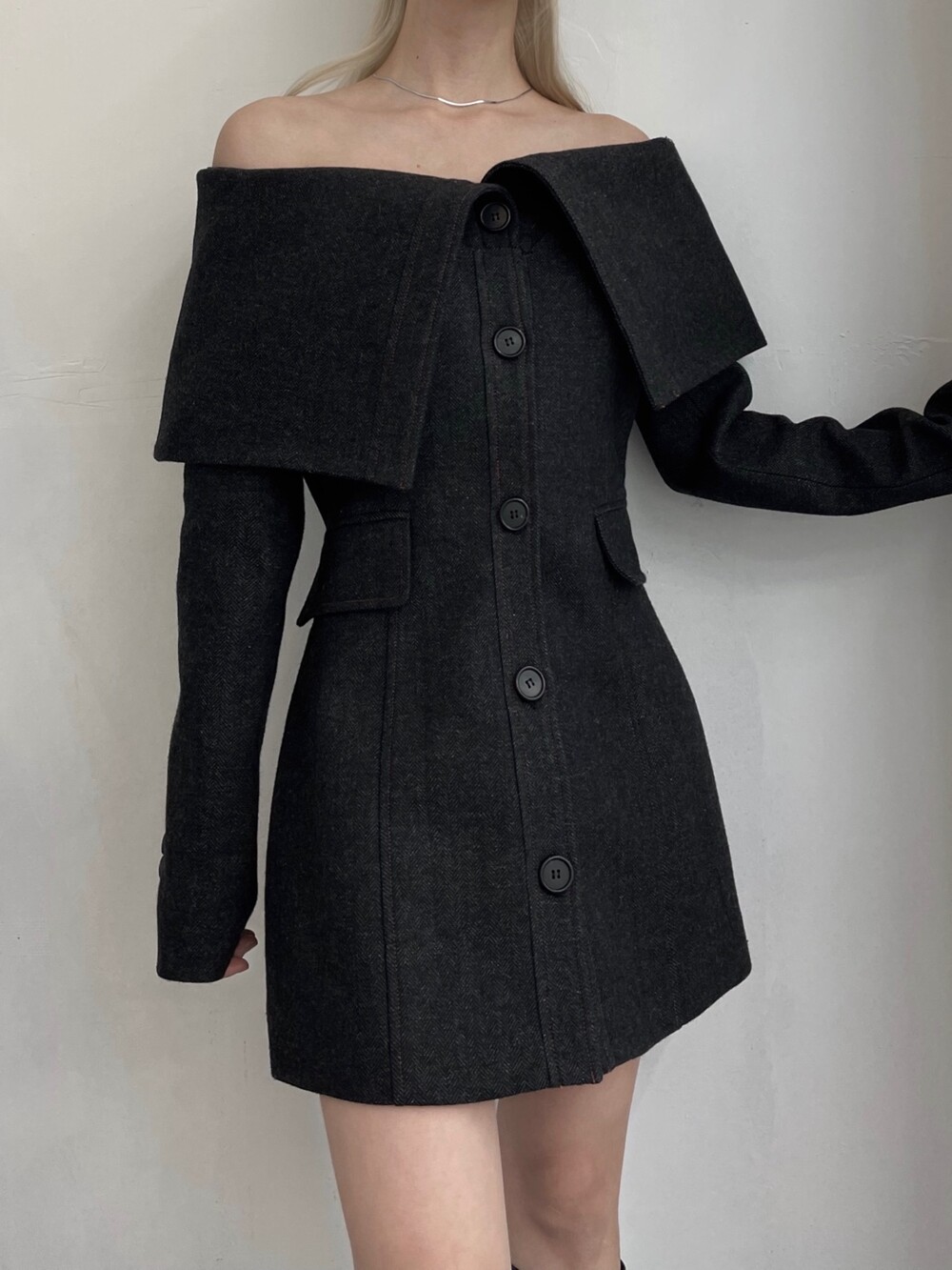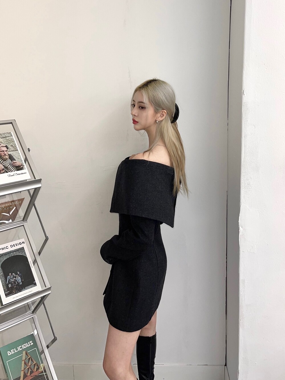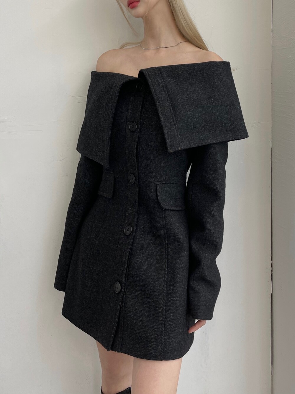 케이프 디테일이 오프숄더로 내려오는 독특한 디자인으로