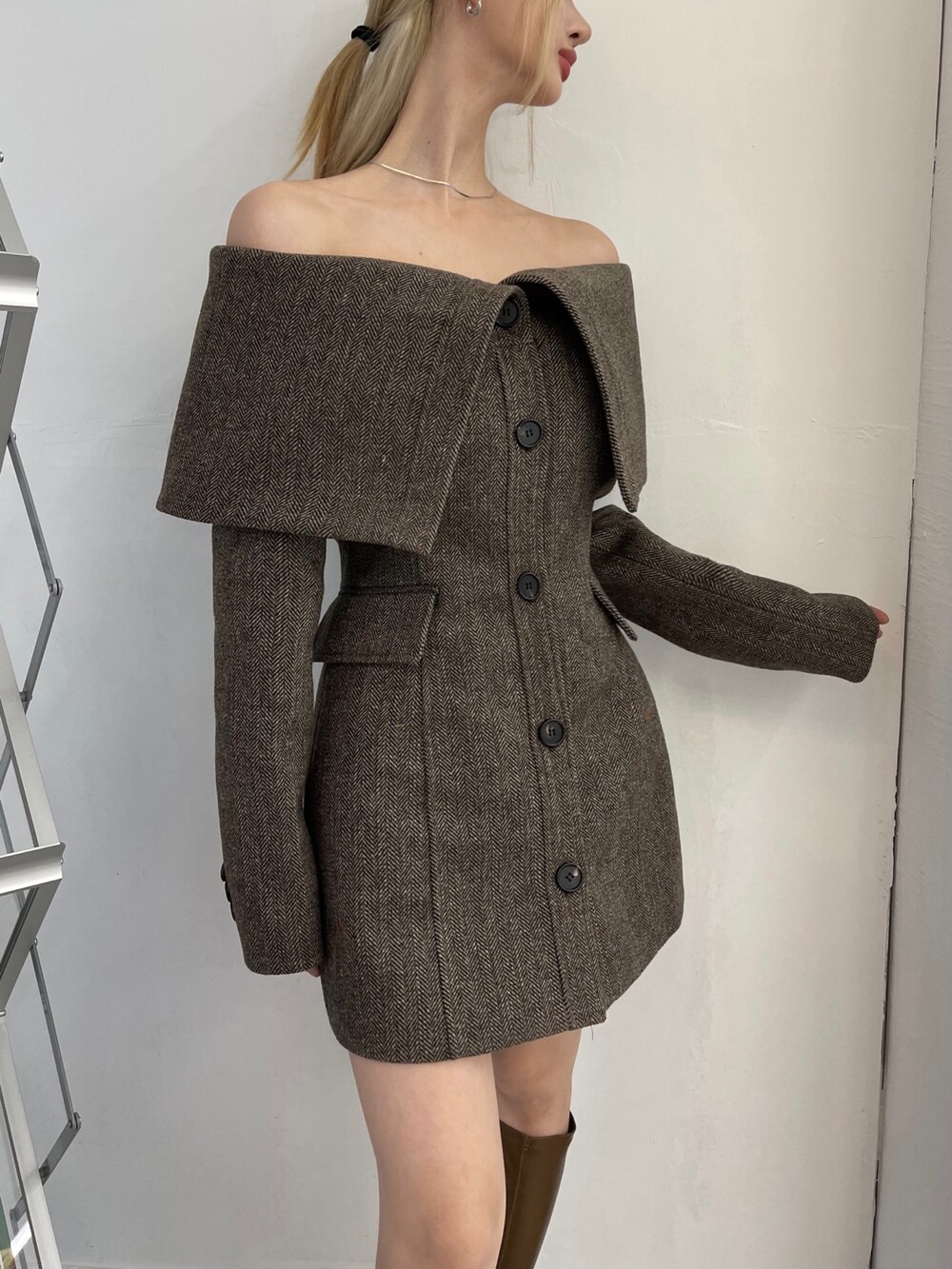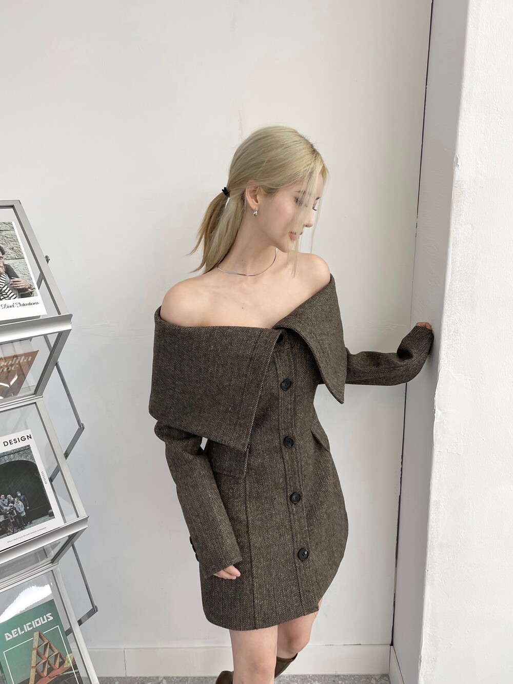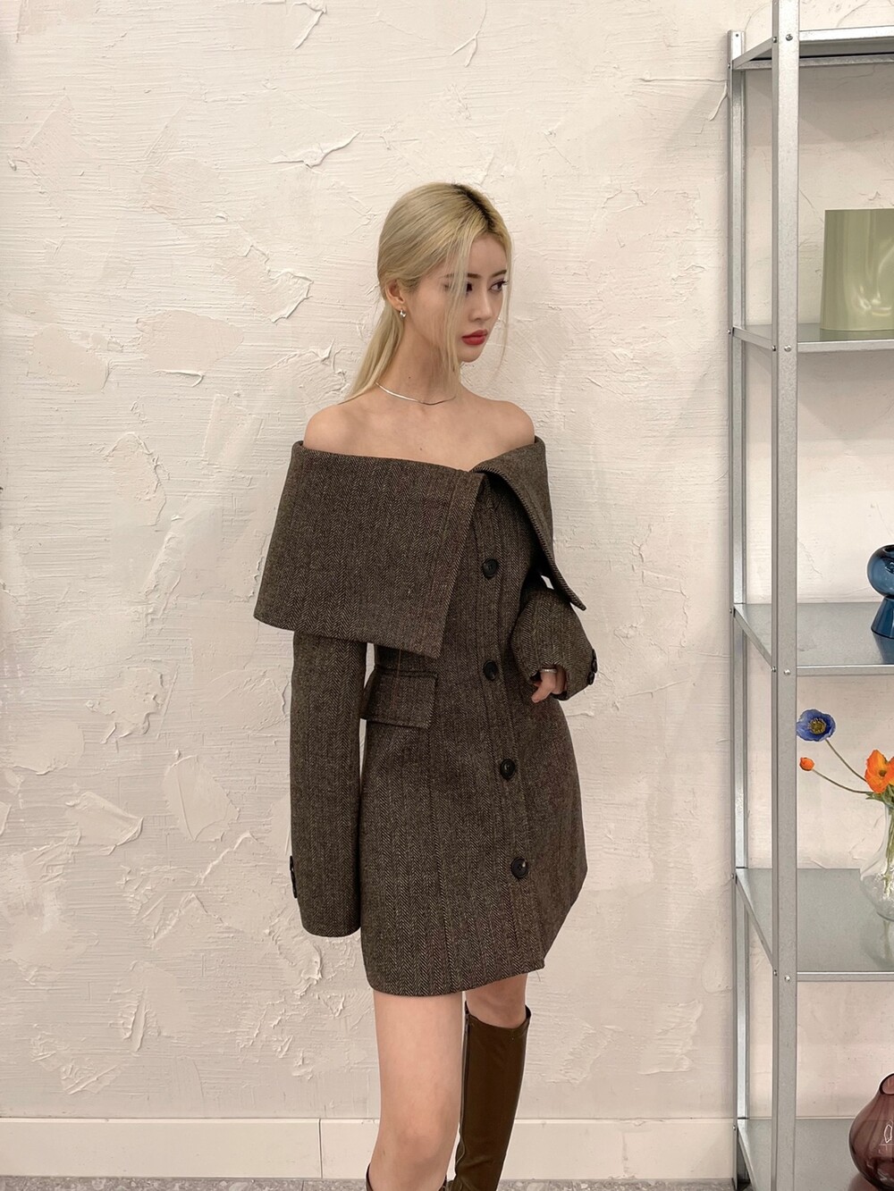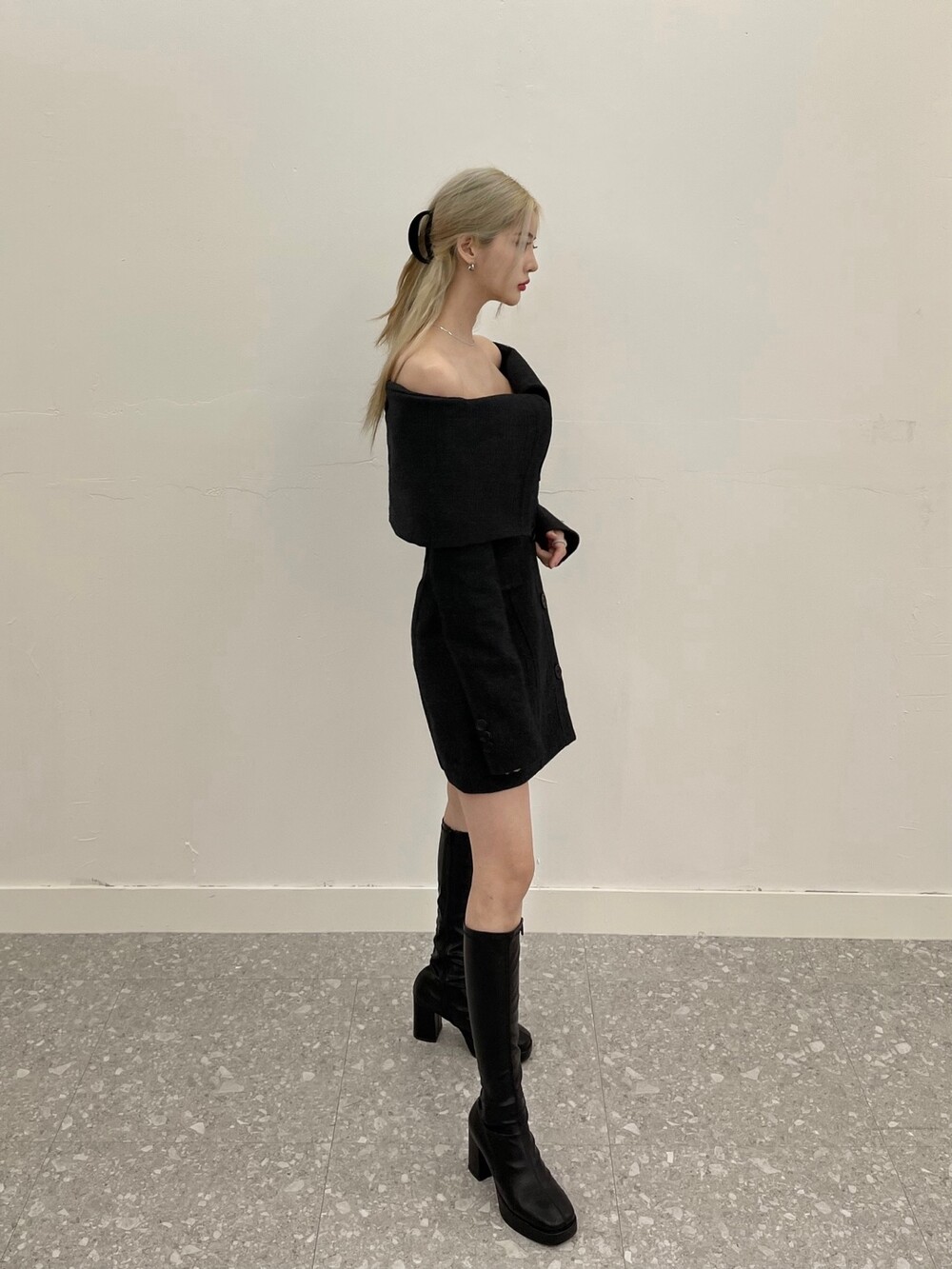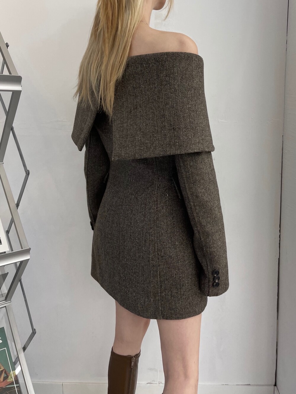 케이프 디테일이 오프숄더로 내려오는 독특한 디자인으로