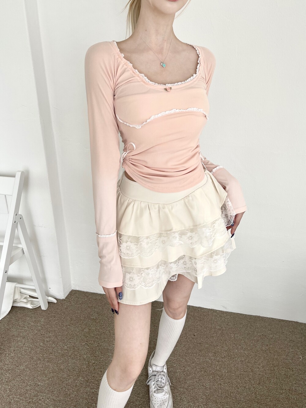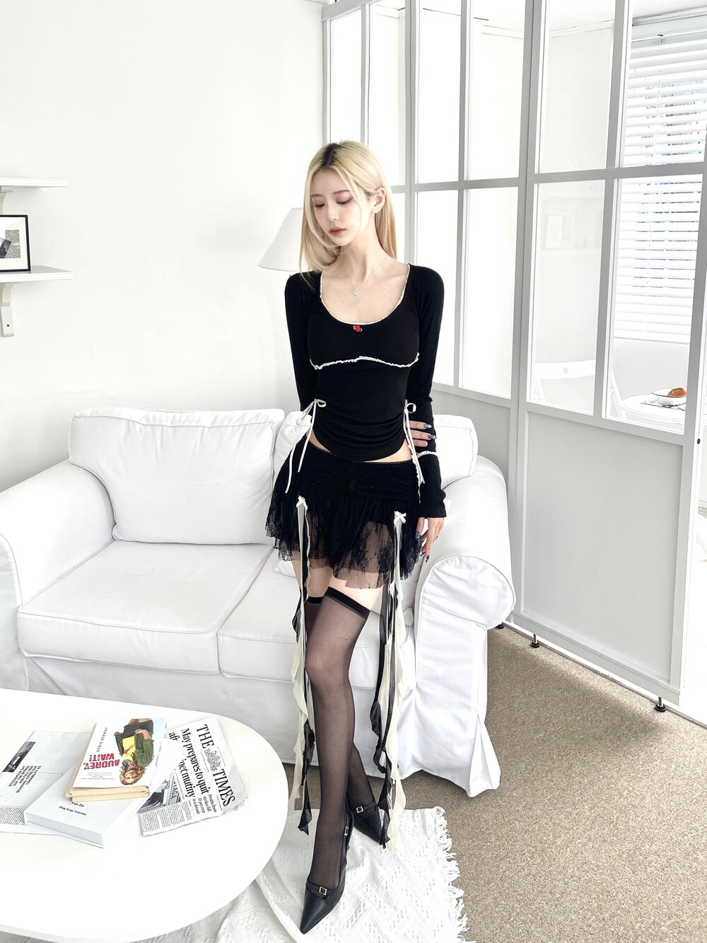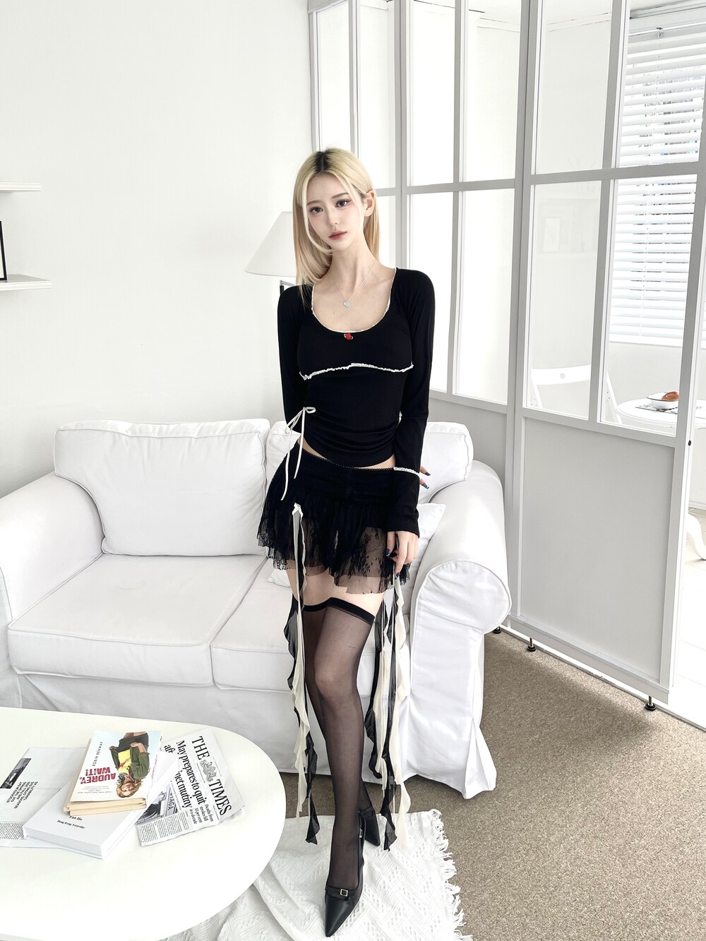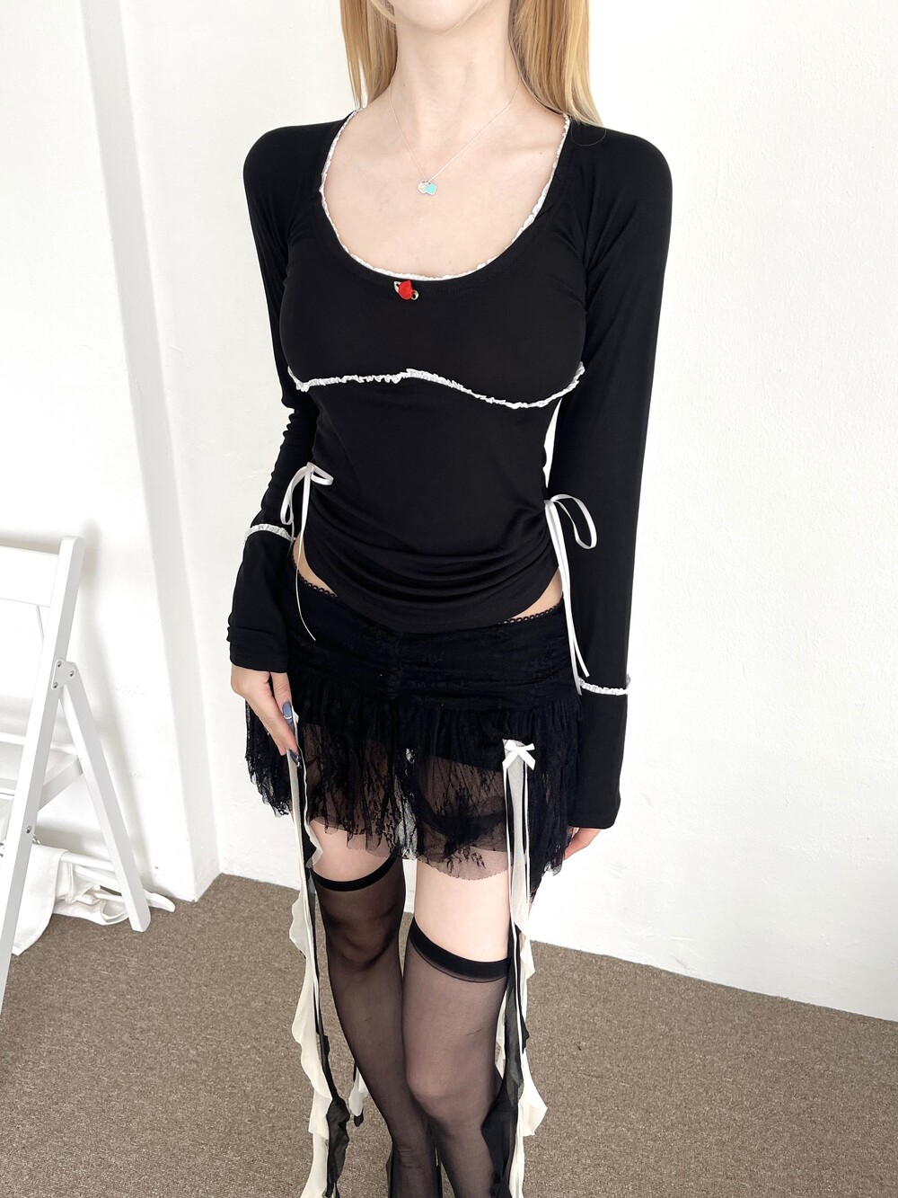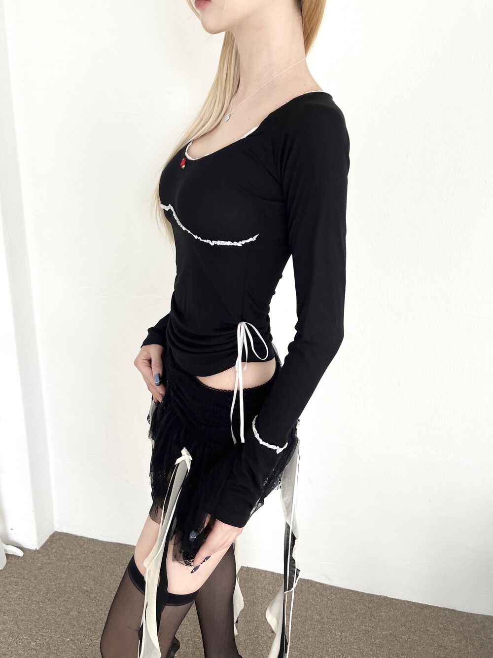 미니 코사지 포인트 투웨이 셔링 리본 티셔츠