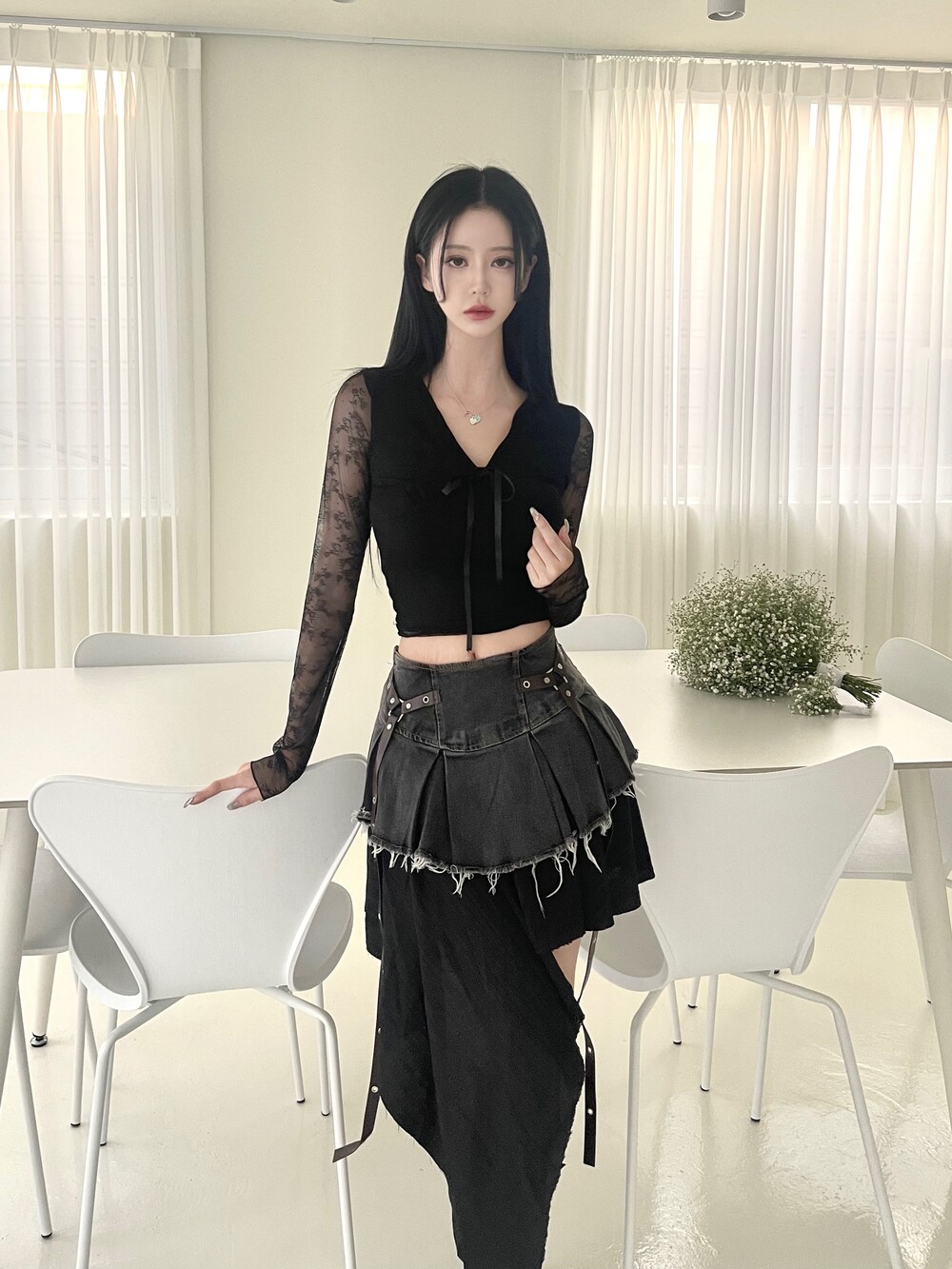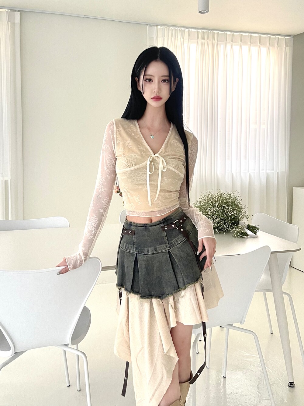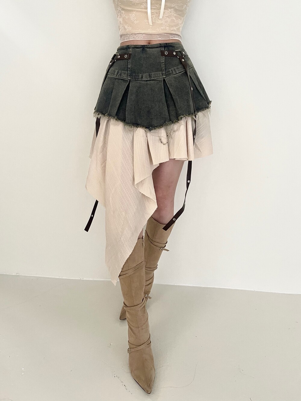데님 러플 언발 스커트