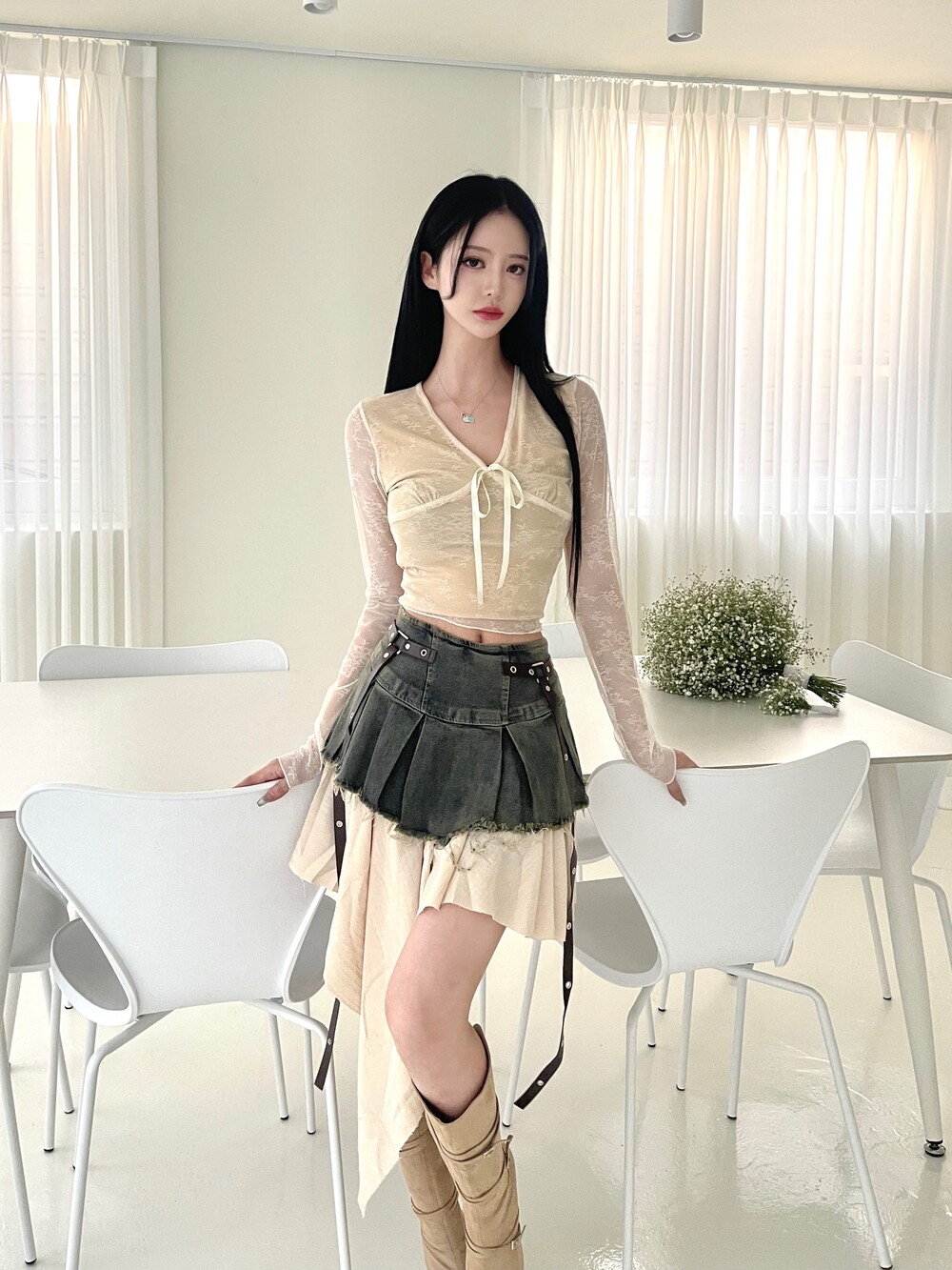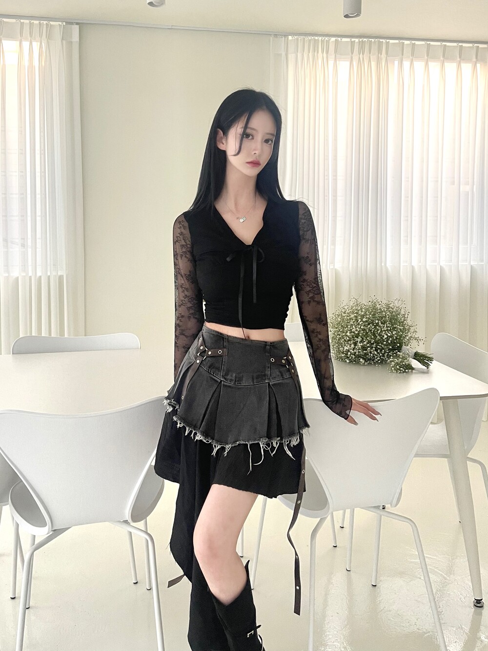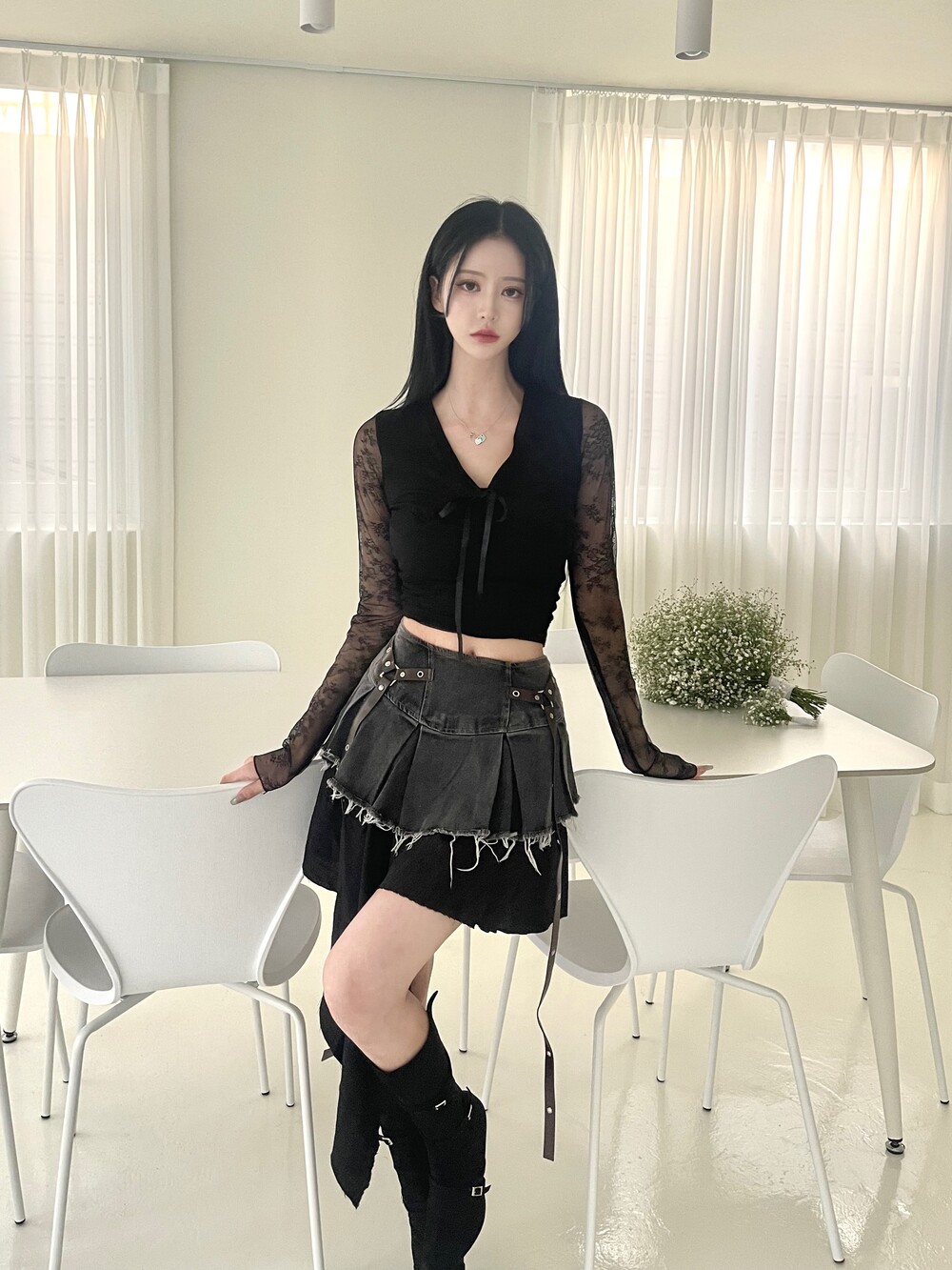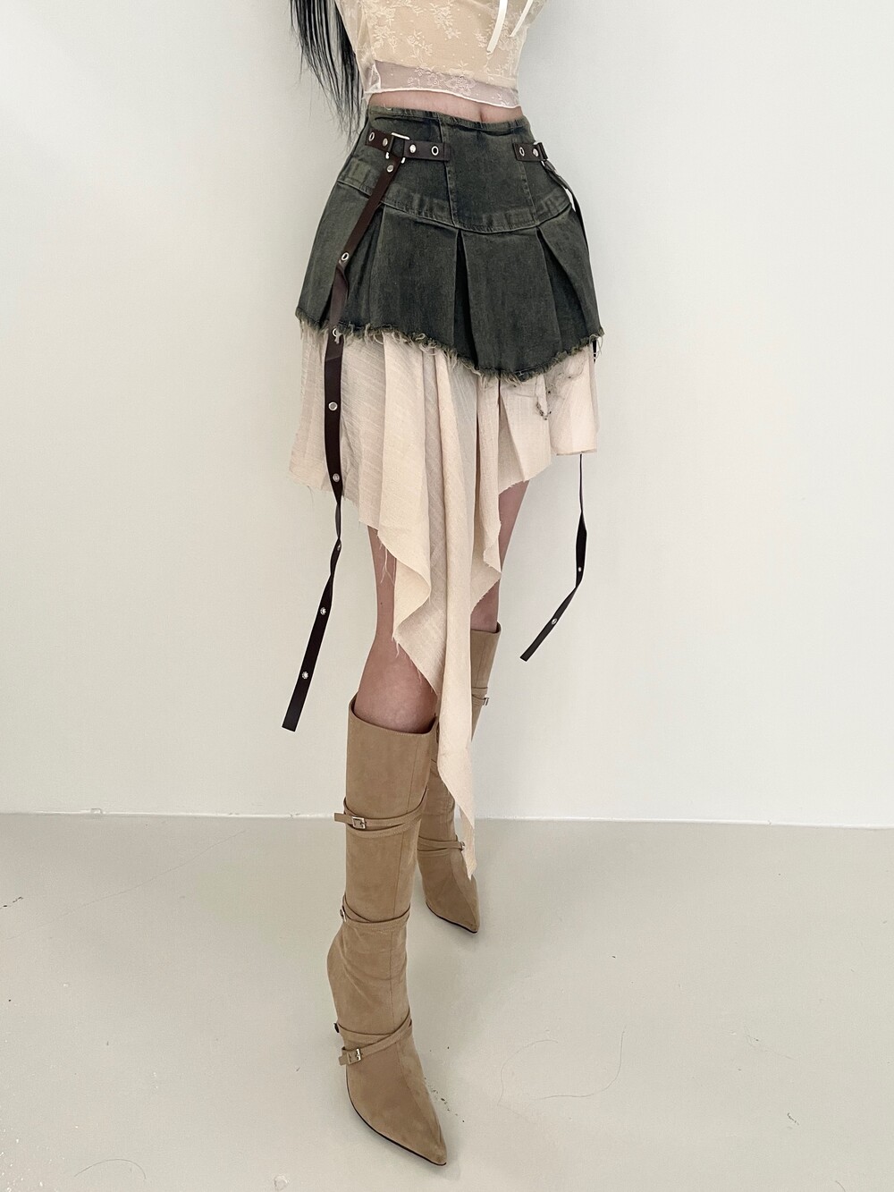 데님 데미지 플리츠 스커트에