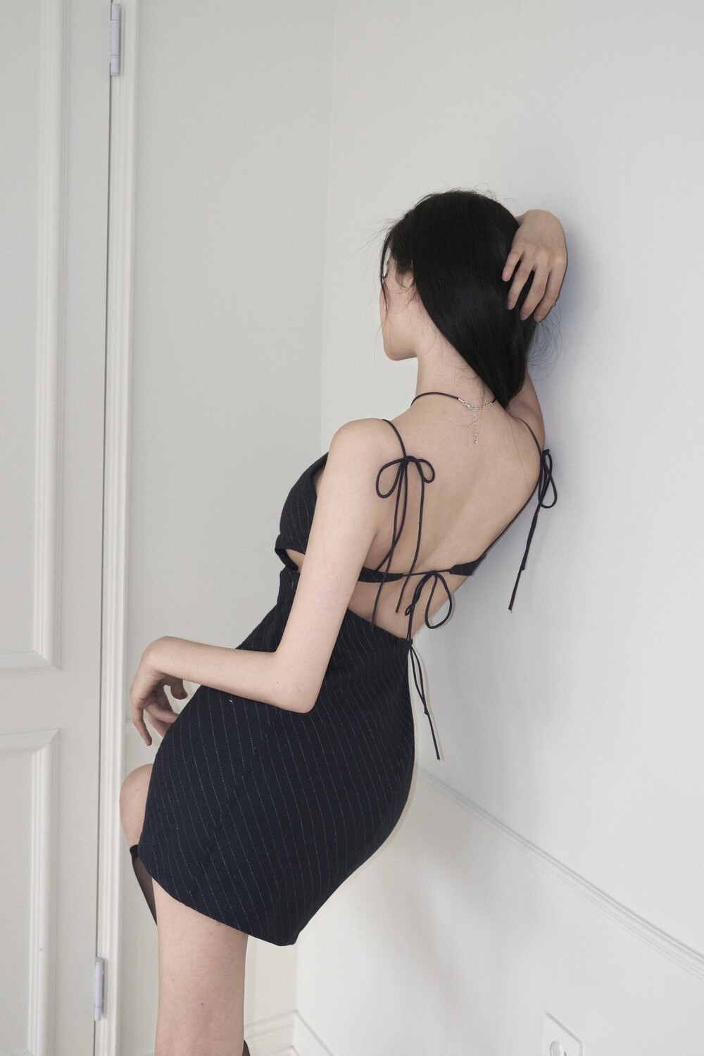 스트라이프 백리스 미니 원피스