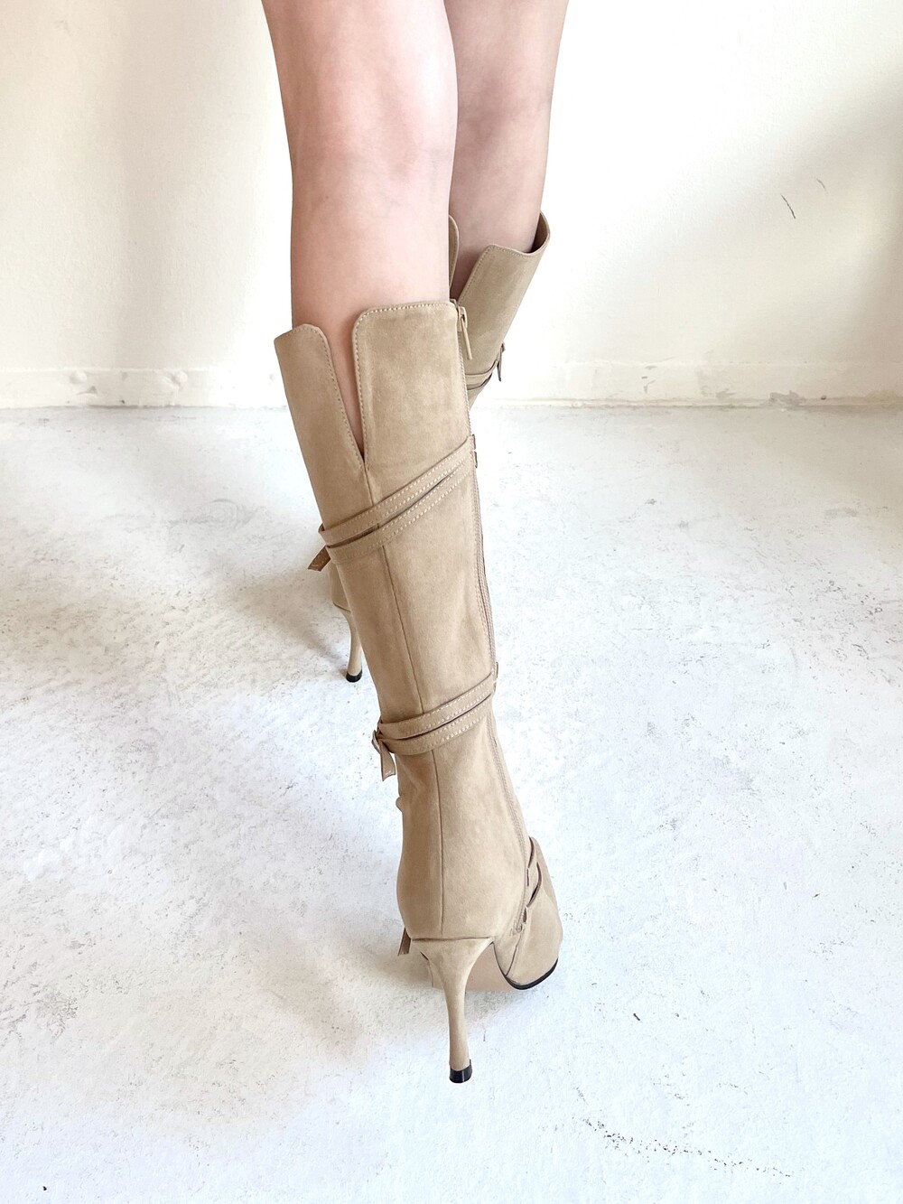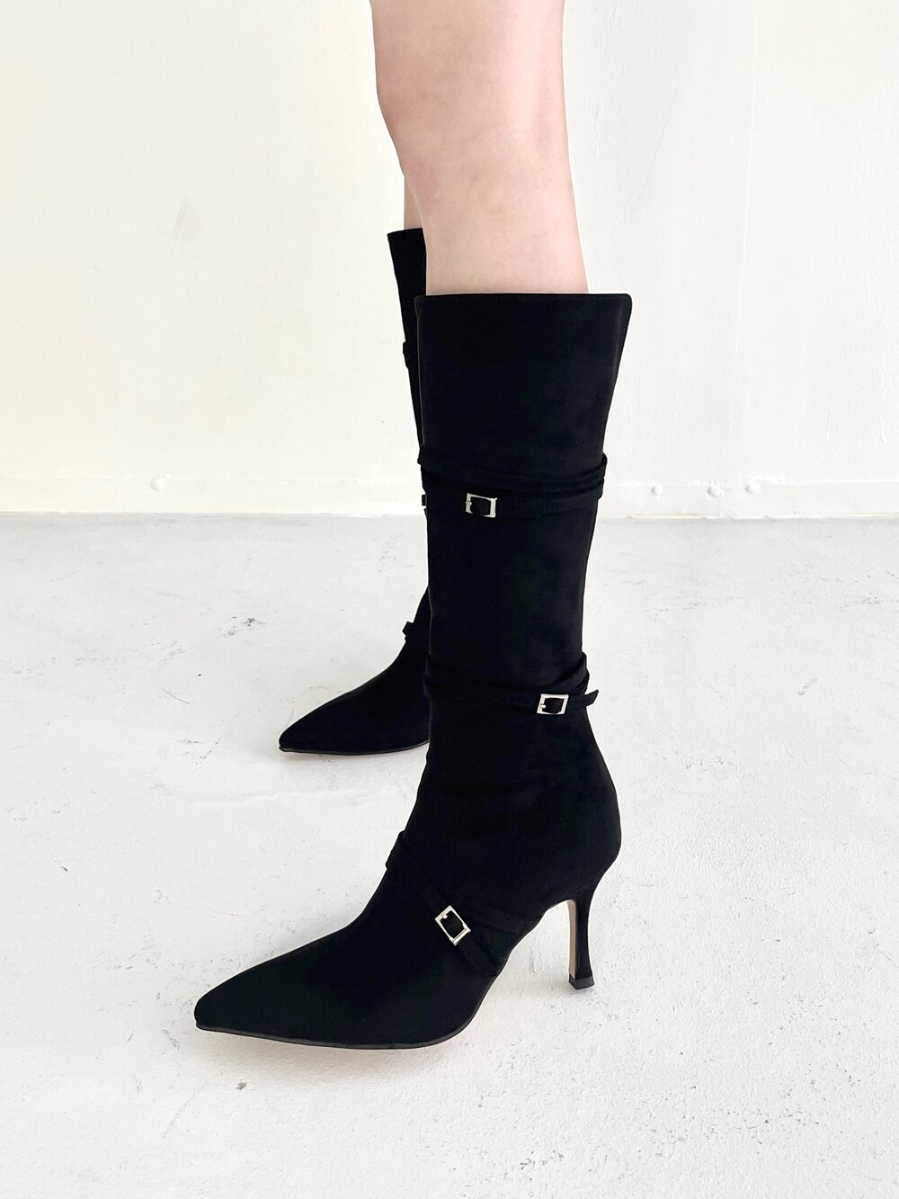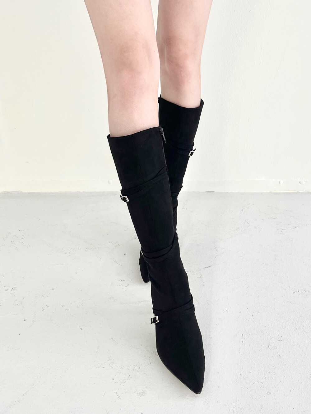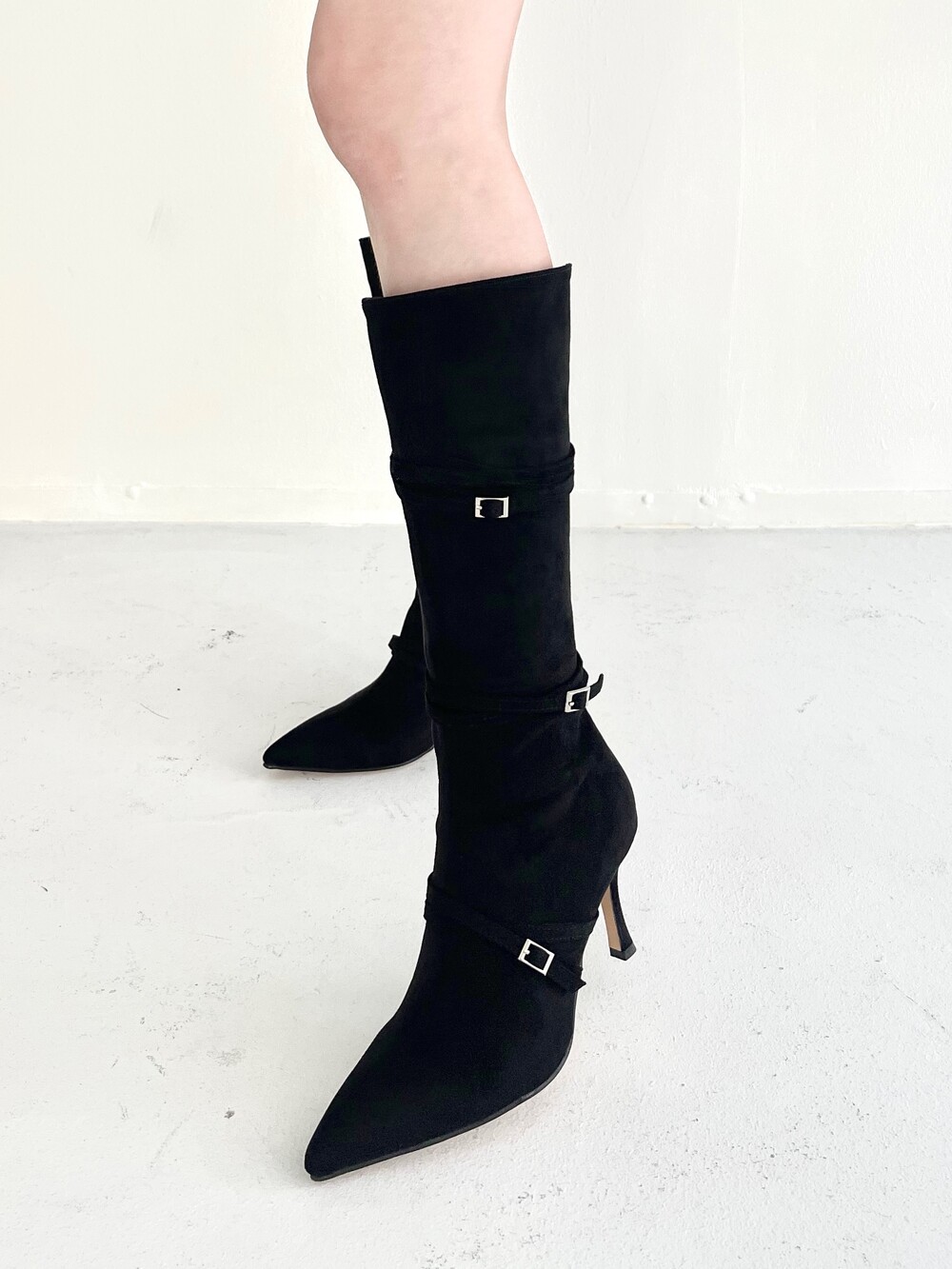스웨이드 스트랩 버클 스틸레토 롱 부츠 힐