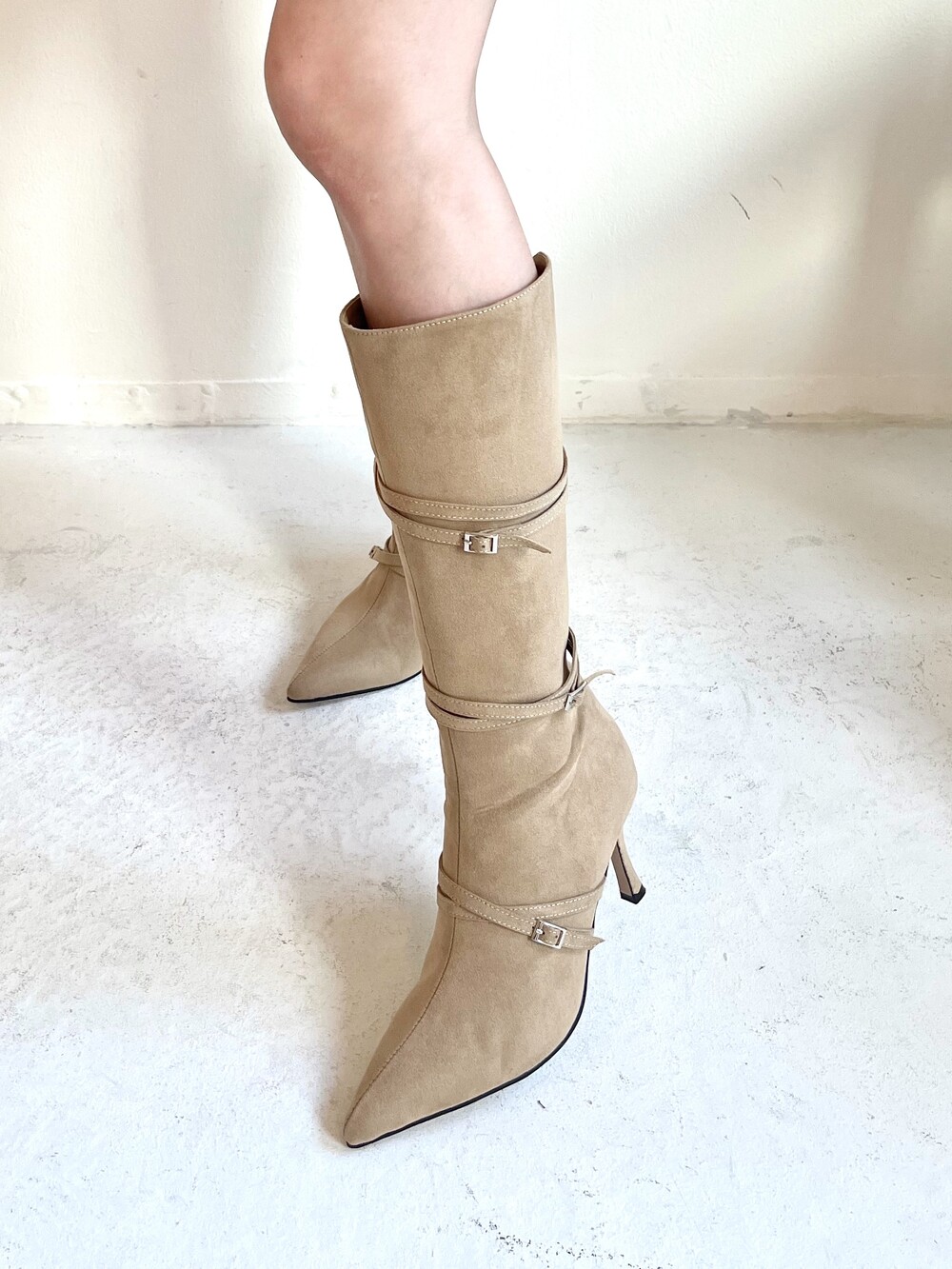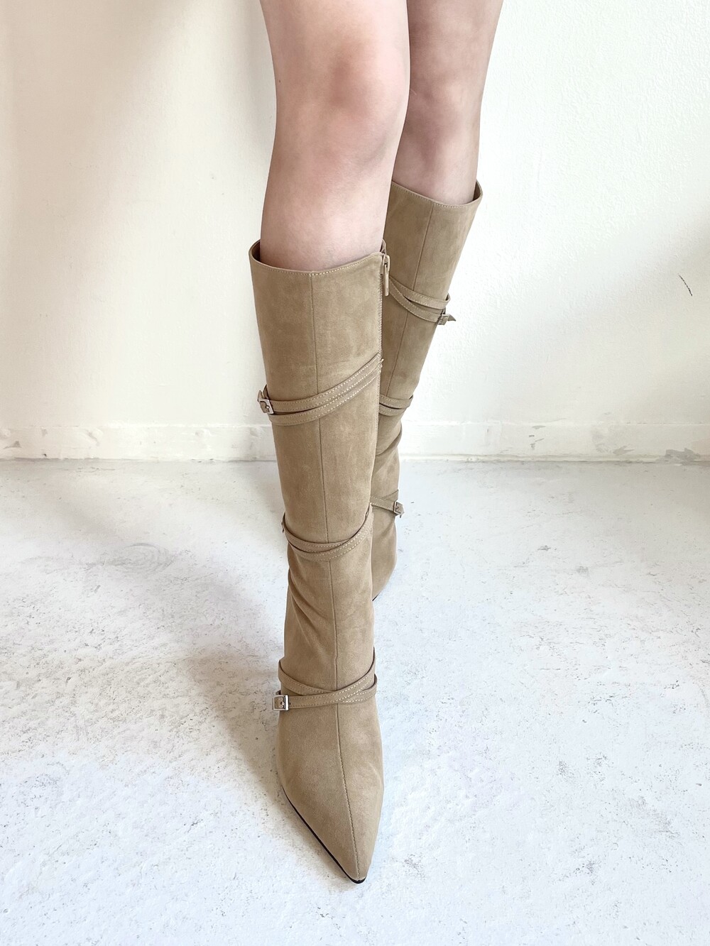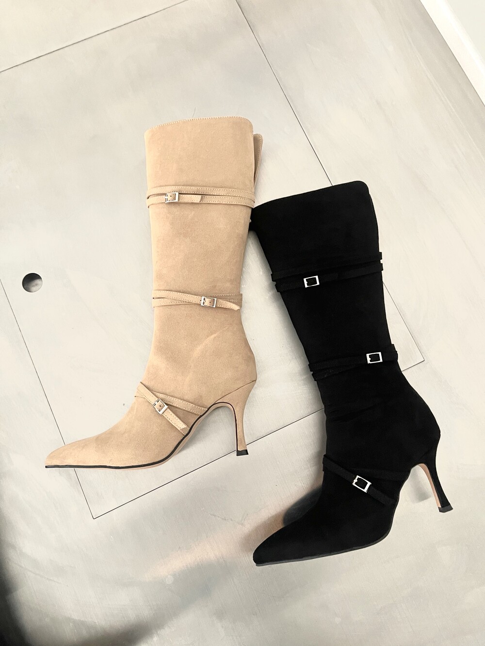 스웨이드 스트랩 버클 스틸레토 롱 부츠 힐