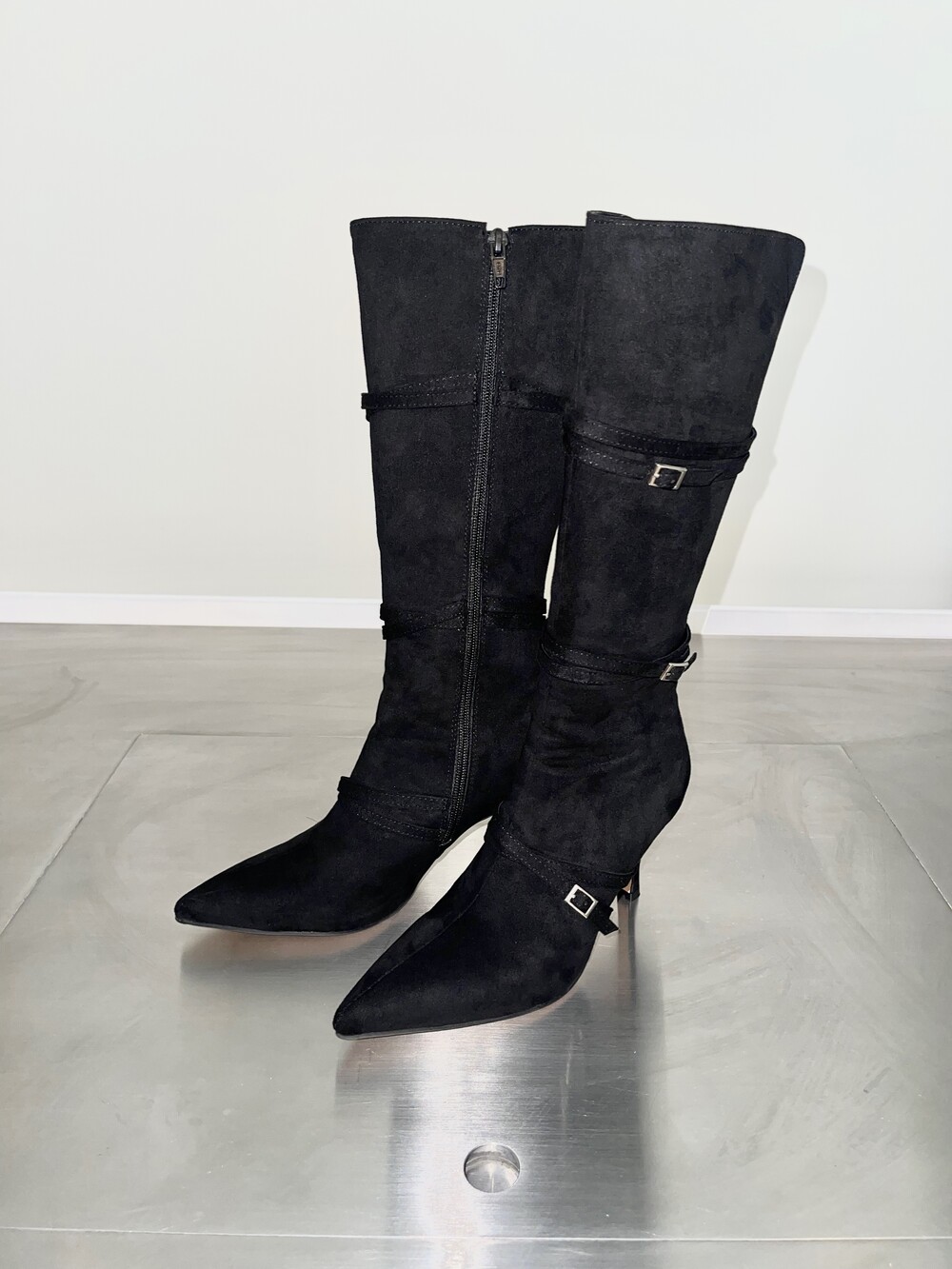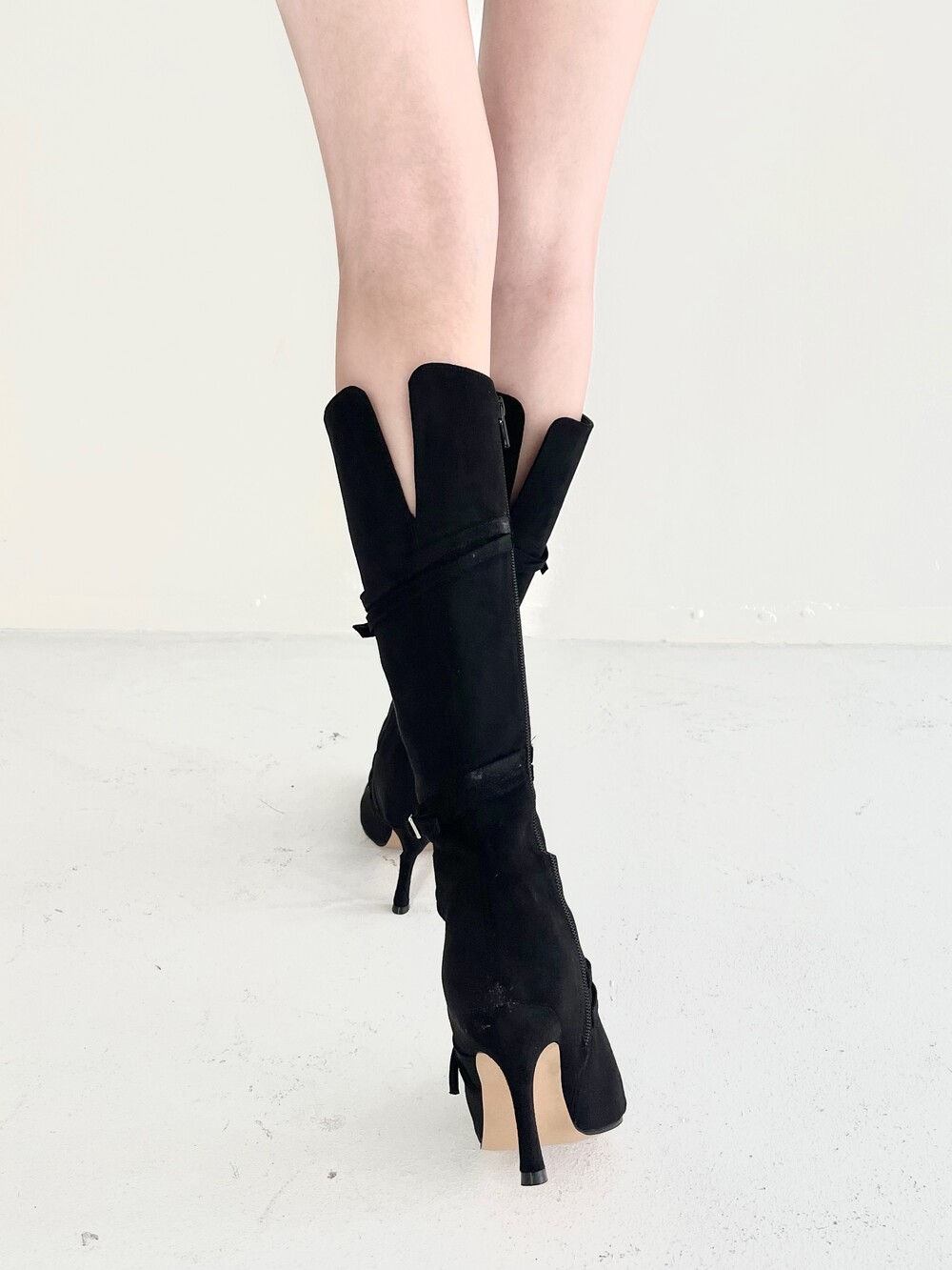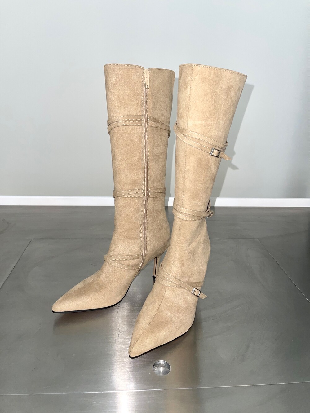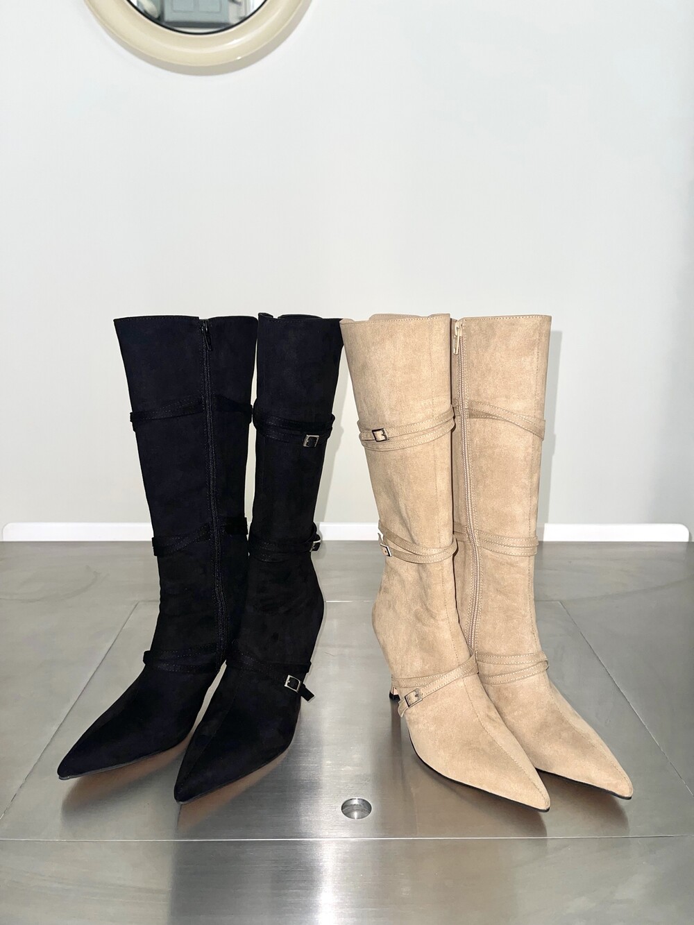 스웨이드 스트랩 버클 스틸레토 롱 부츠 힐