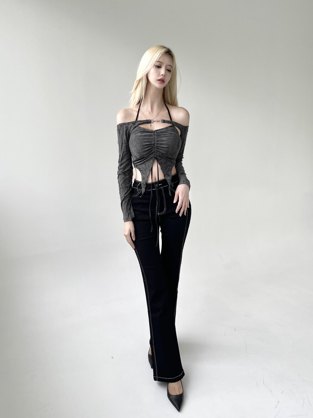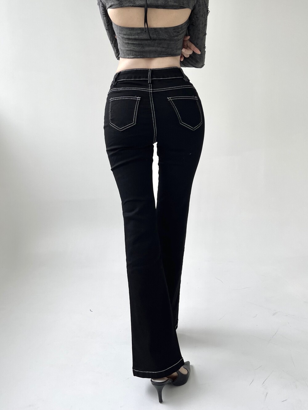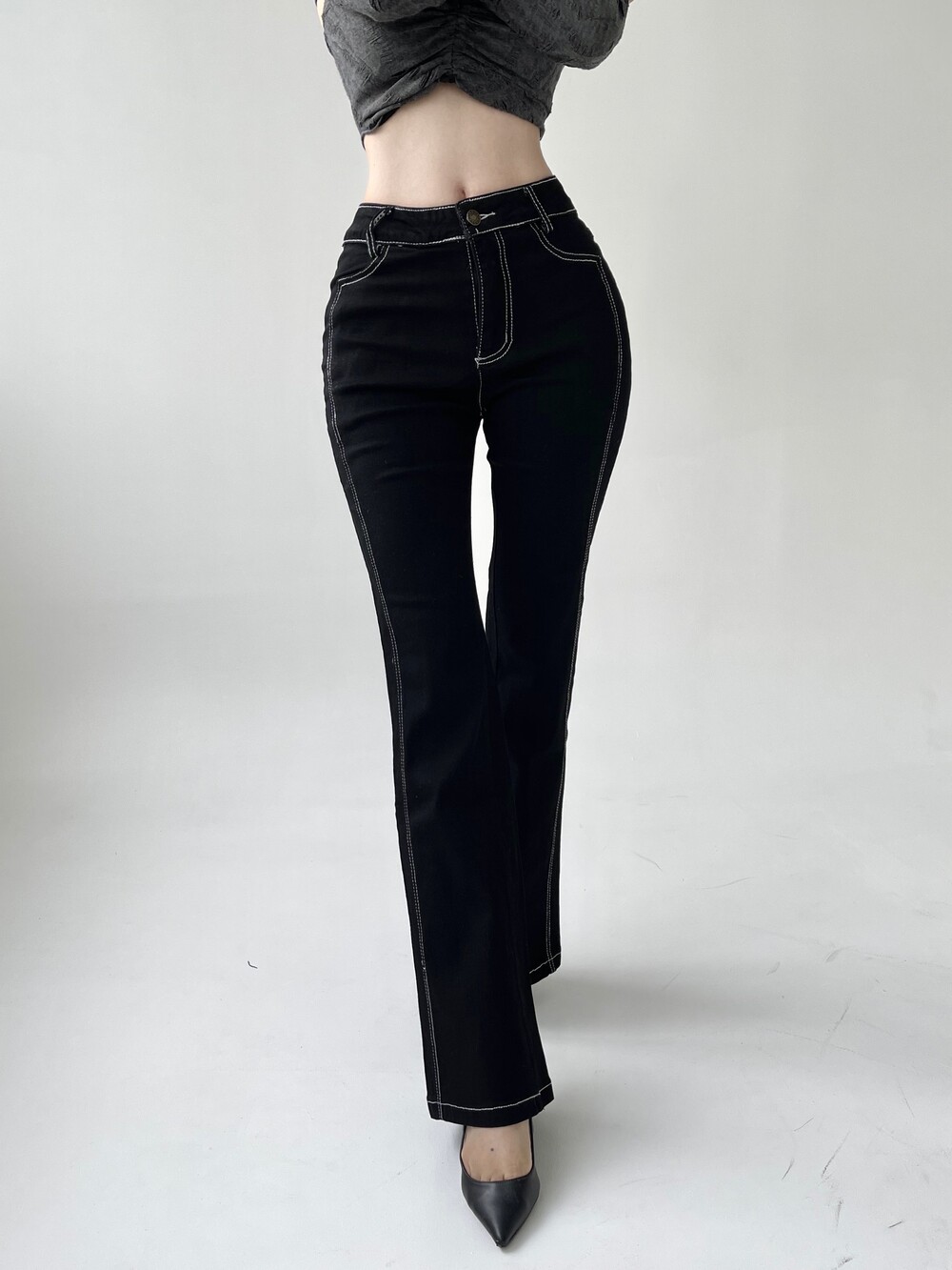 블랙 스티치 스판 롱 부츠컷 팬츠