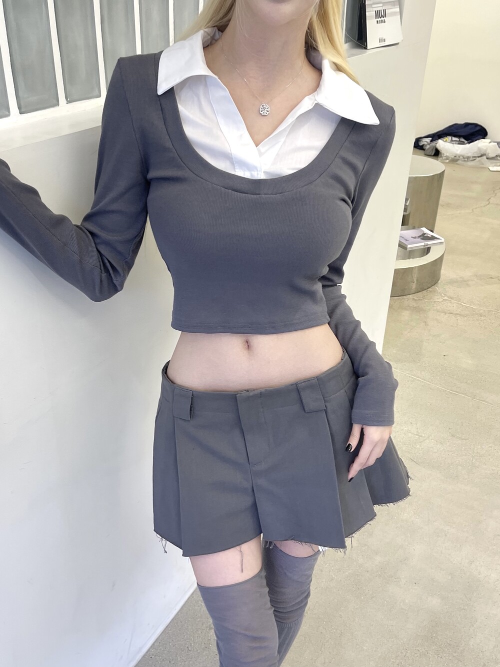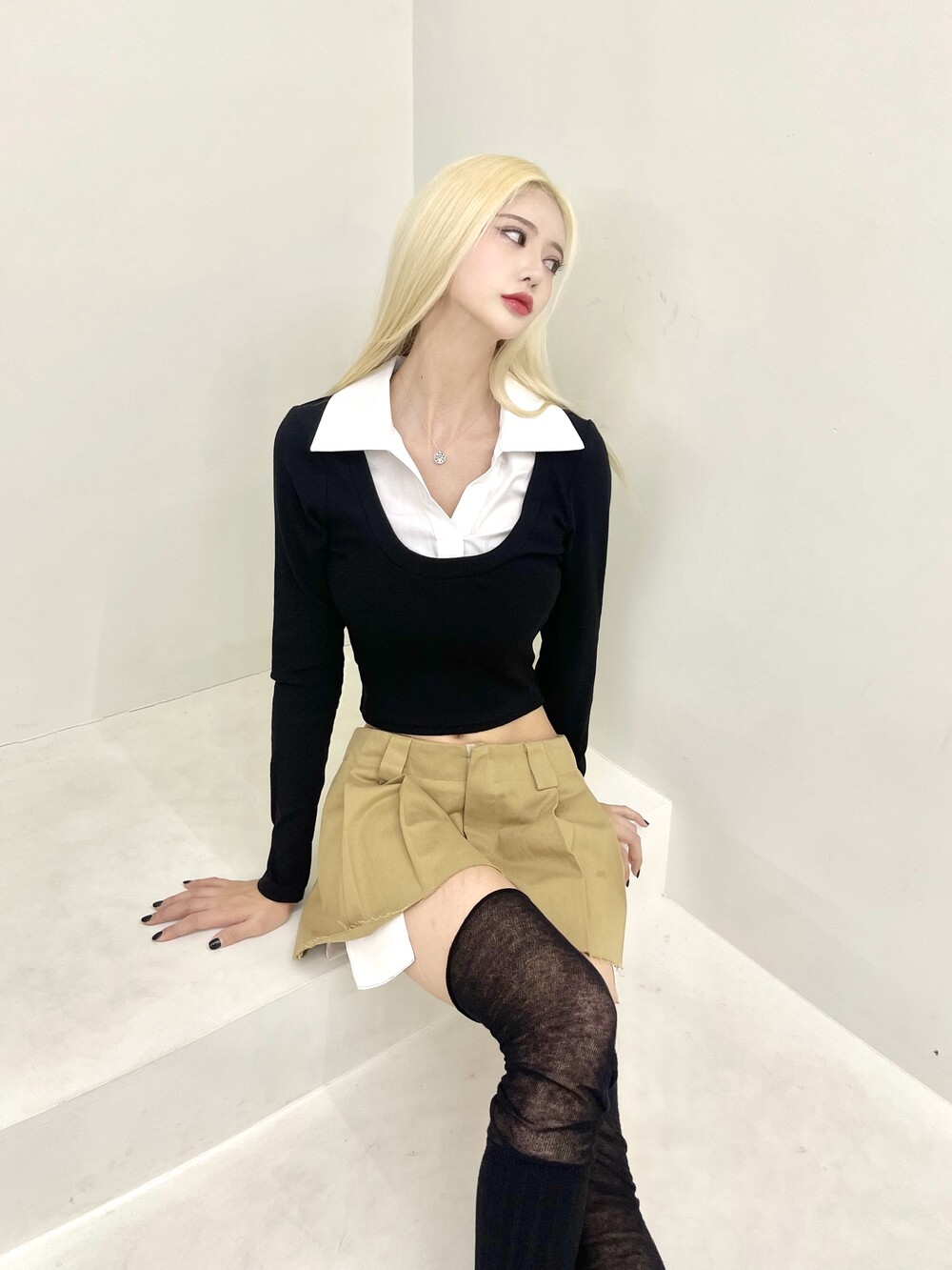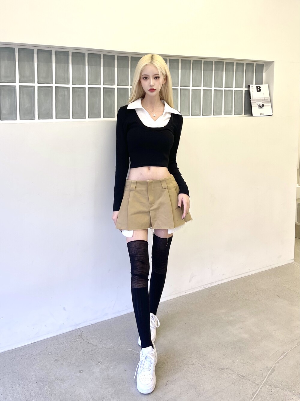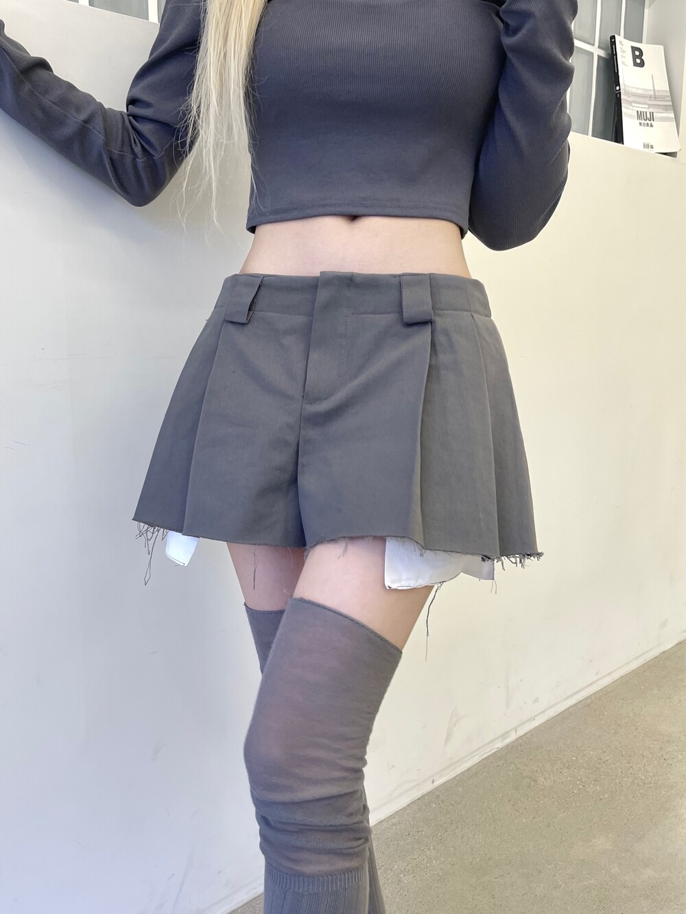 로우라이드 셔츠 레이어드 벨트 미니 핀턱 스커트팬츠