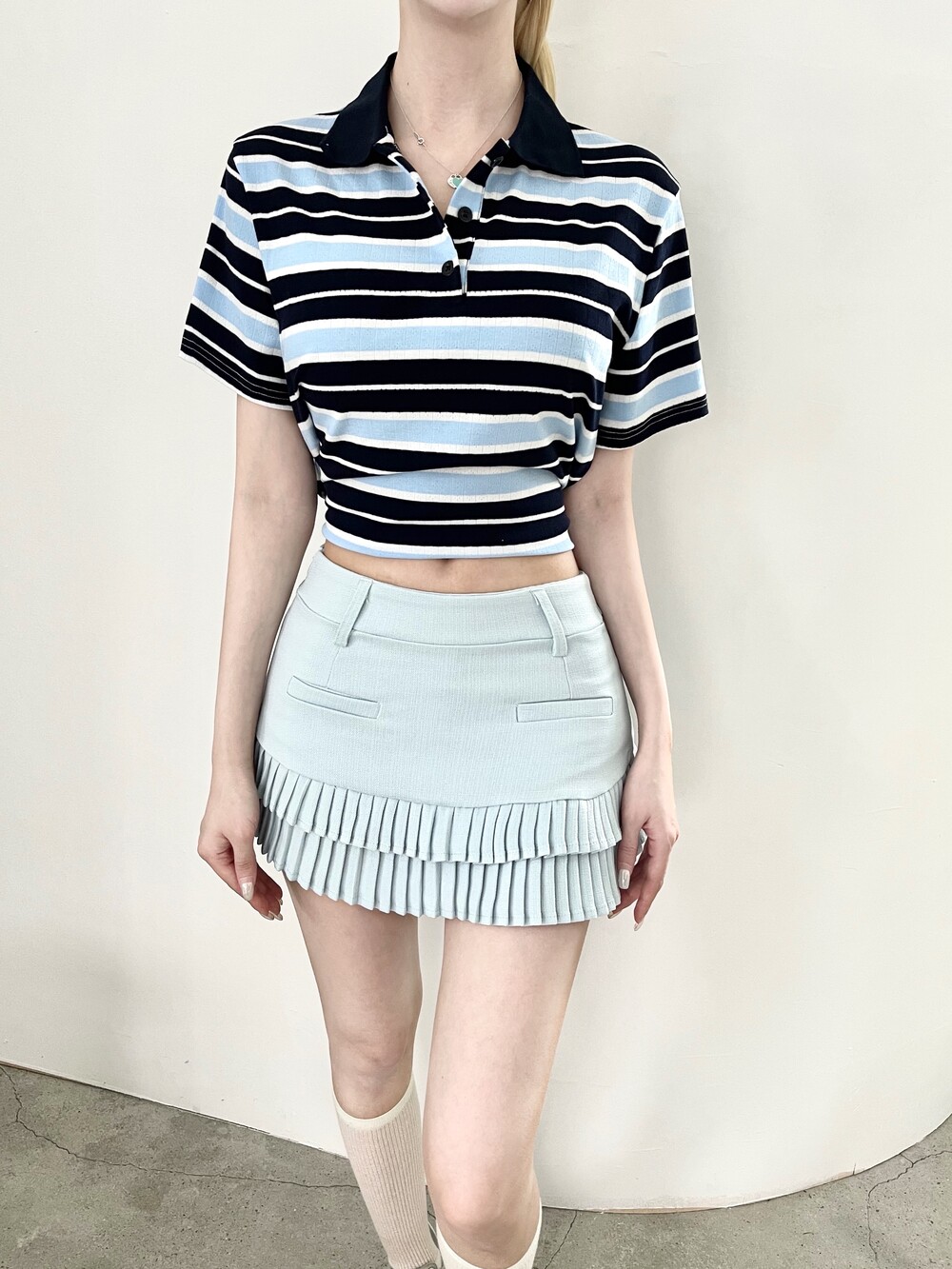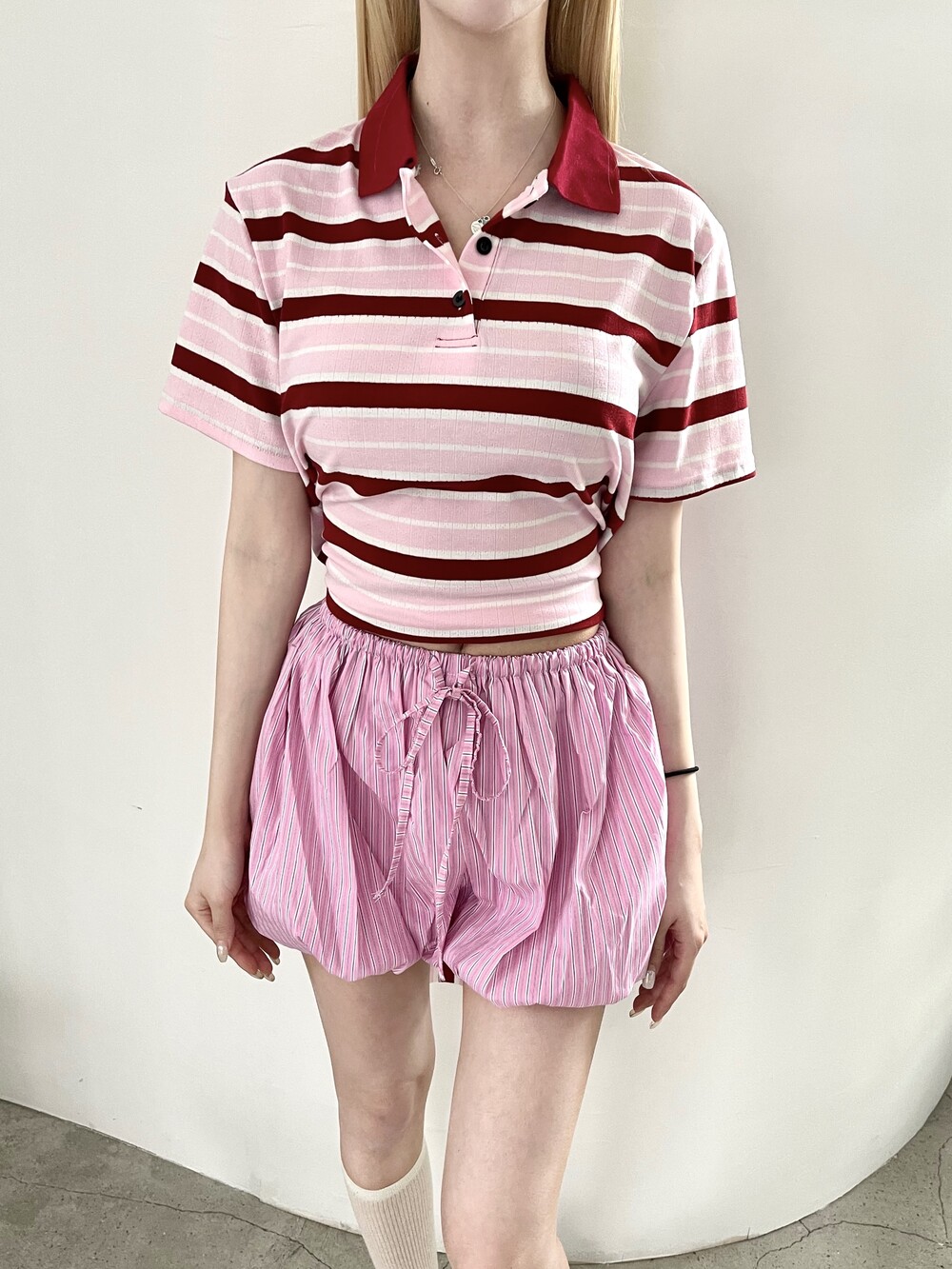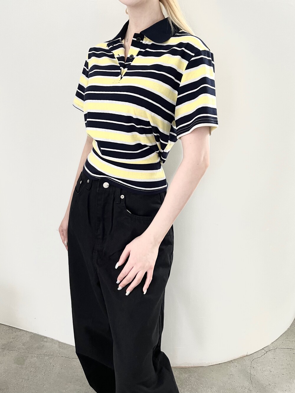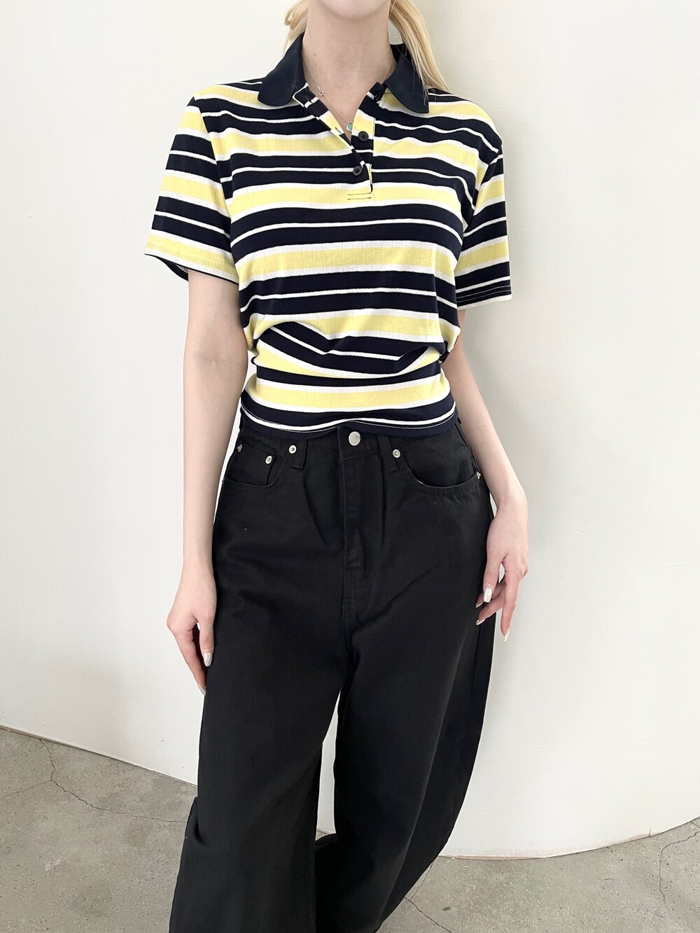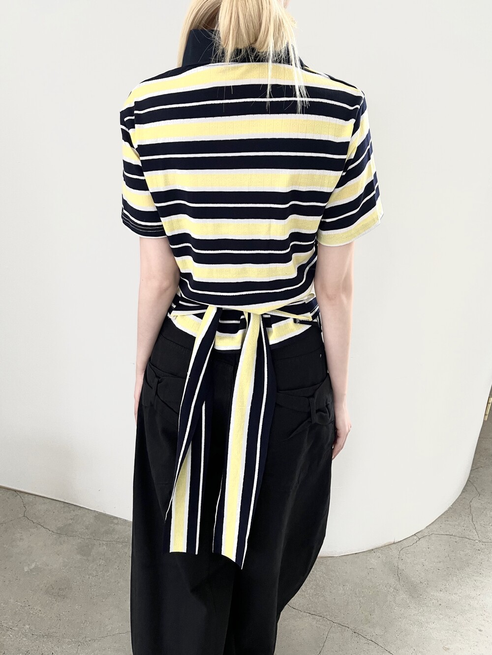 1472. 럭비 스트라이프 카라 리본 하프 T (3color)