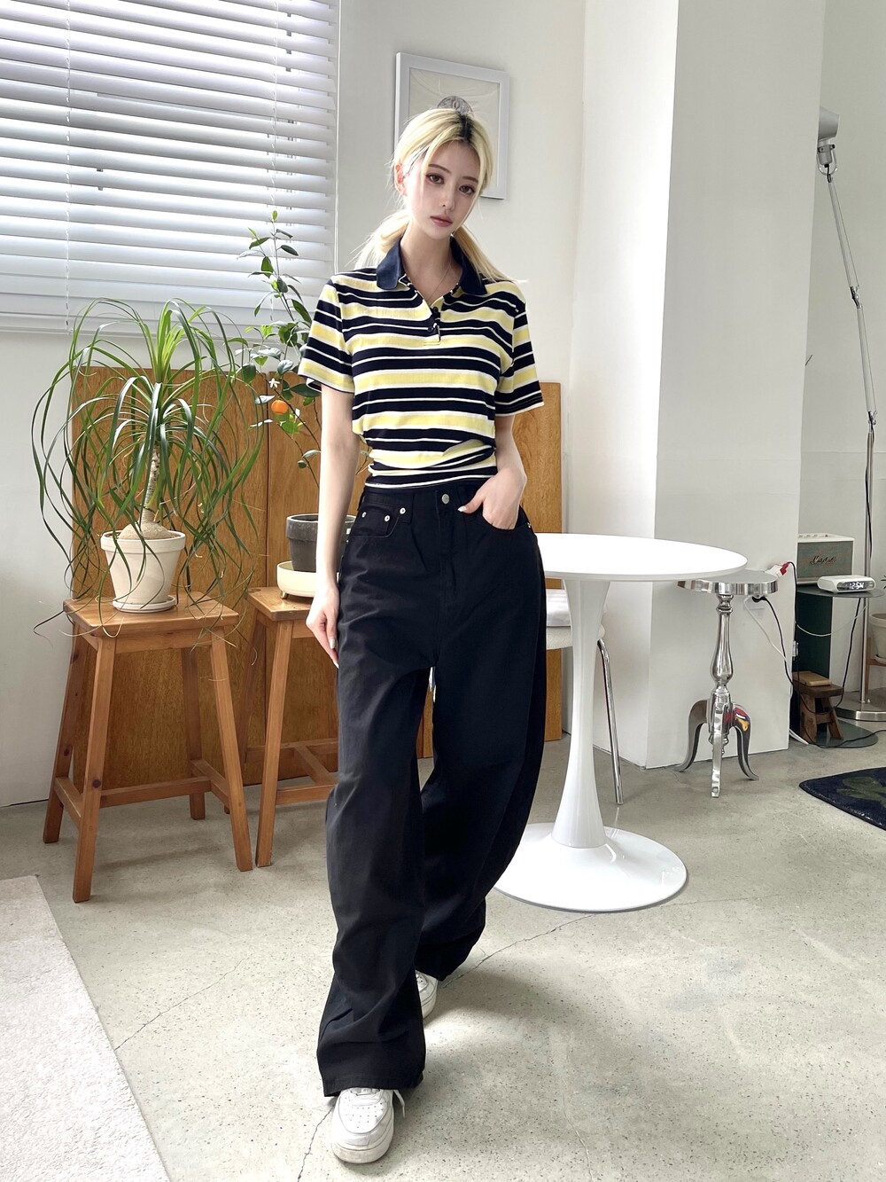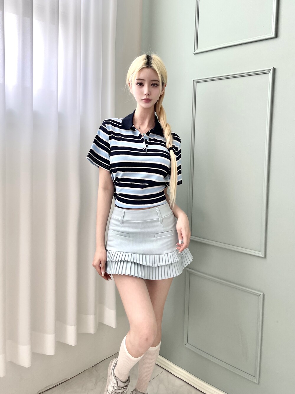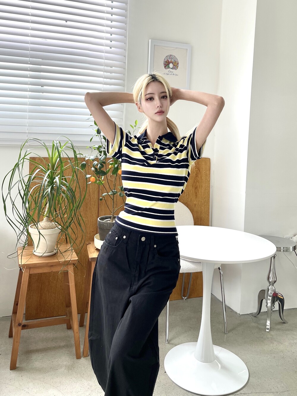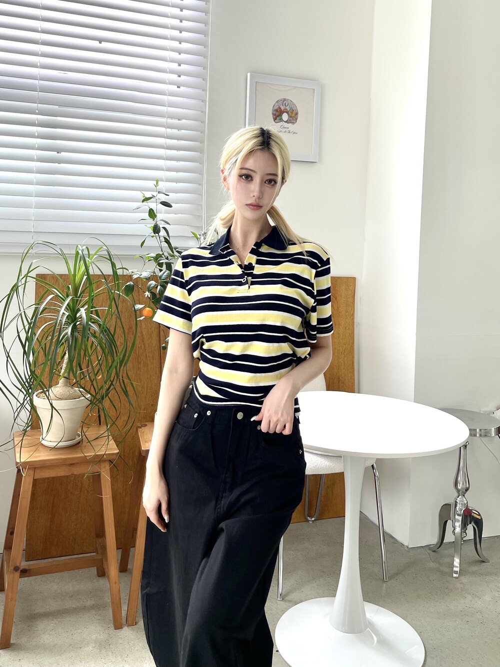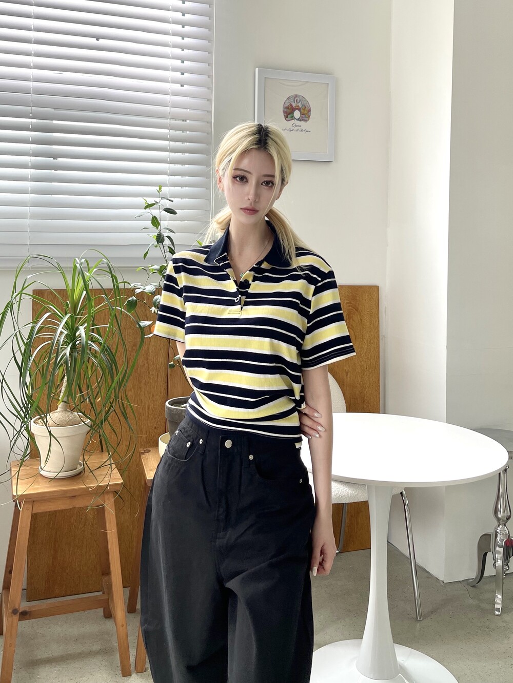 1472. 럭비 스트라이프 카라 리본 하프 T (3color)