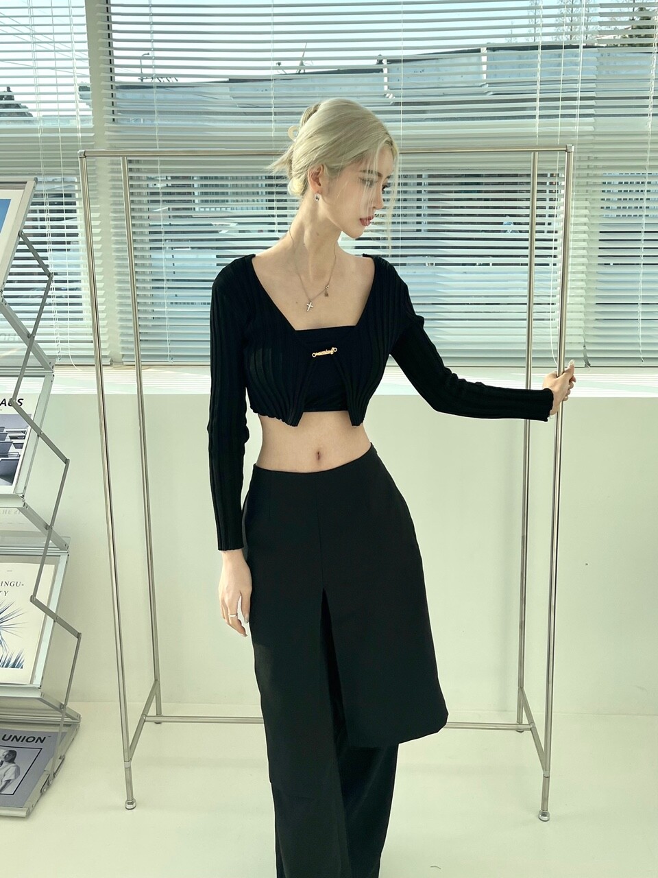 슬릿 스커트를 팬츠 위에 레이어드 하여 입은 듯 한
