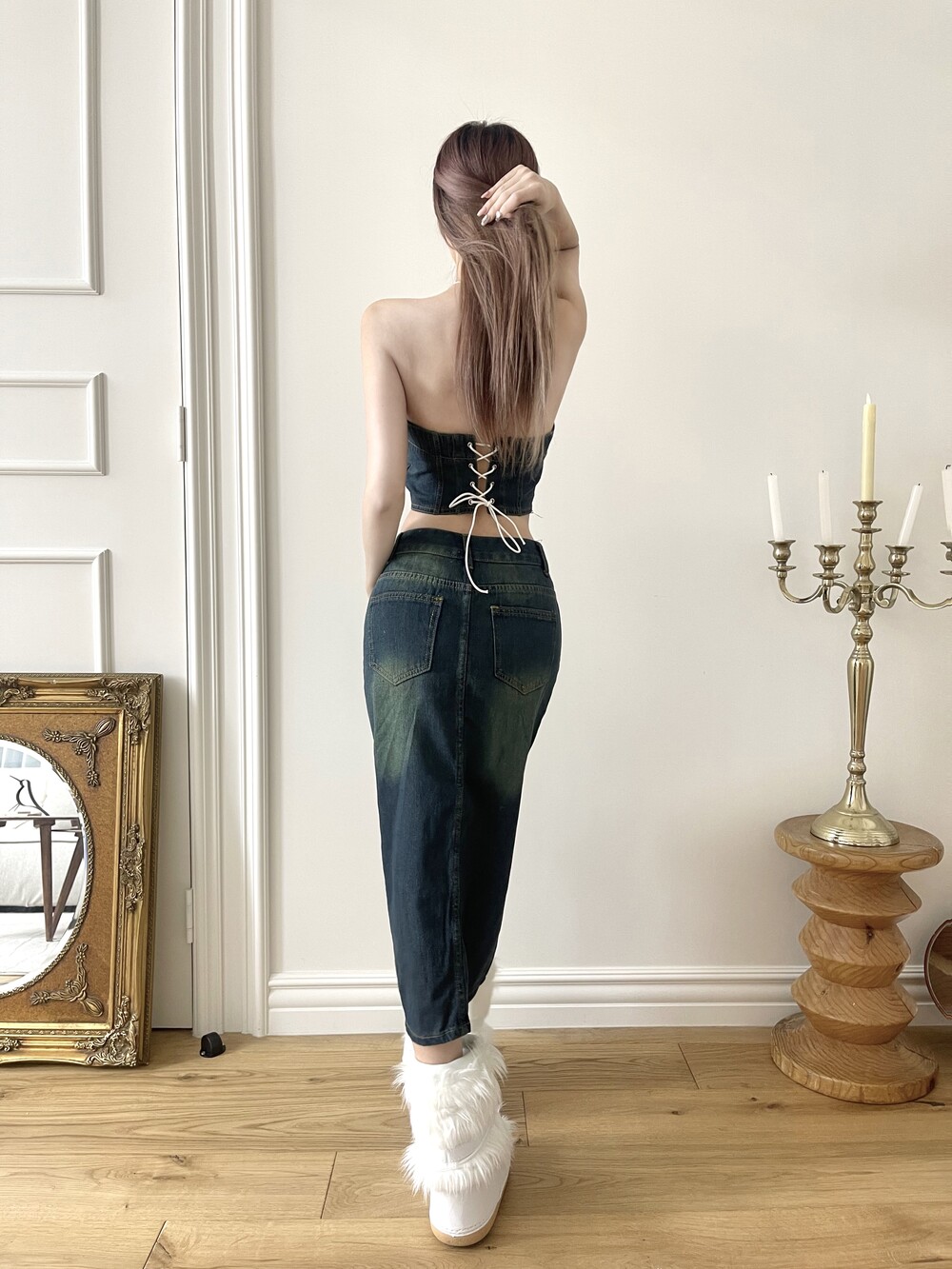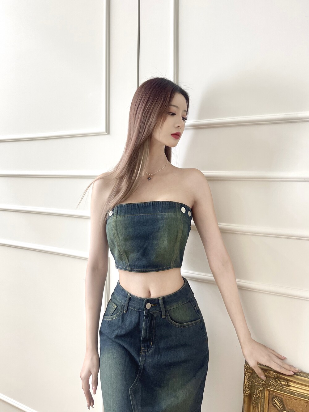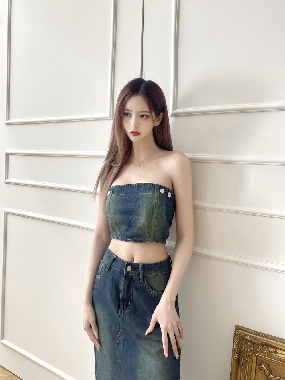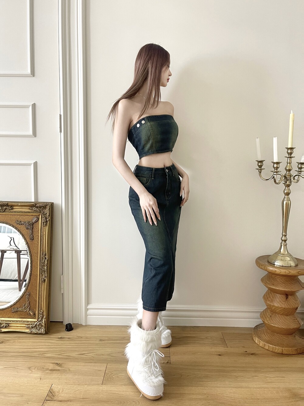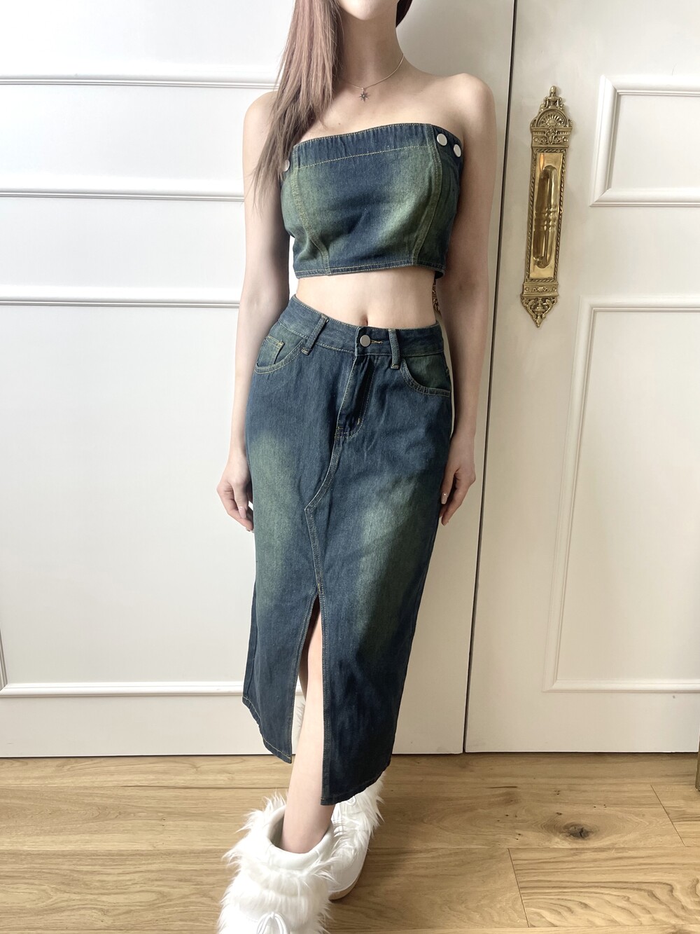 데님 튜브탑 - 슬릿 롱 스커트 투피스