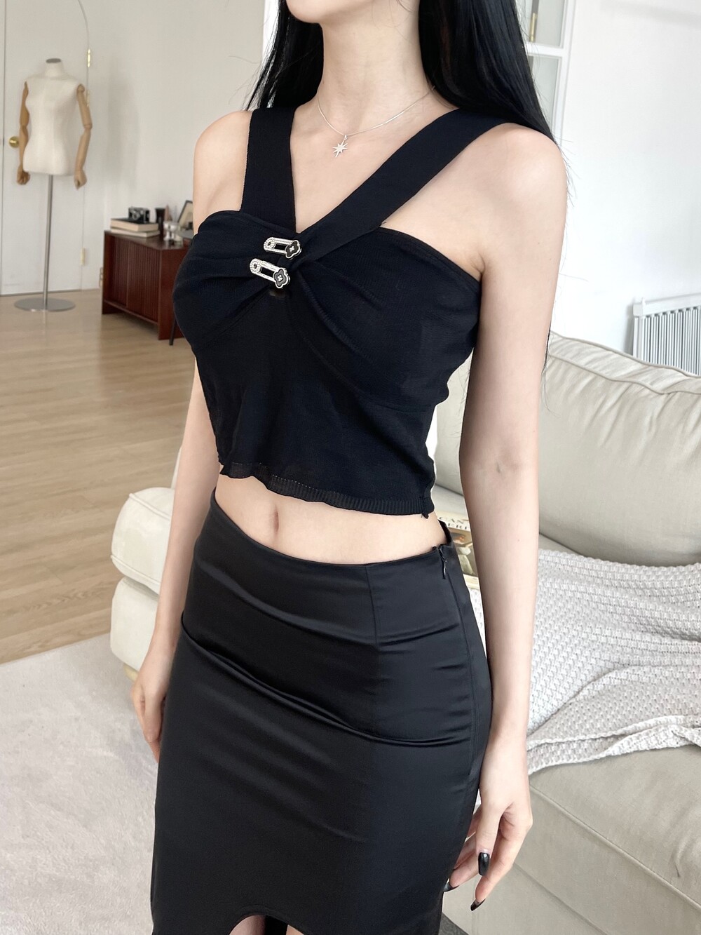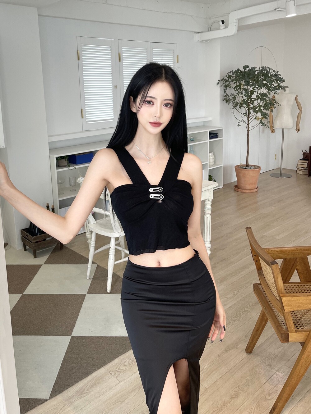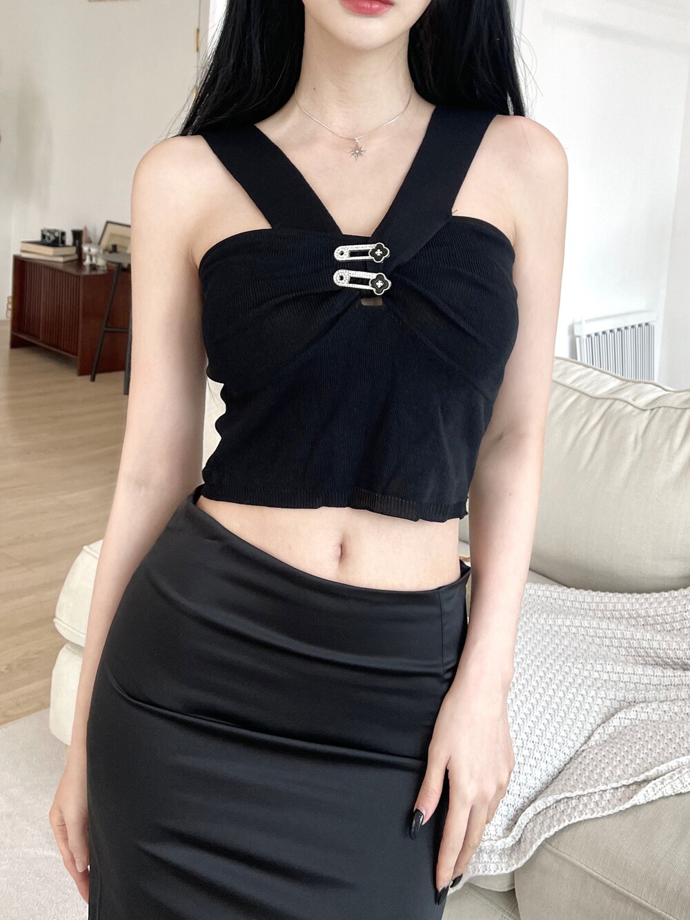 브로치 핀 브이 컷아웃 크롭 슬리브리스