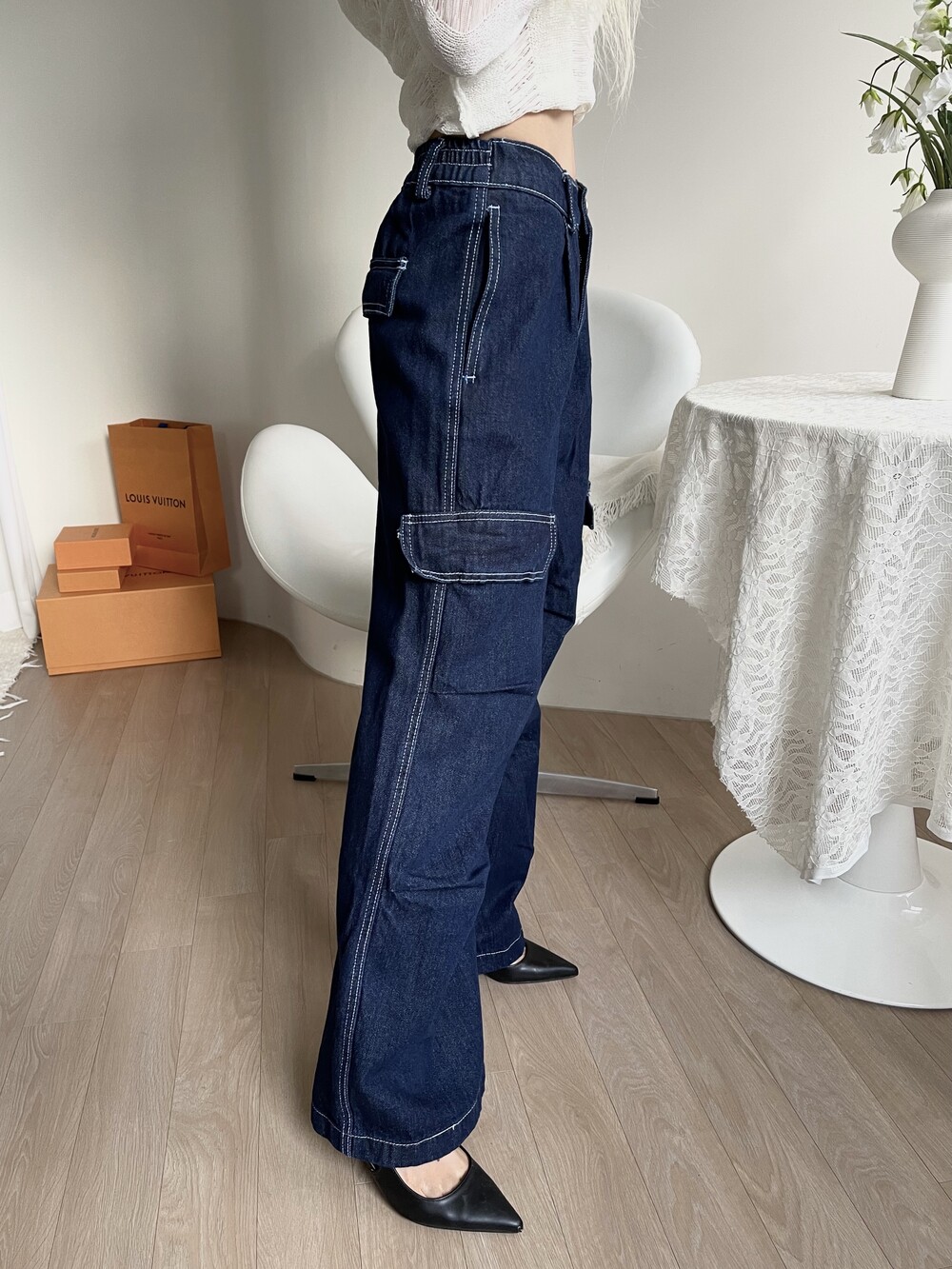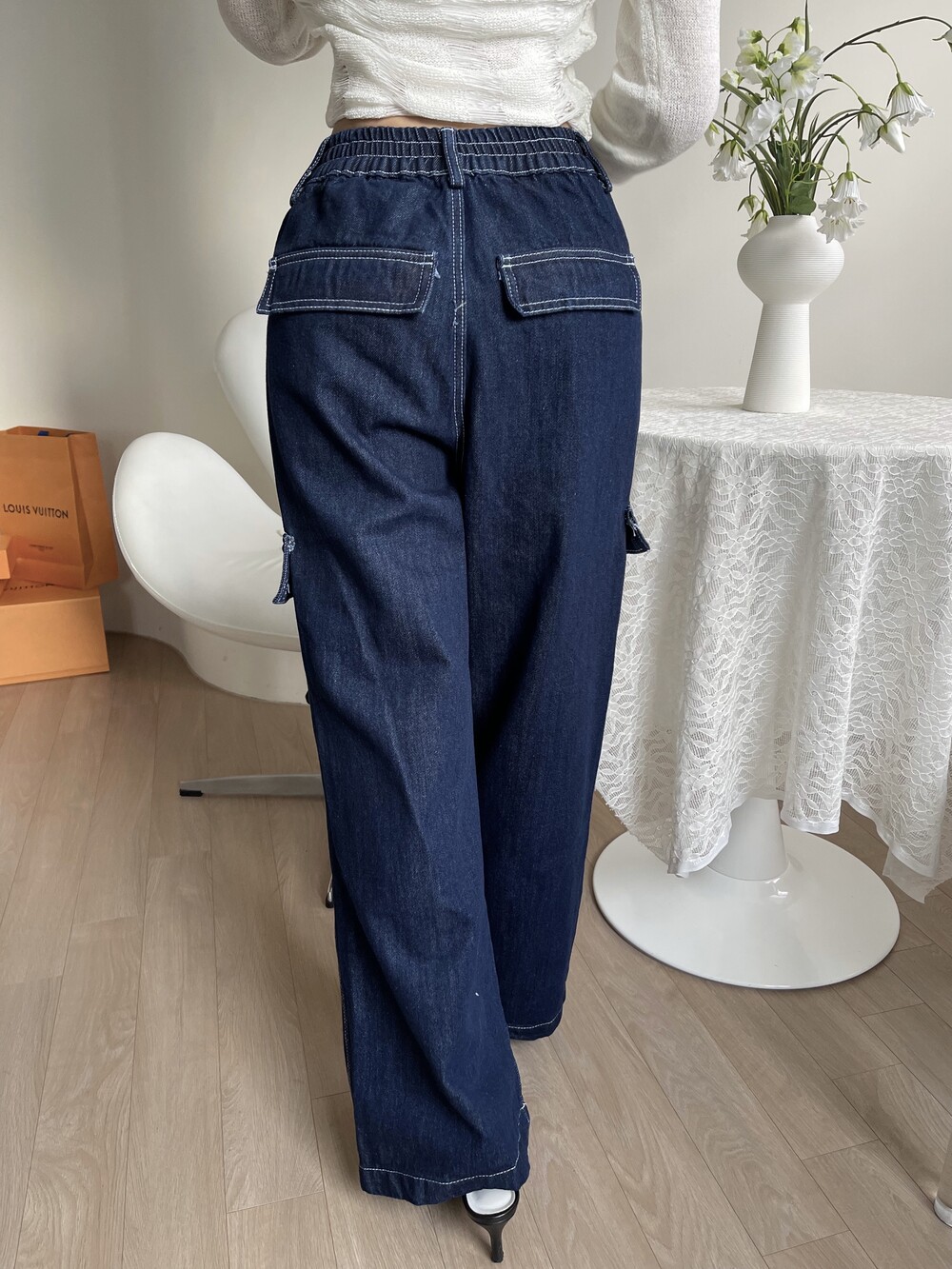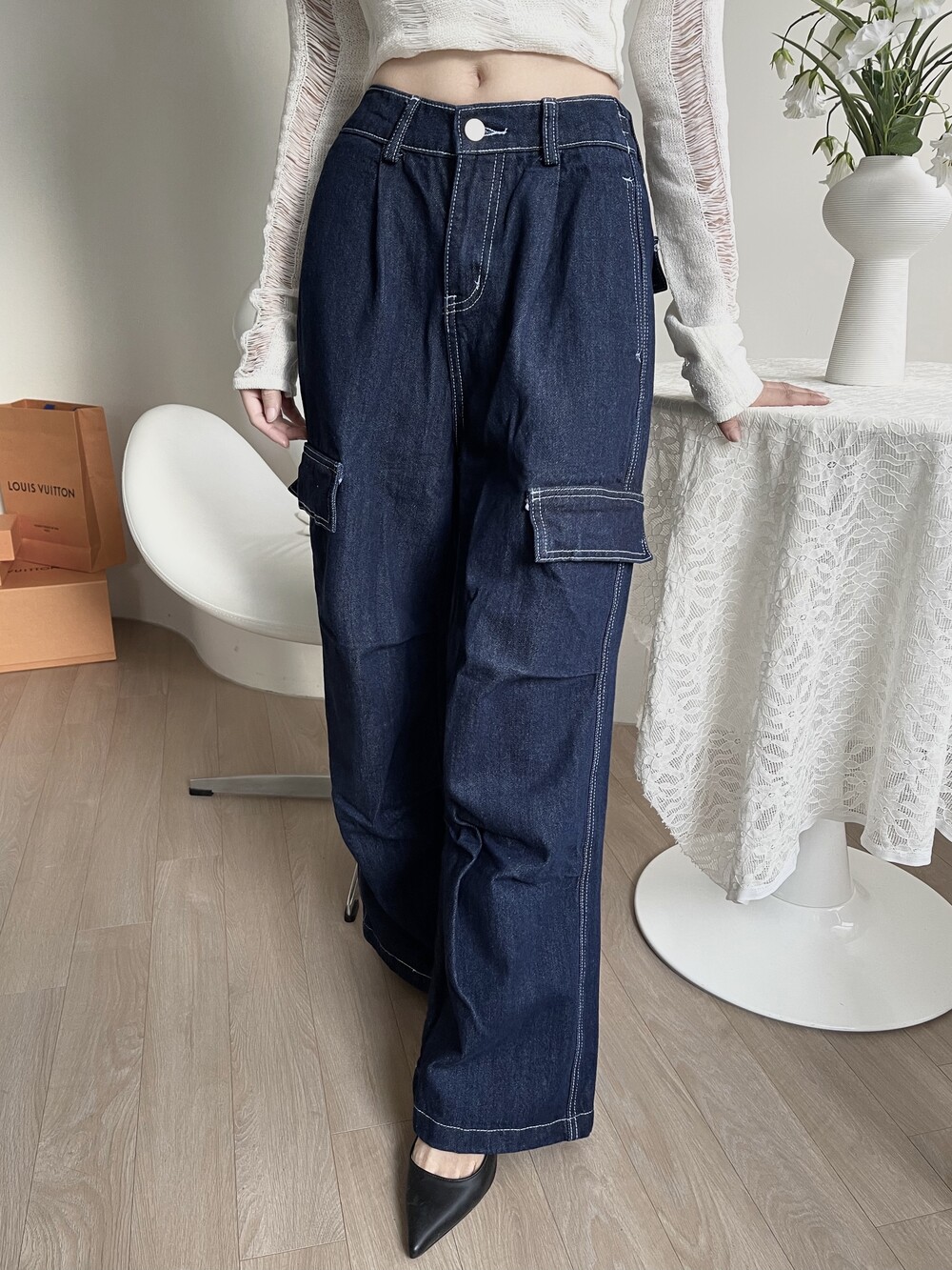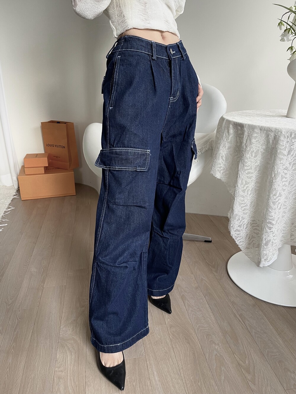 핀턱 스티치 데님 포켓 와이드 팬츠