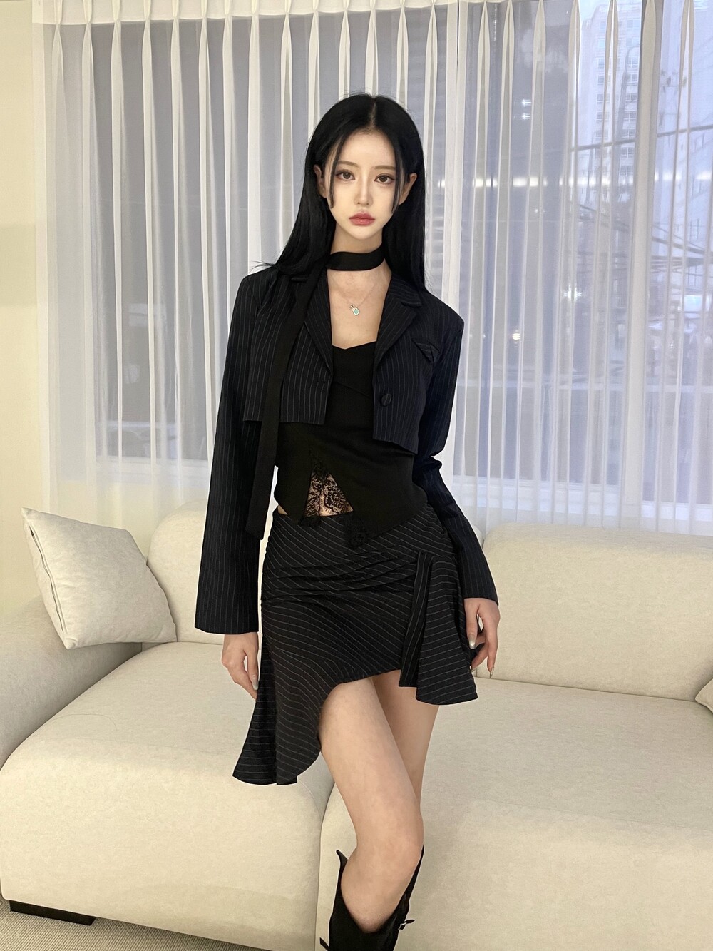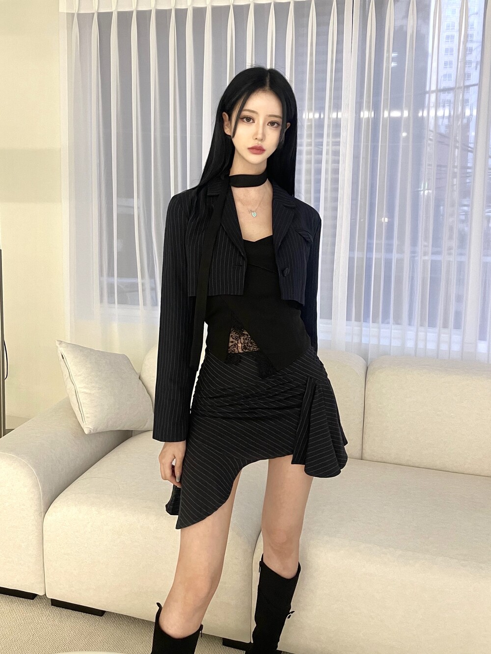 스트라이프 자켓과 스커트, 탑과 스카프가 세트 구성