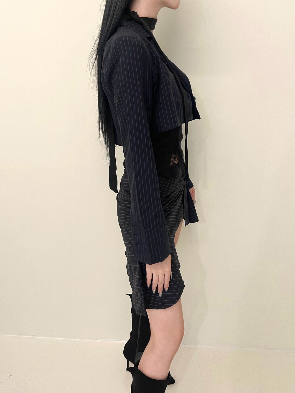 스트라이프 자켓 - 스커트 - 레이스 탑 - 스카프 세트