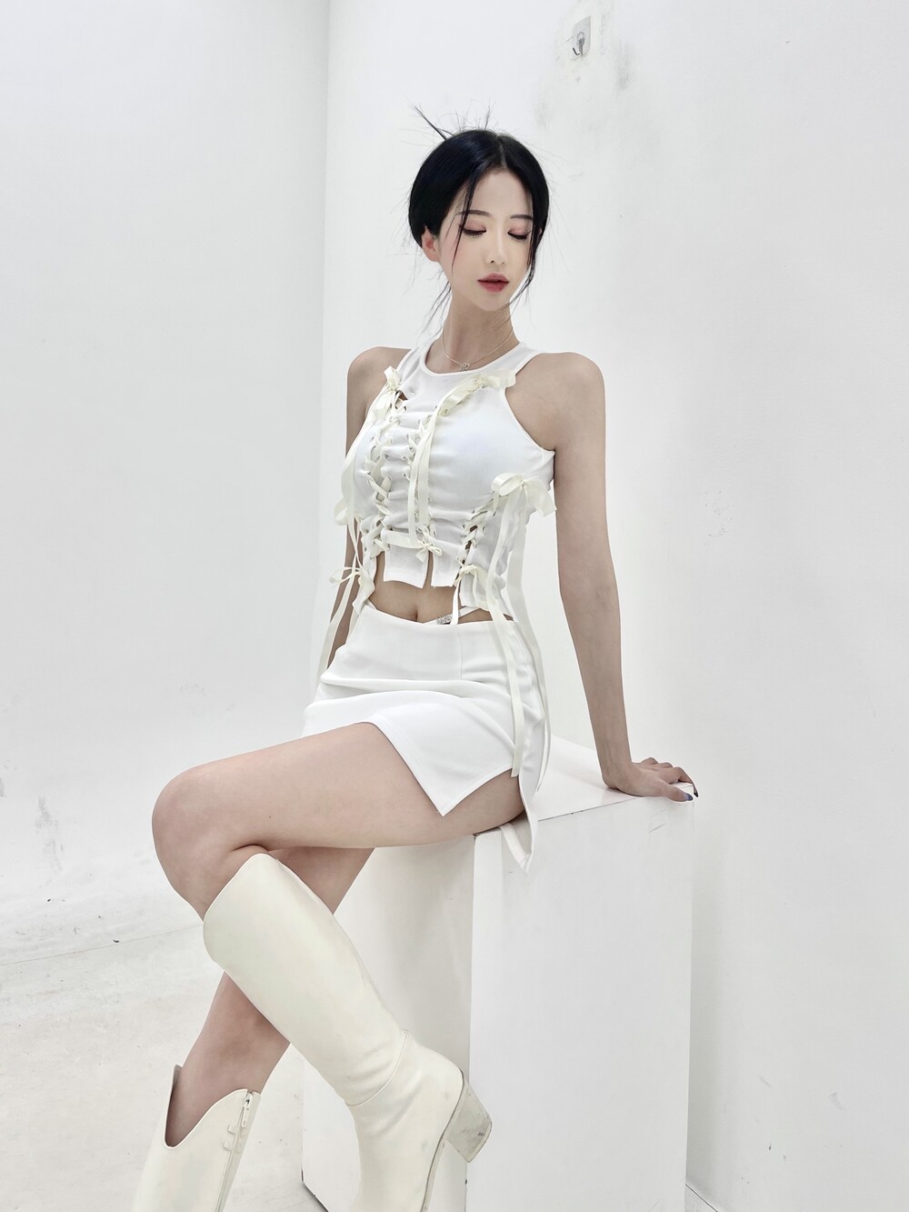 리본 슬릿 크롭 슬리브리스