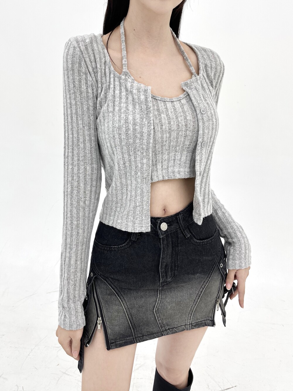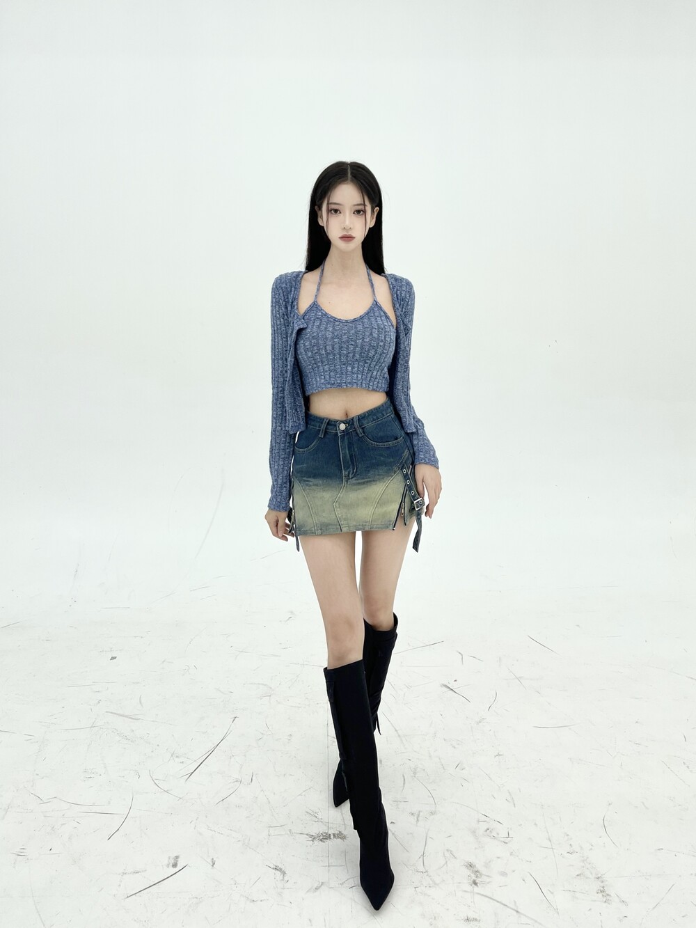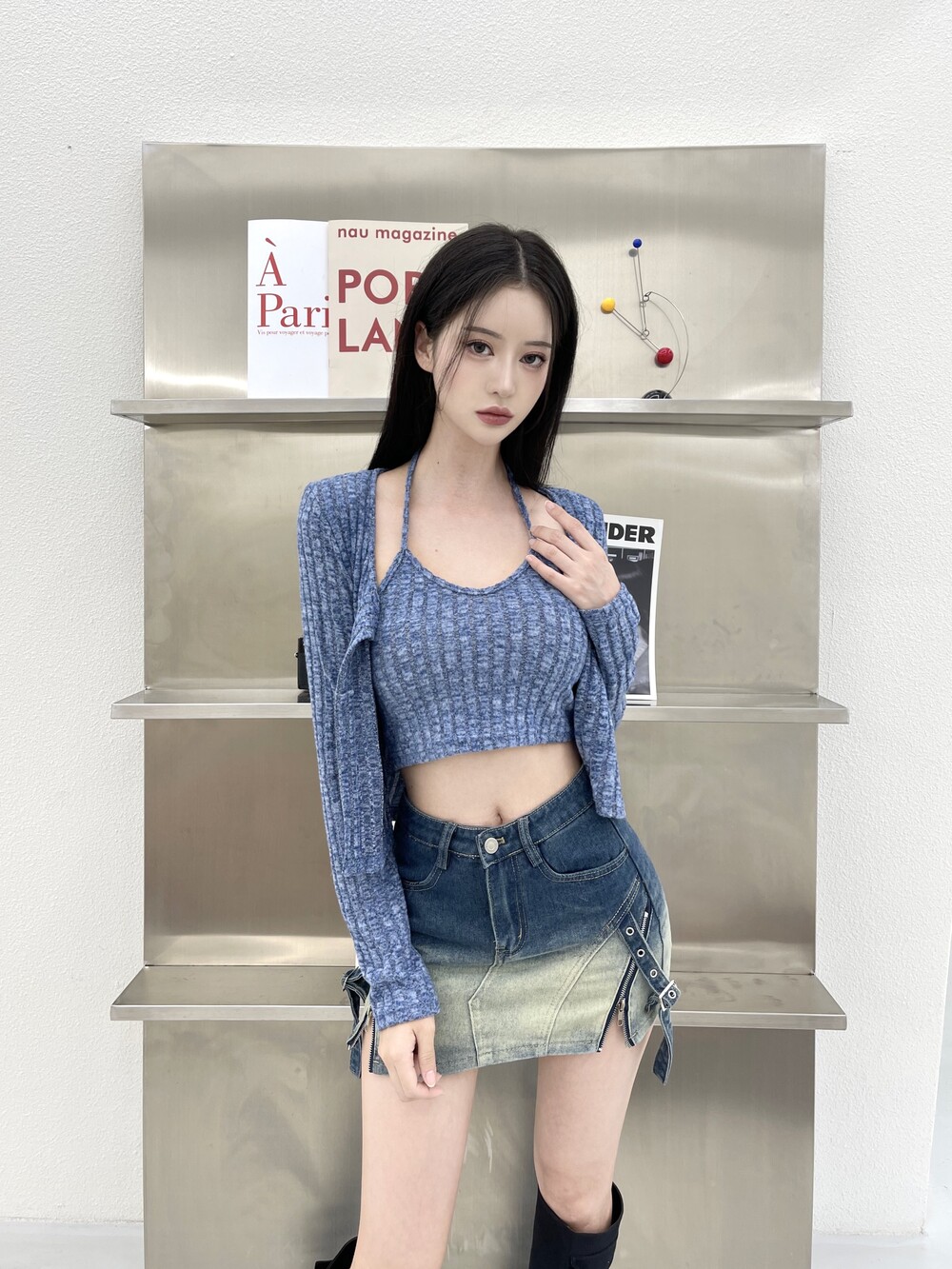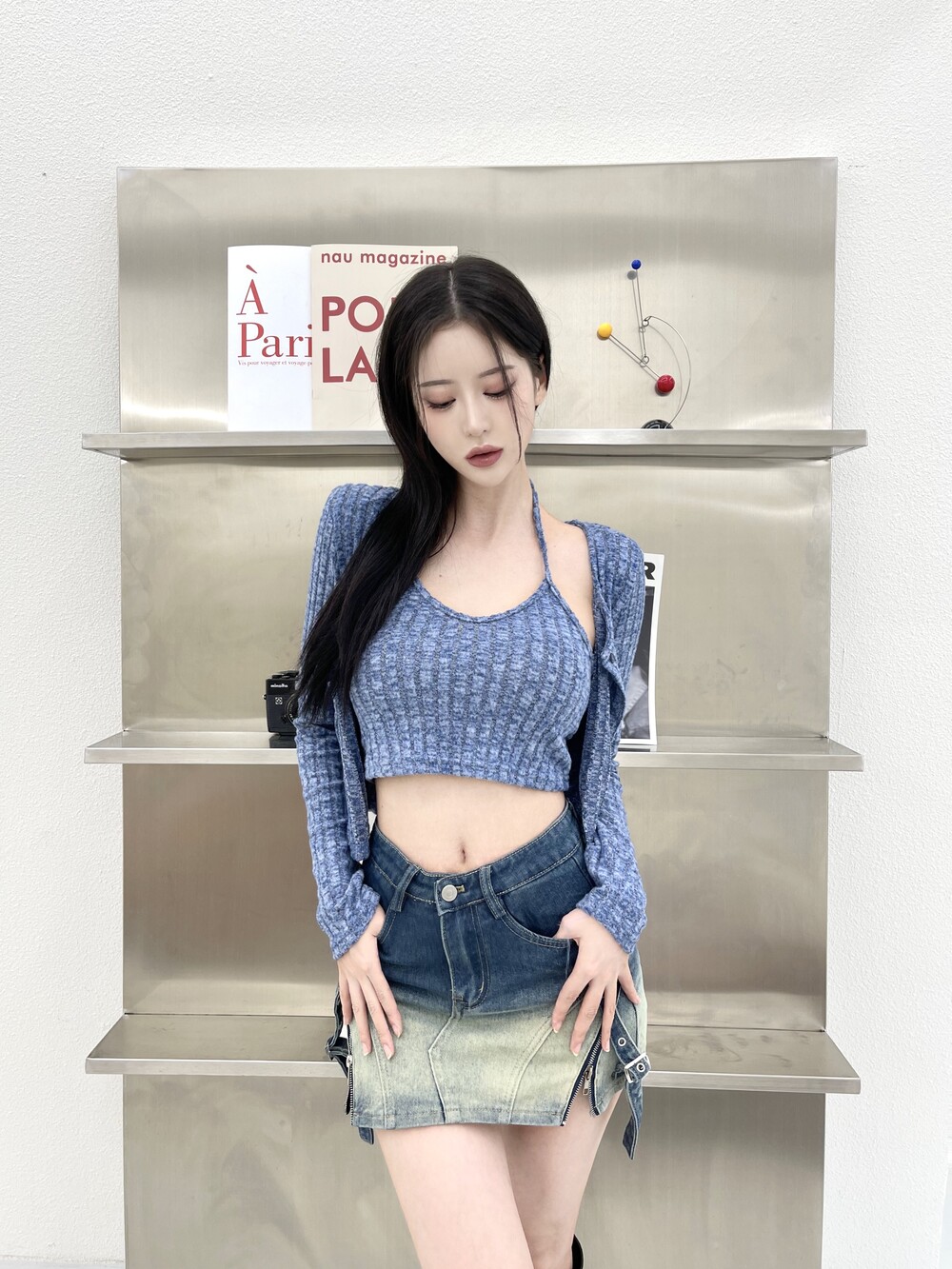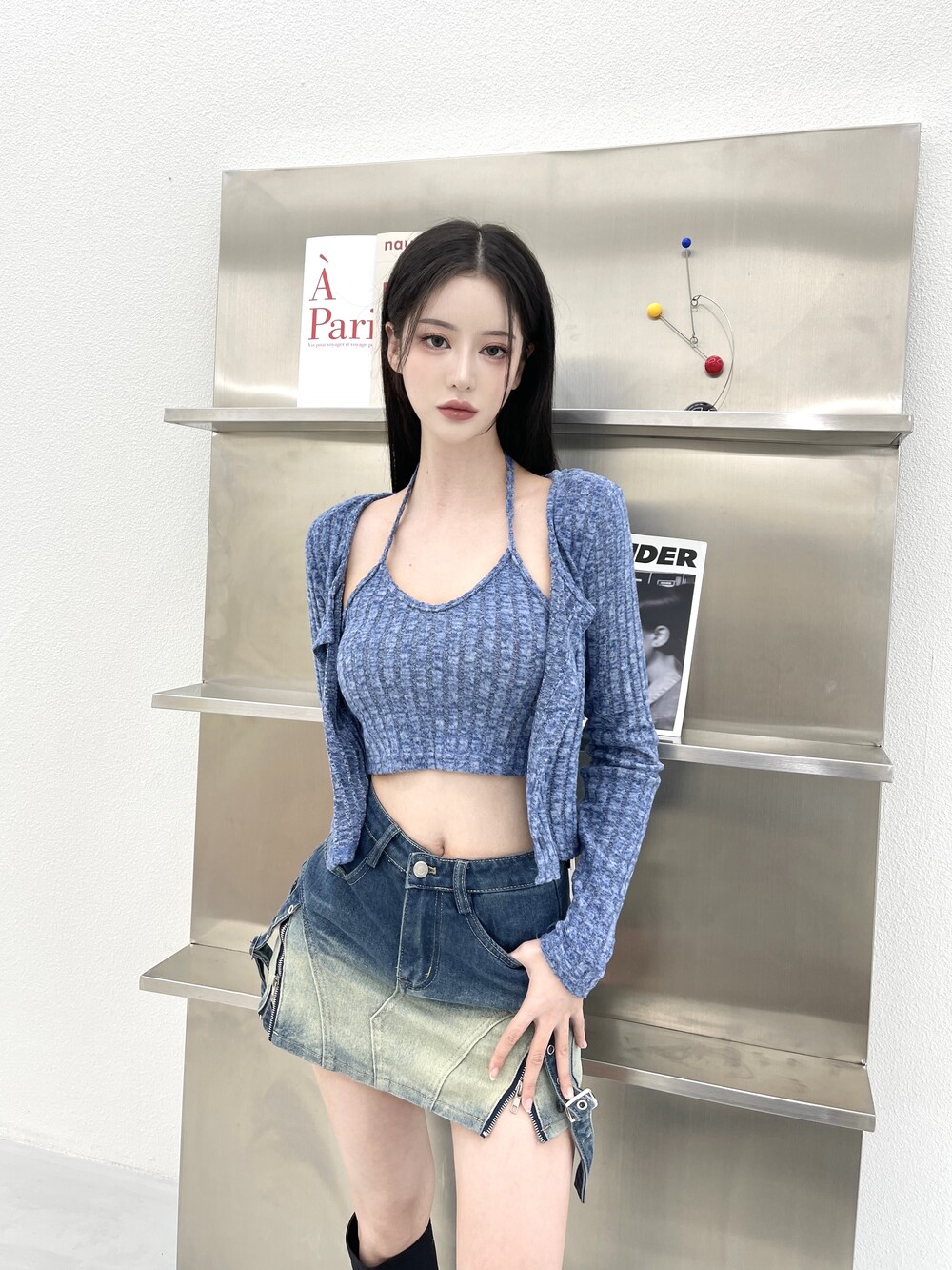 유니크한 무드의 골지 스트랩 탑 - 가디건 세트