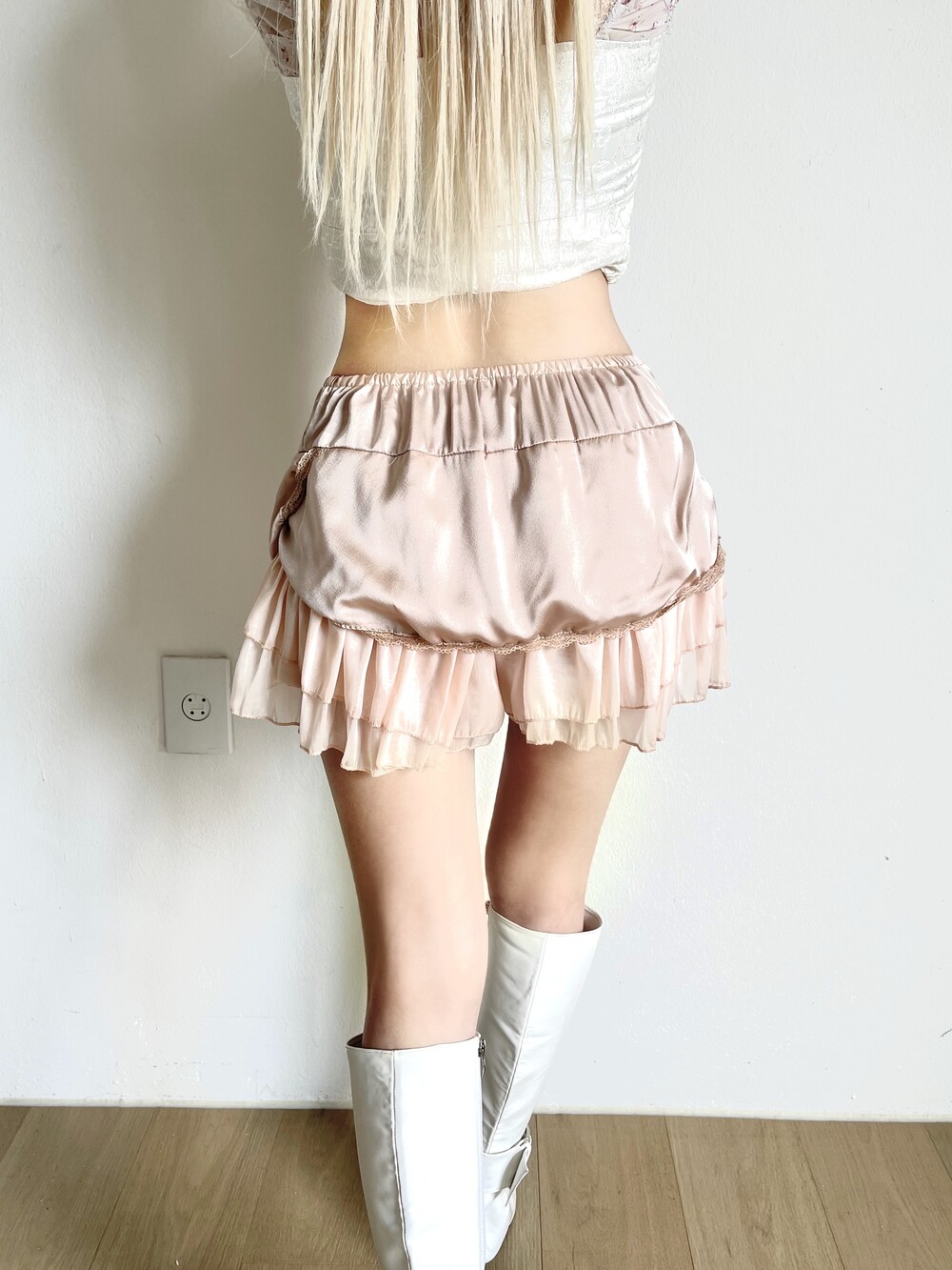 밑단 레이스가 트리밍된 새틴 스커트가 레이어드 된 듯,