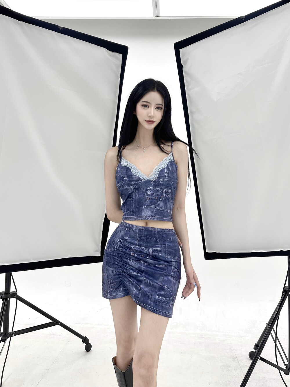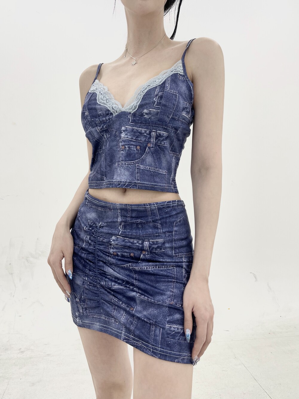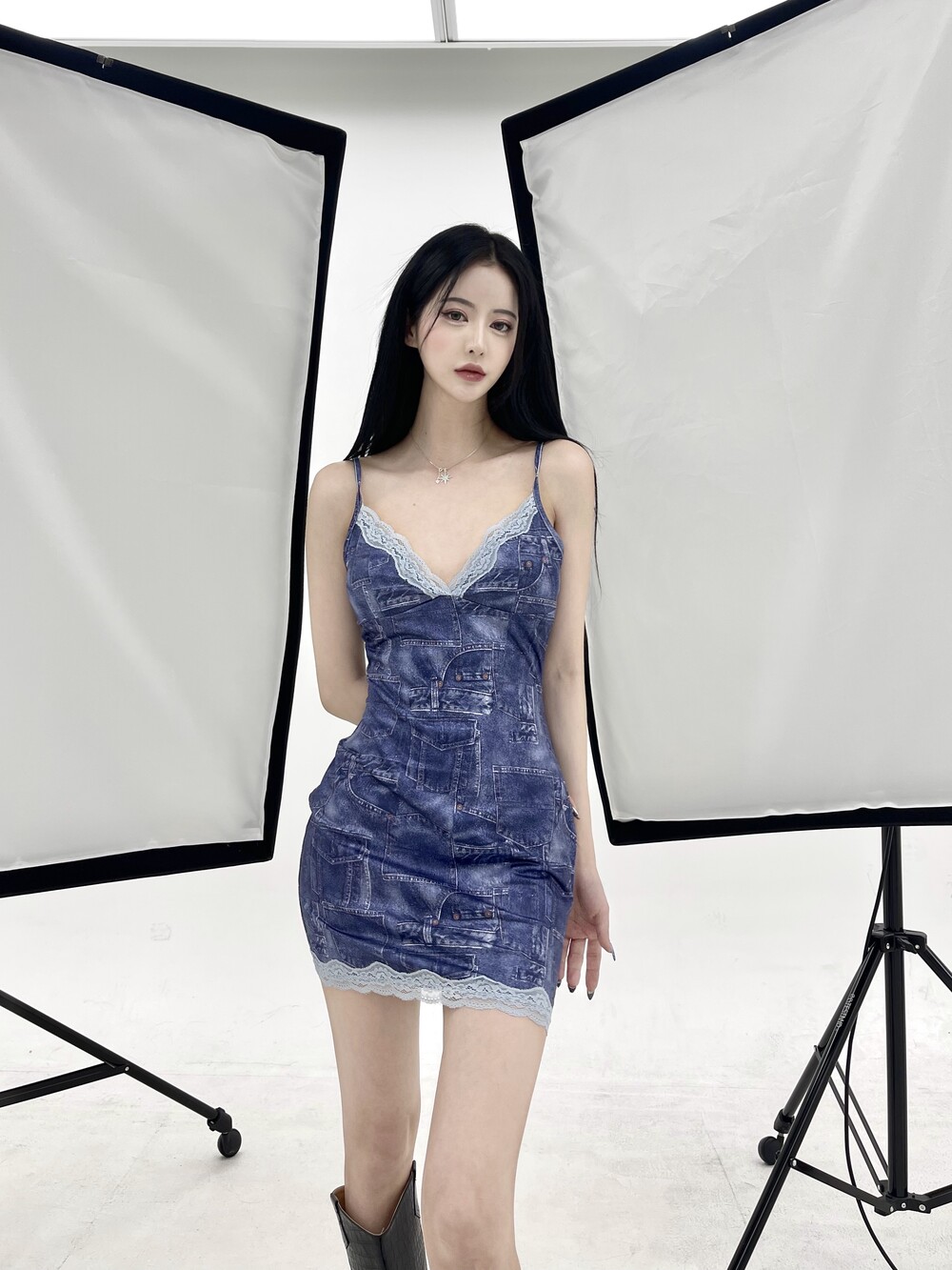 데님 포켓 프린팅 레이스 원피스 / 투피스