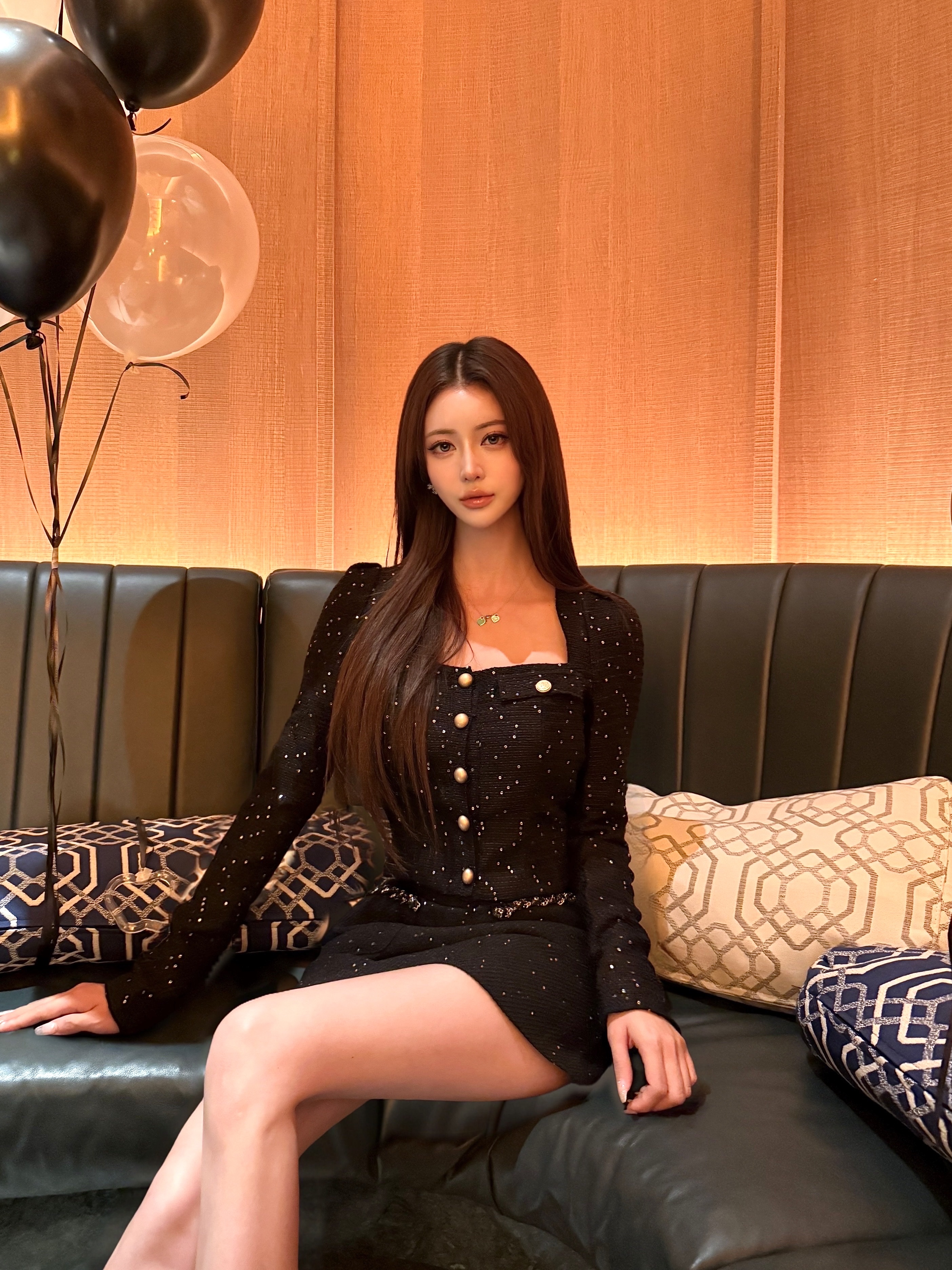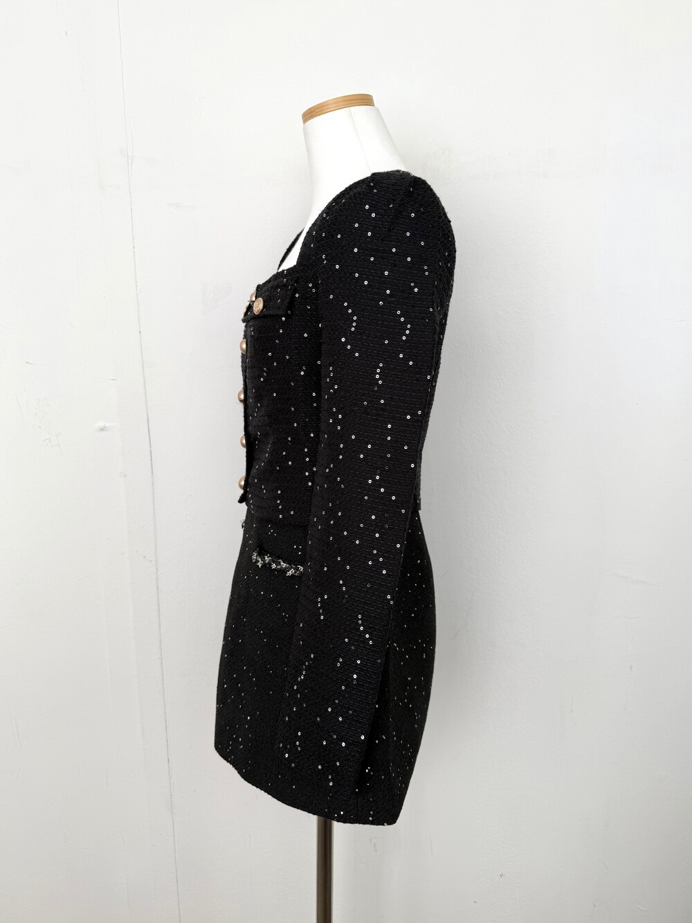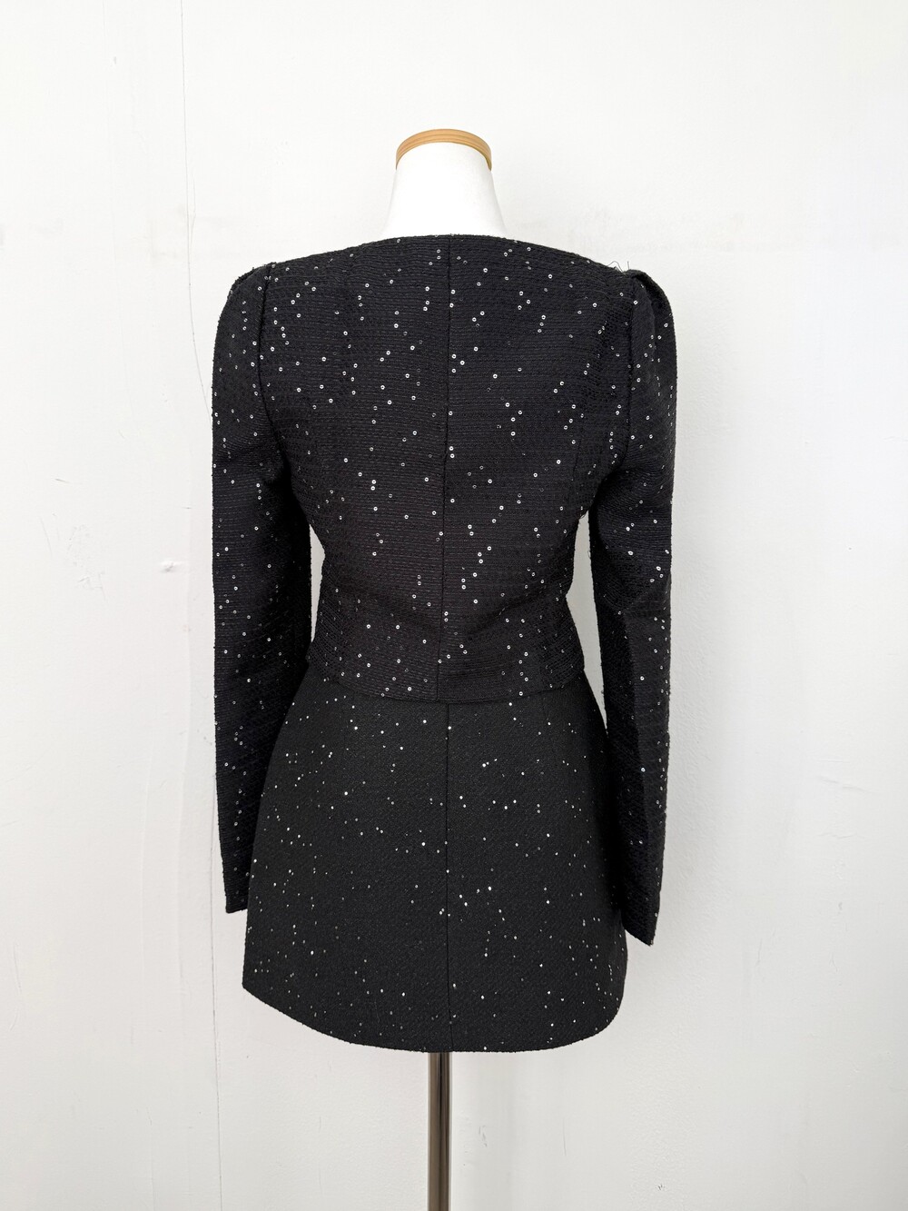 블랙 트위드와 골드 버튼이 돋보이는 탑입니다.