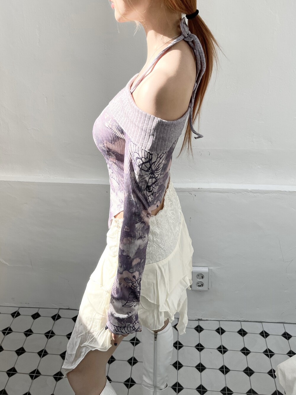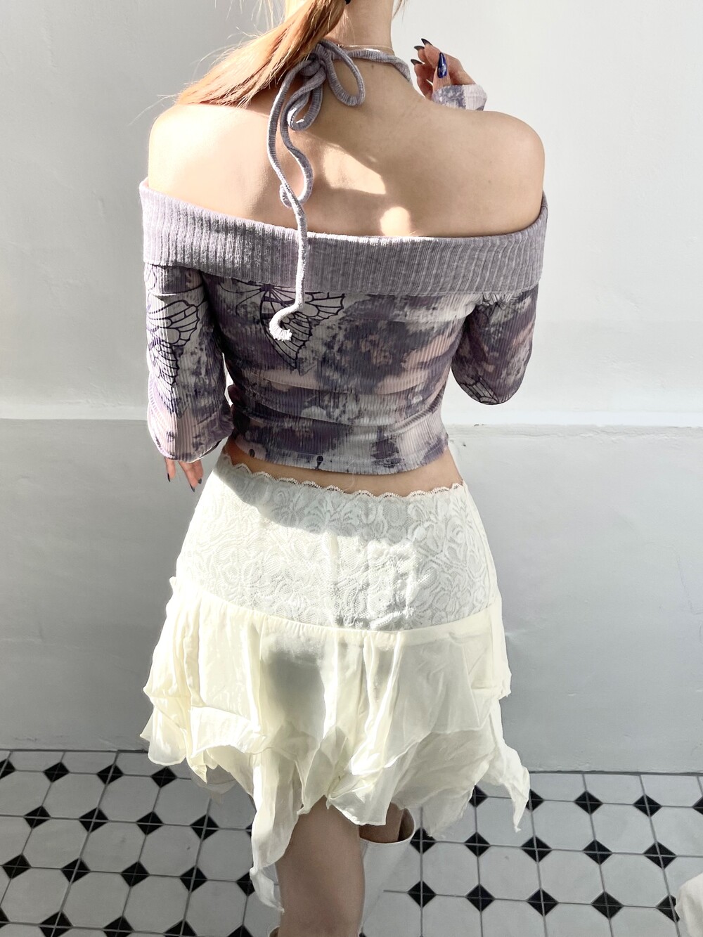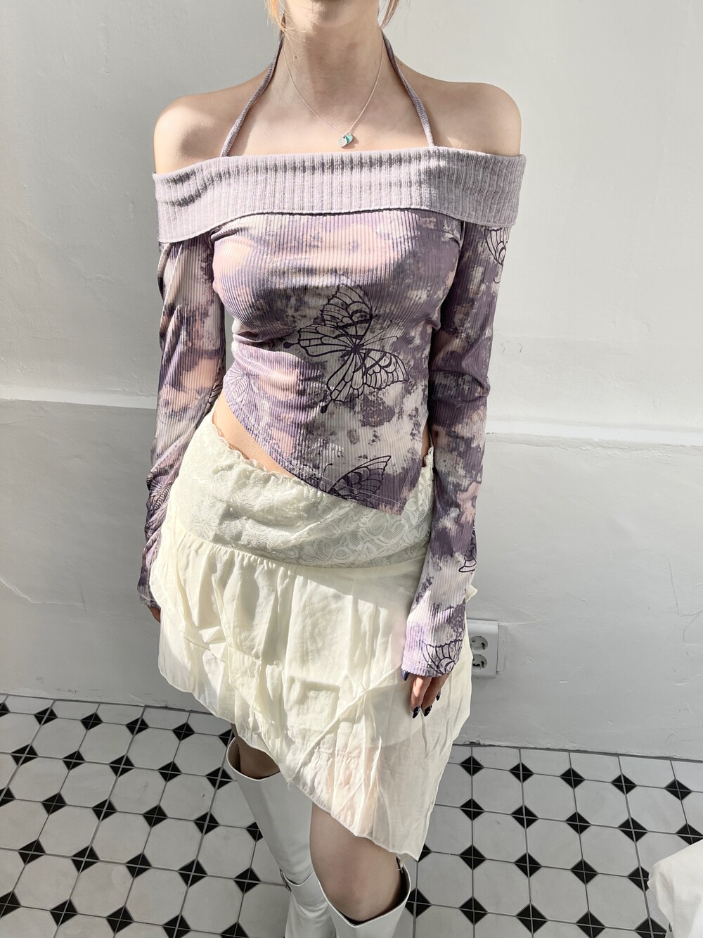 버터플라이 프린팅 오프숄더 홀터 티셔츠