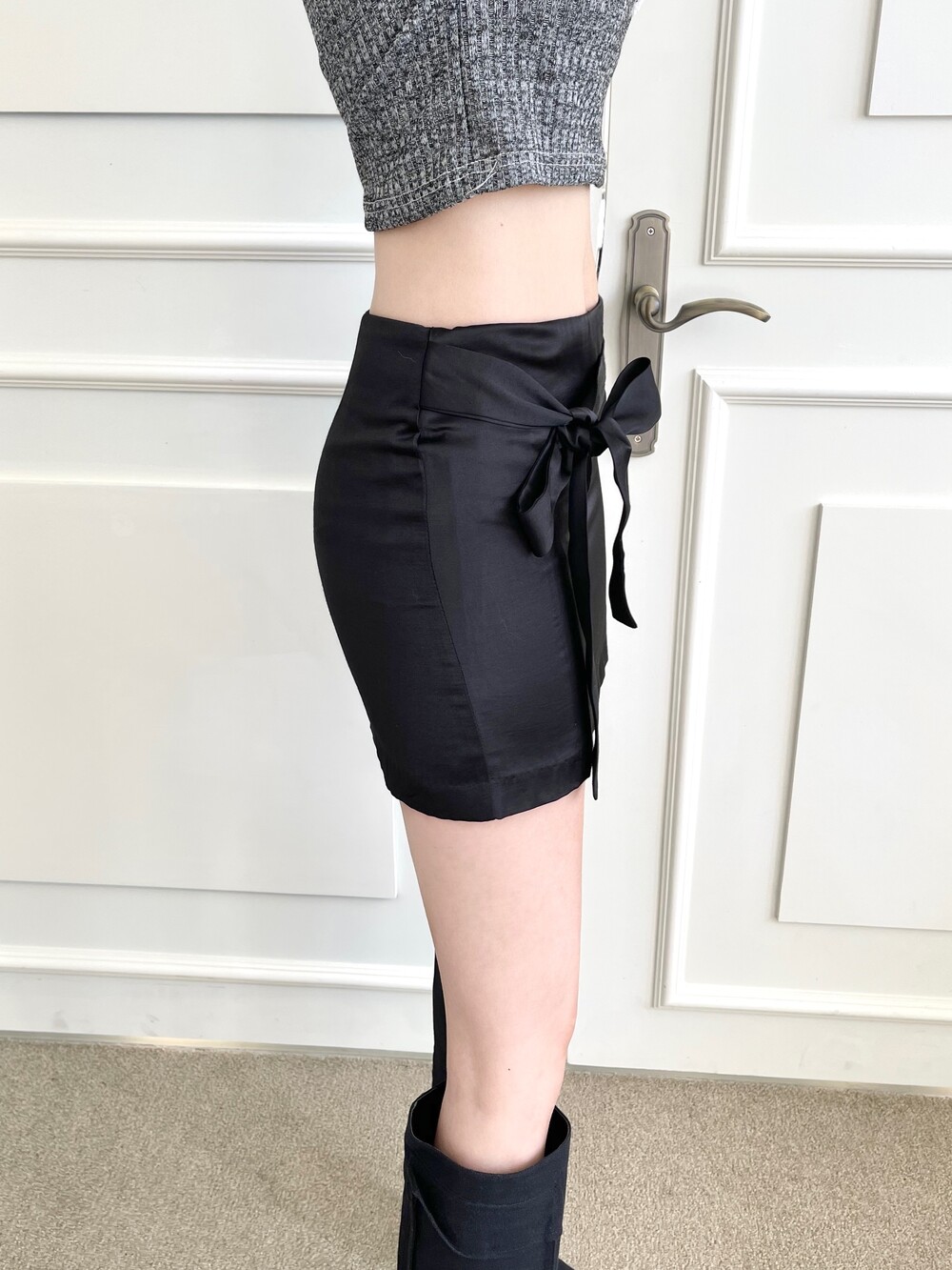 스트랩 리본 미니 새틴 스커트