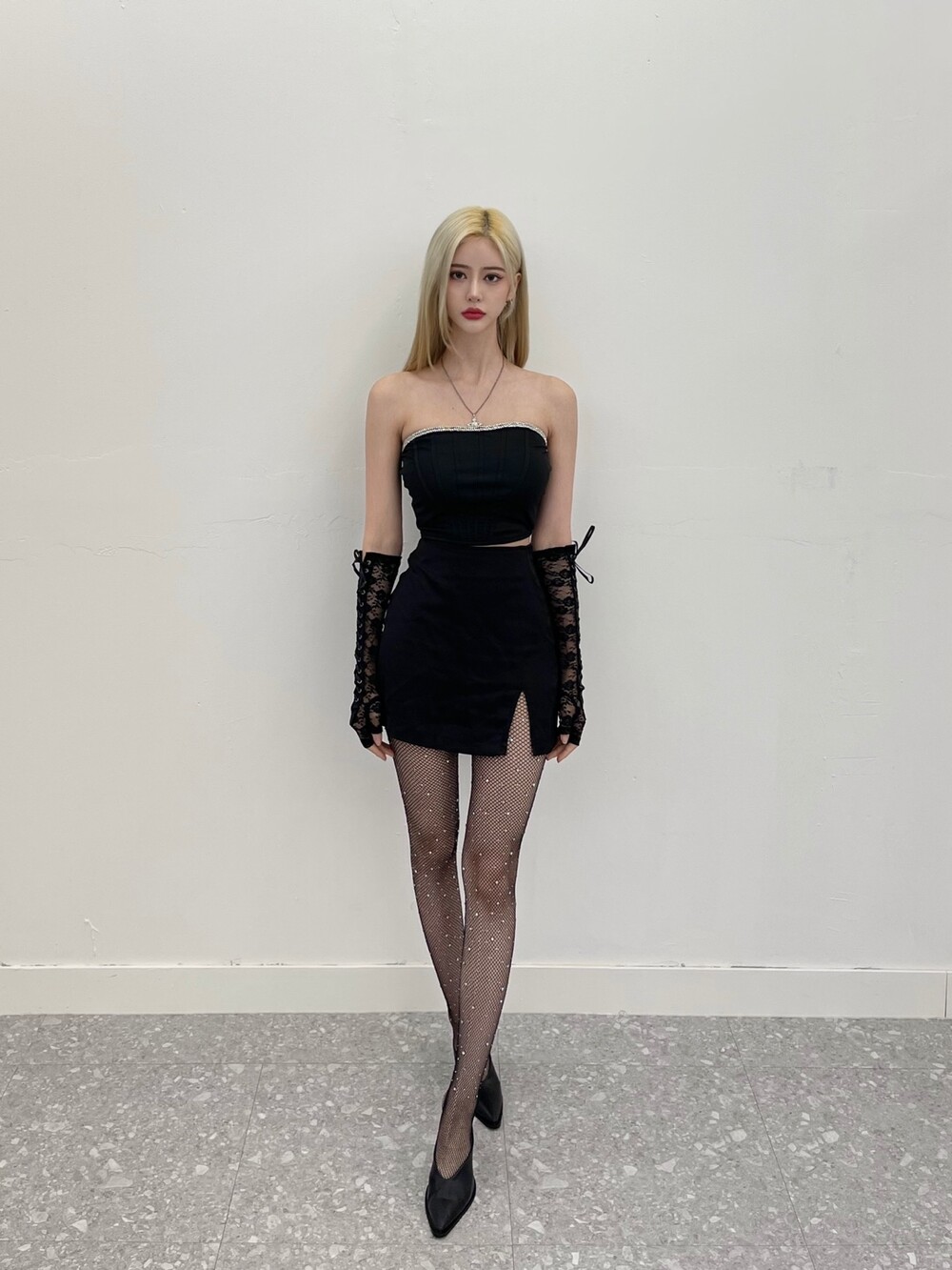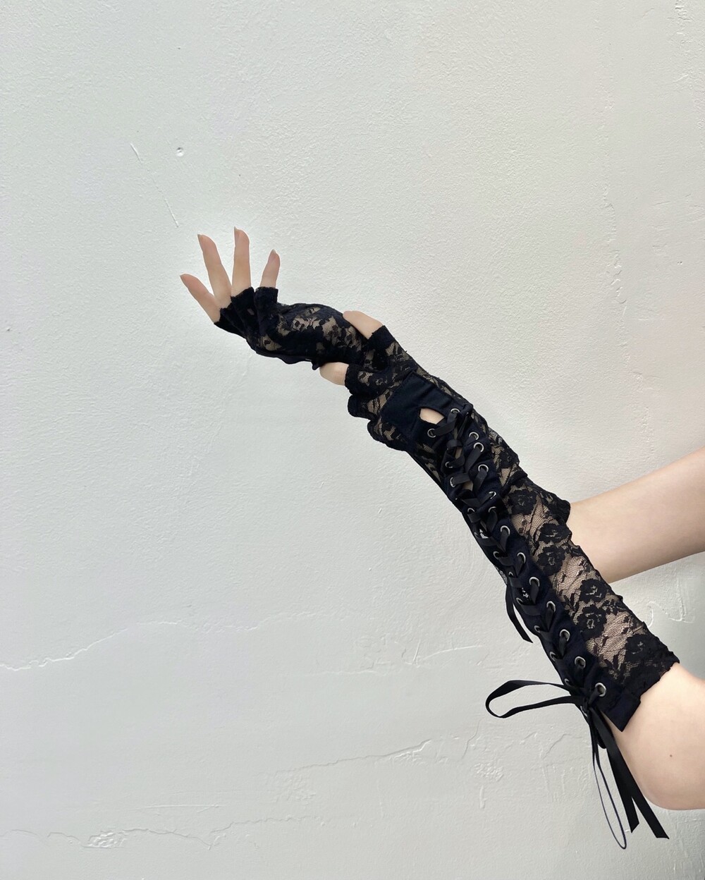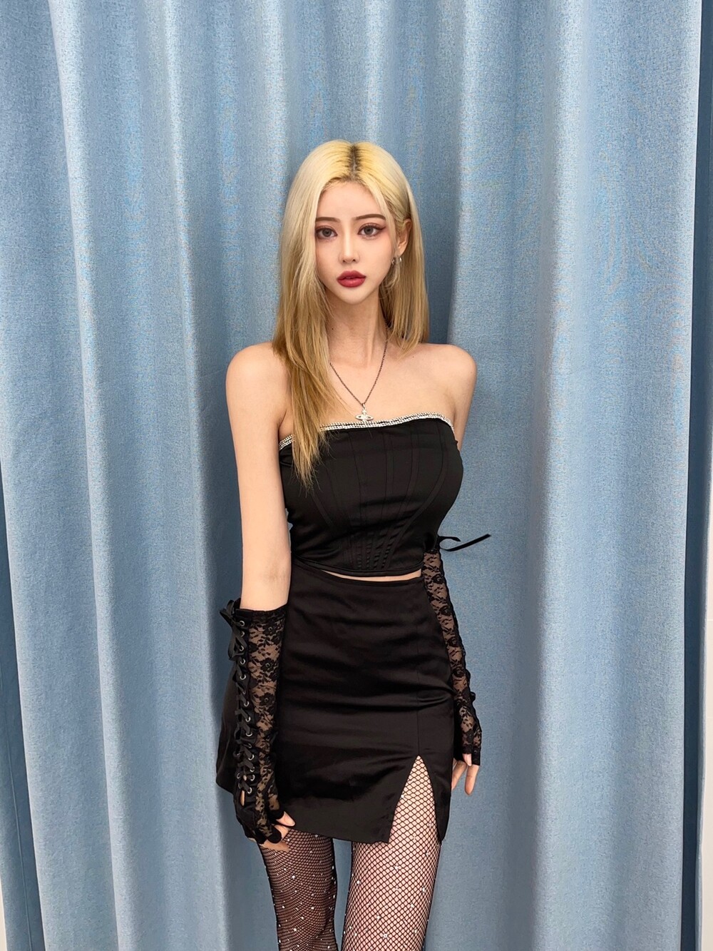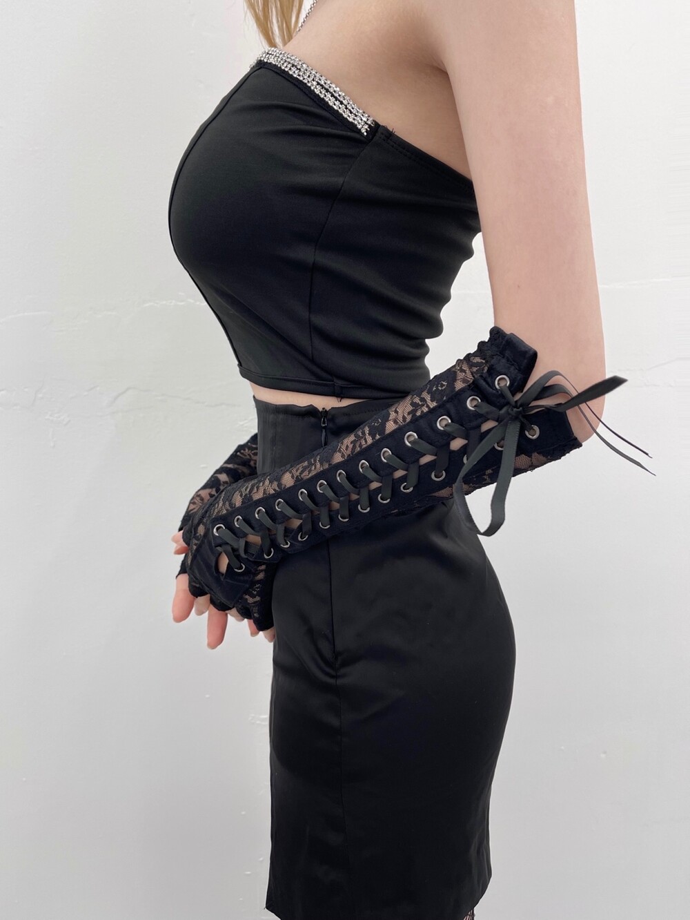 플라워 자수의 레이스 원단에 코르셋으로 둘레조절이 자유로운 아이템