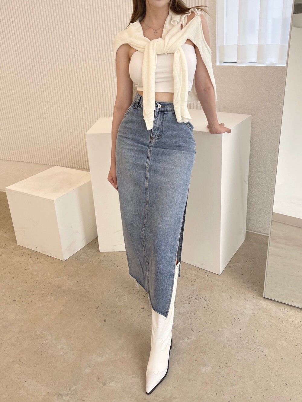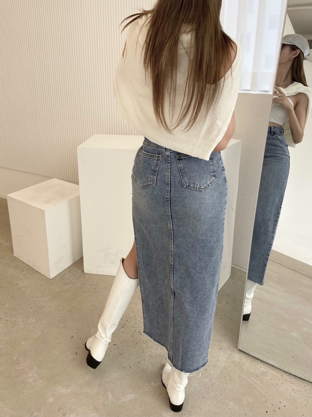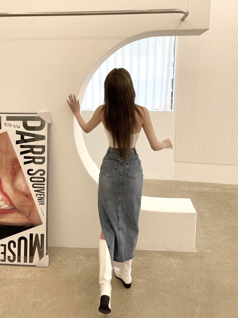 딥한 사이드 트임 포인트의 롱 데님 스커트