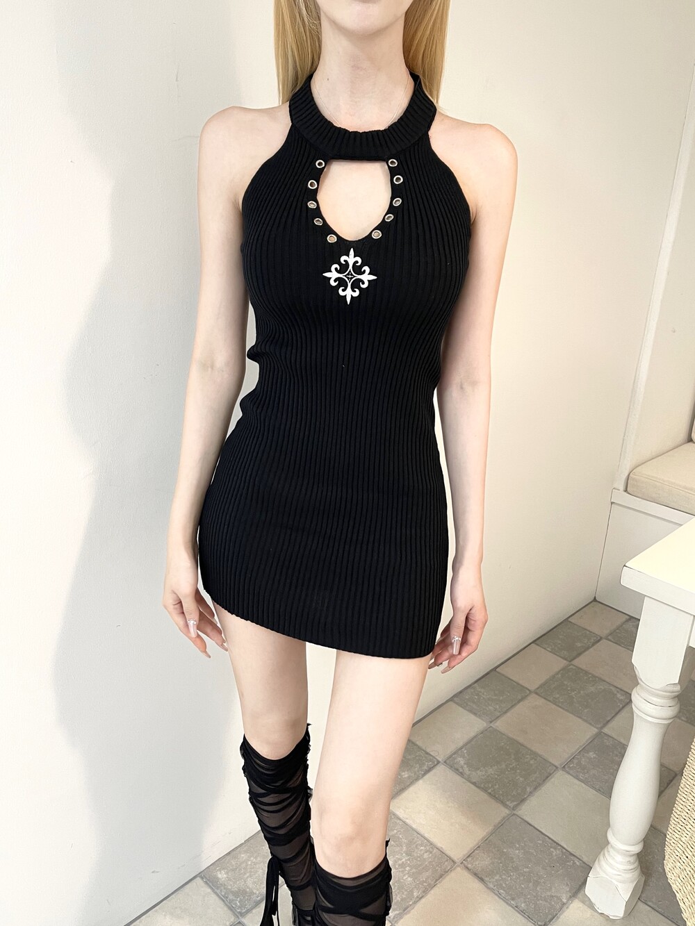 니팅 골지 아일렛 홀 자수 미니 원피스